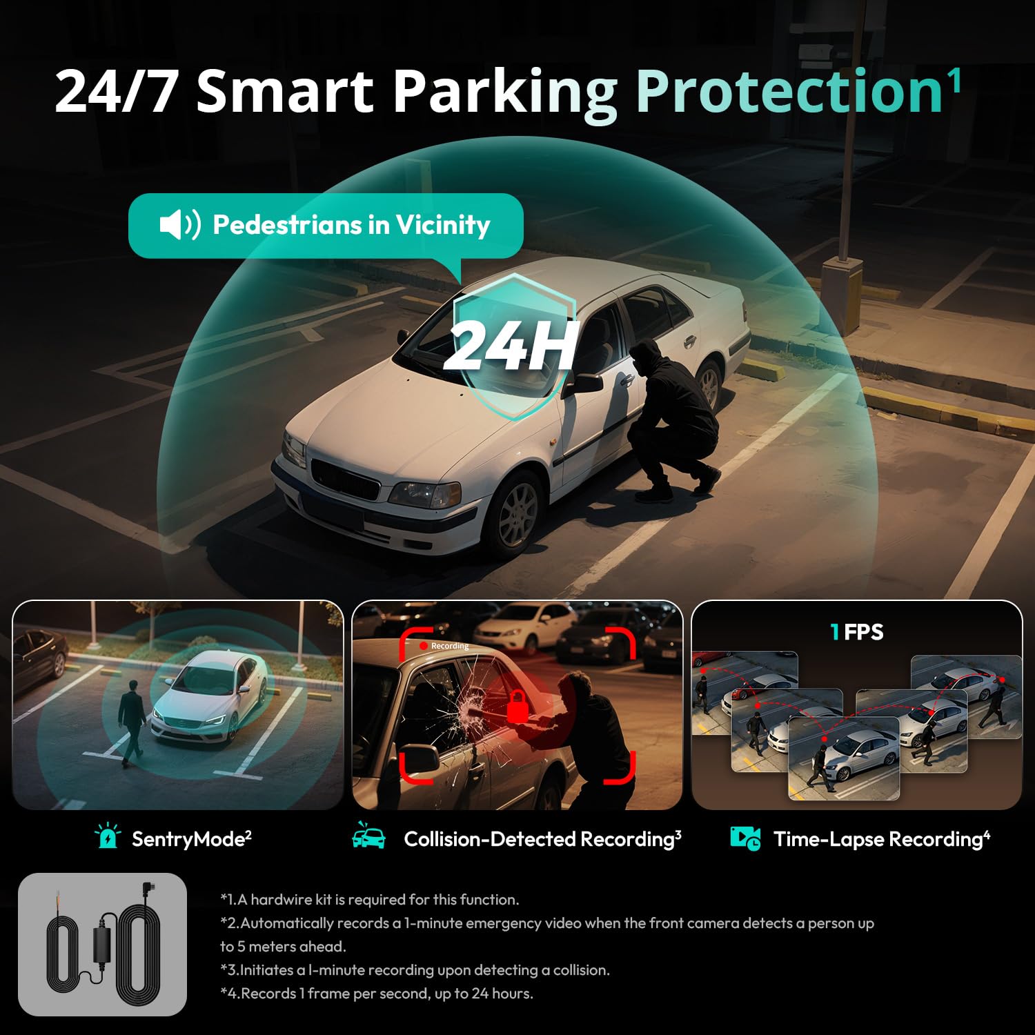 【24/7 Parking Mode】 G980H 4 channel dash cam offers three modes (requires hardwire kit): ①Time Lapse Recording: Continuously records at 1 frame per second for efficient uninterrupted surveillance.②Sentry Mode: Automatically records a 1-minute emergency video when movement is detected within 16 feet.③Collision Detection: Locks and saves a 1-minute crucial video upon detecting a collision ensuring you have the evidence you need.