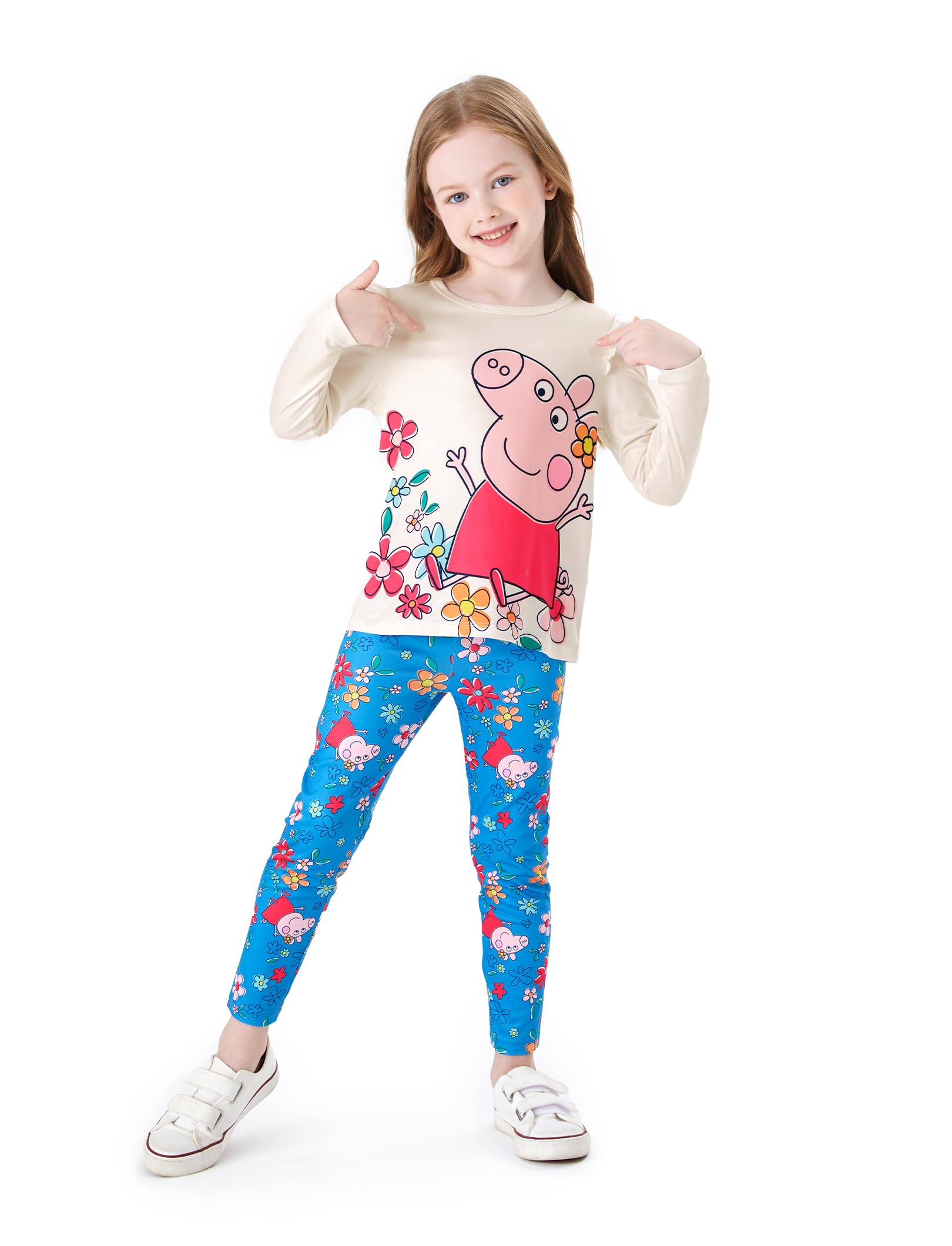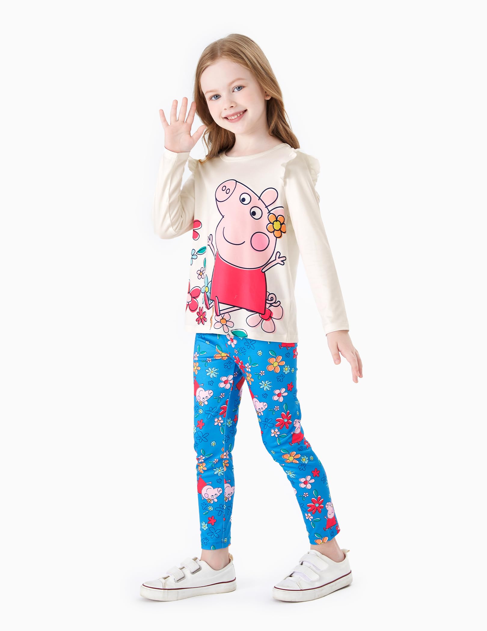 Unique Design:This is a white pant set for toddler girls with cute Peppa Pig and bright floral patterns. The pant is blue and decorated with multi-colored flowers and Peppa Pig patterns. The overall design is cute and lively.
