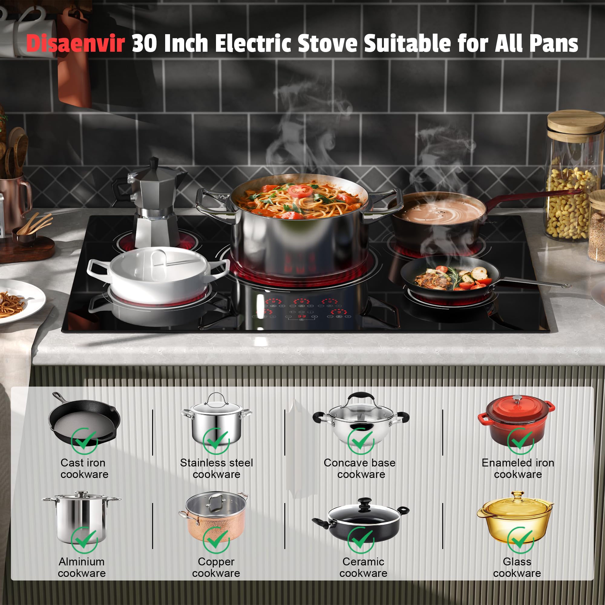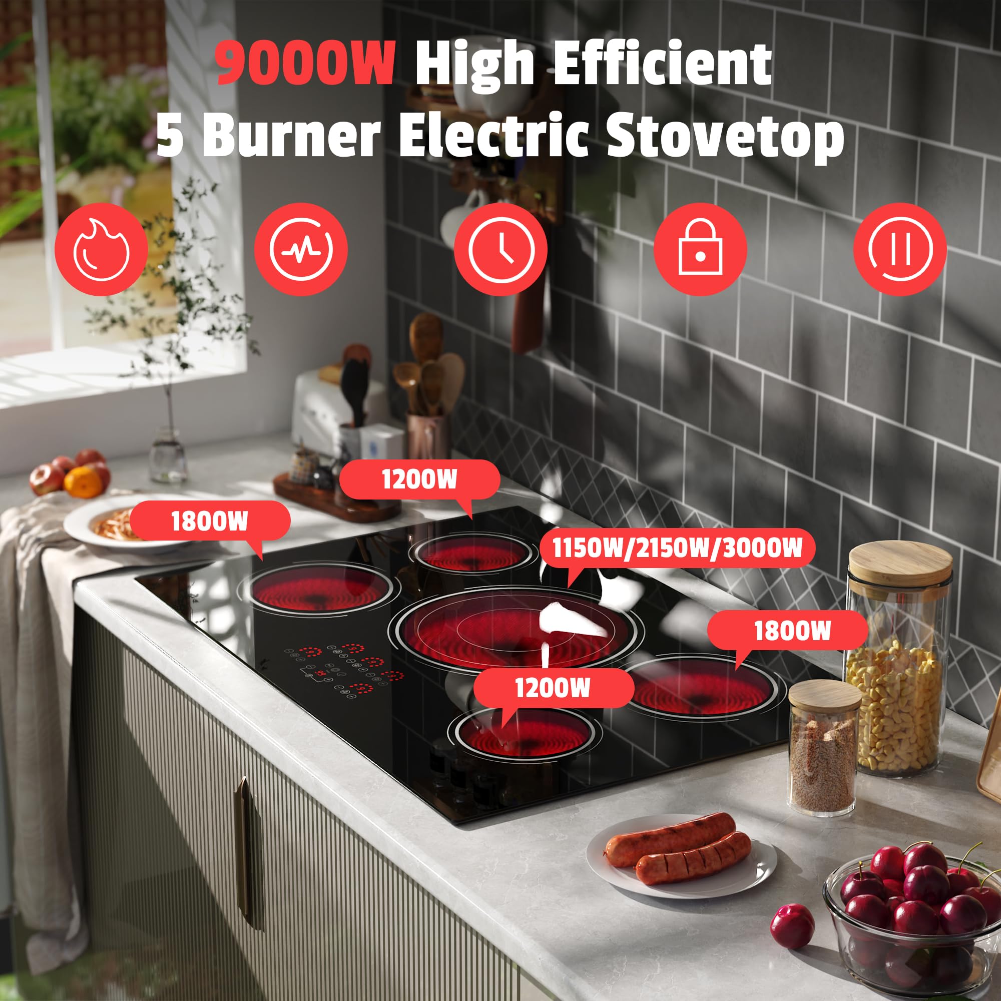 Disaenvir 30 Inch Electric Cooktop - 9000W Powerful 5 Burner Electric Stovetop, 220V Built-in Ceramic Stove 30 Inches with Triple Ring, Timer, Safety Lock, Pause, 220V-240V Hard Wired (No Plug)