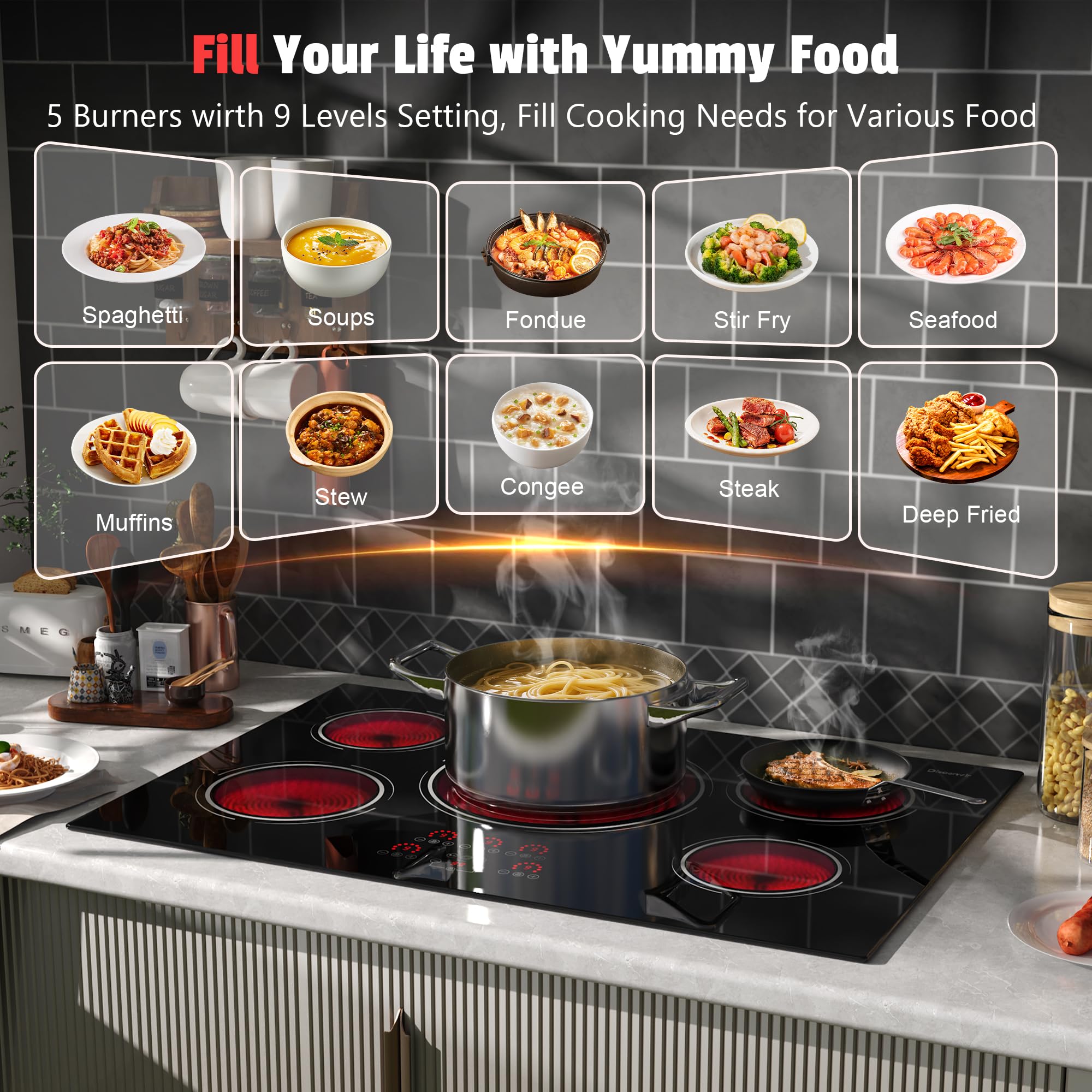🚂| 9000W Powerful and Efficient Performance | Disaenvir 30-inch electric cooktop is designed to deliver exceptional cooking efficiency with a total power output of 9000 (1800W+1200W+3000W+1800W+1200W) watts. The high wattage ensures that the cooktop heats up quickly, allowing you to boil water, sauté vegetables, or sear meats in a fraction of the time compared to lower-powered models.