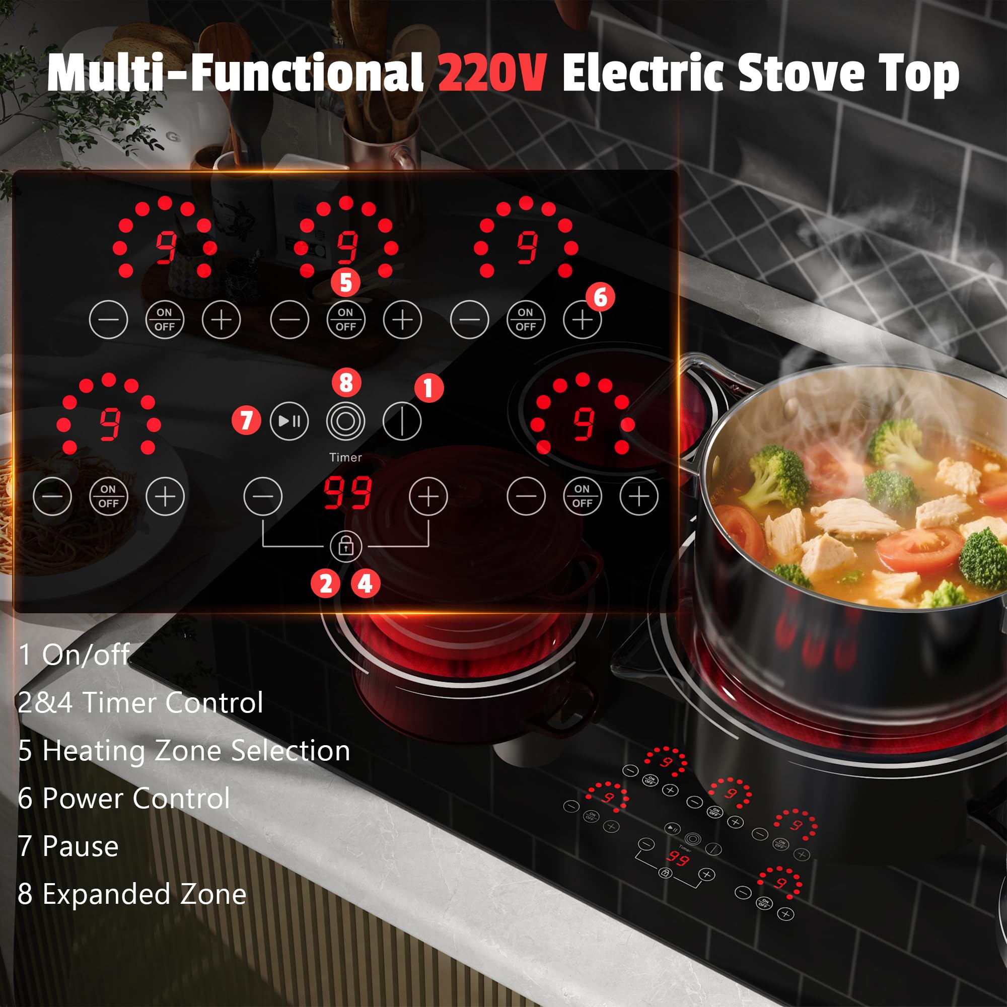 🚤| Universal Cookware Compatibility | Electric ceramic cooktop are more convenient to use than induction cookers. You can use any material of pot on the electric ceramic cooktop 5 burners , such as iron, stainless steel, copper, ceramics, glass, etc. Unlike induction cooktop, which require the use of an iron pot. Moreover, the electric ceramic stove has no electromagnetic radiation and is harmless to the human body. Note: Plug is NOT included in the package.