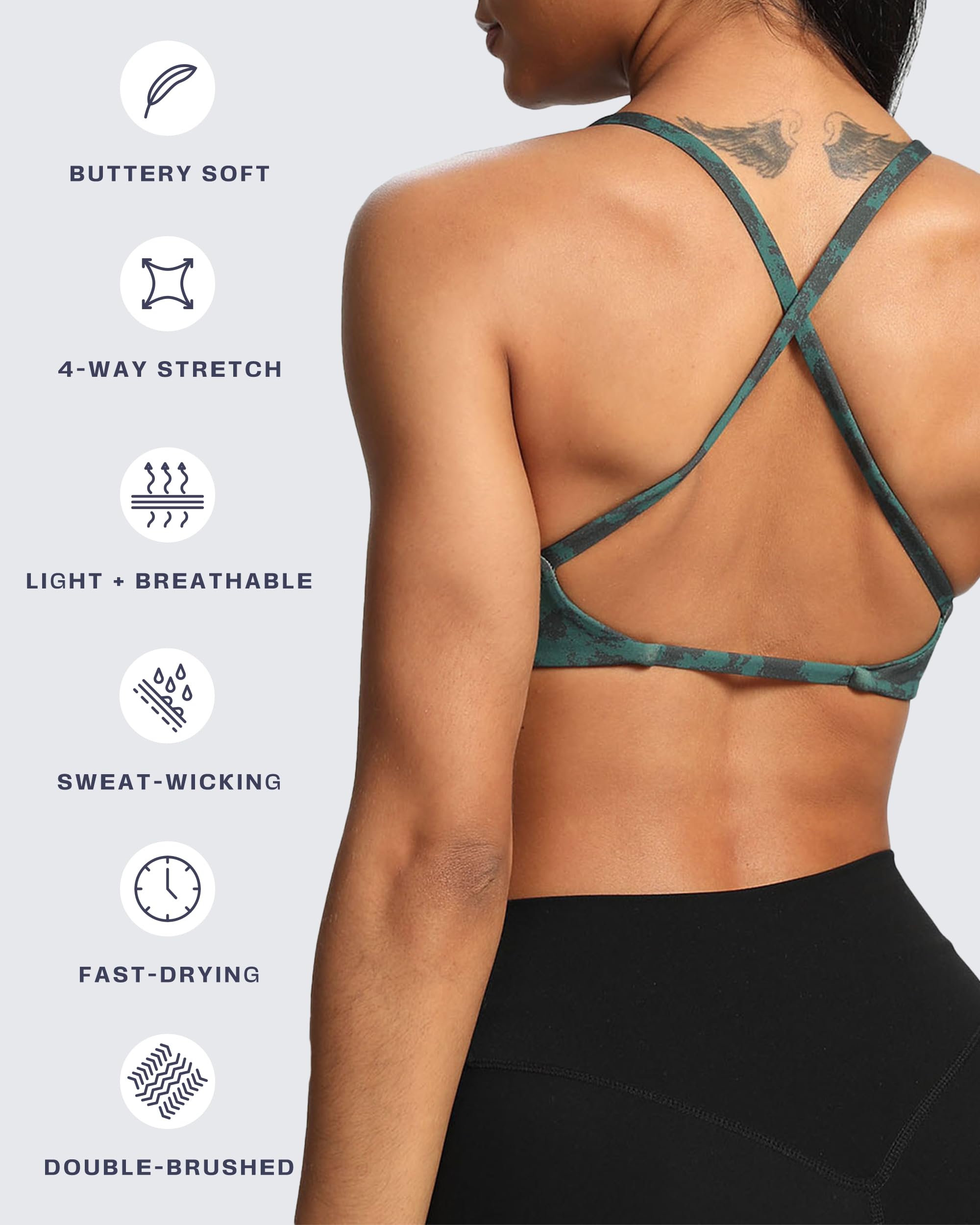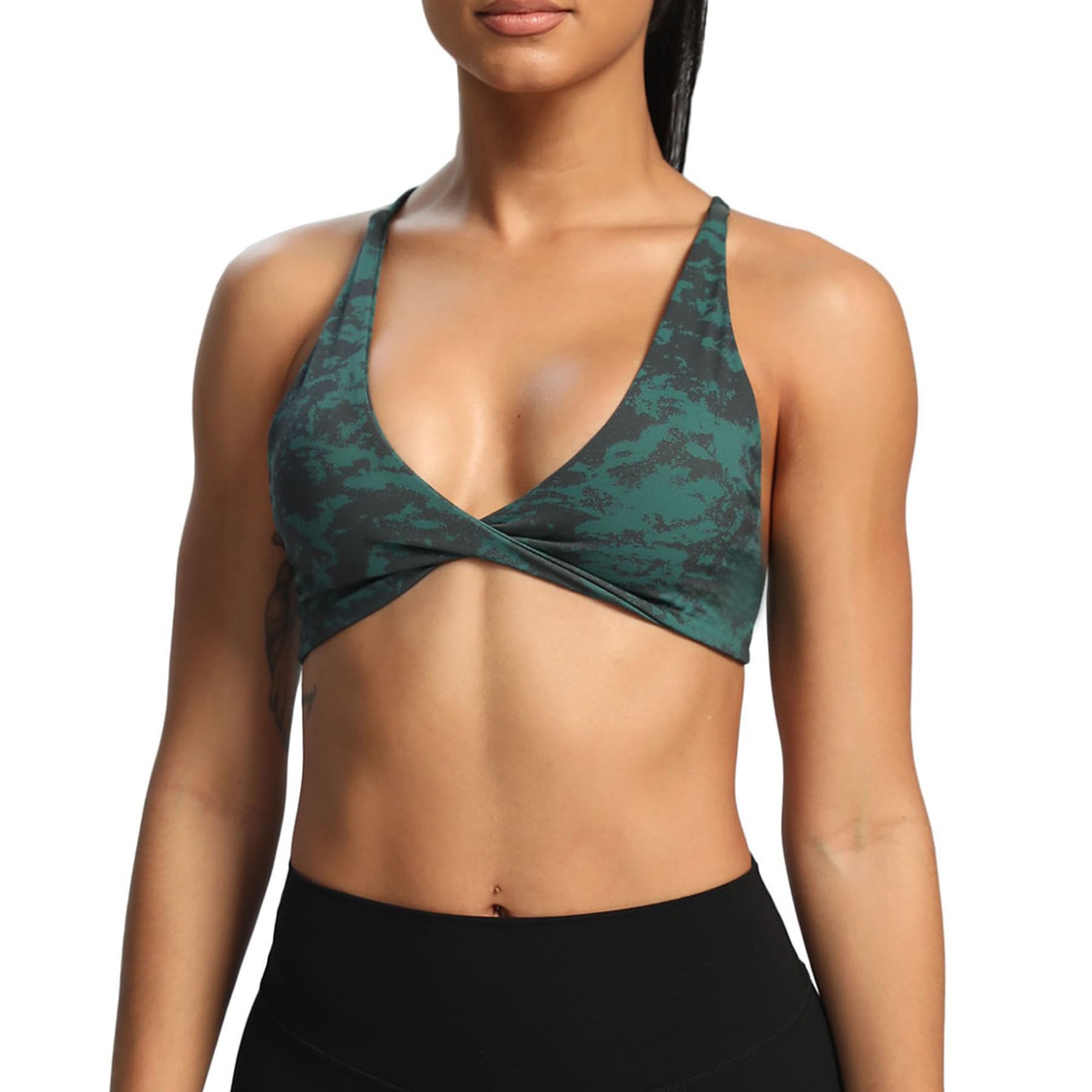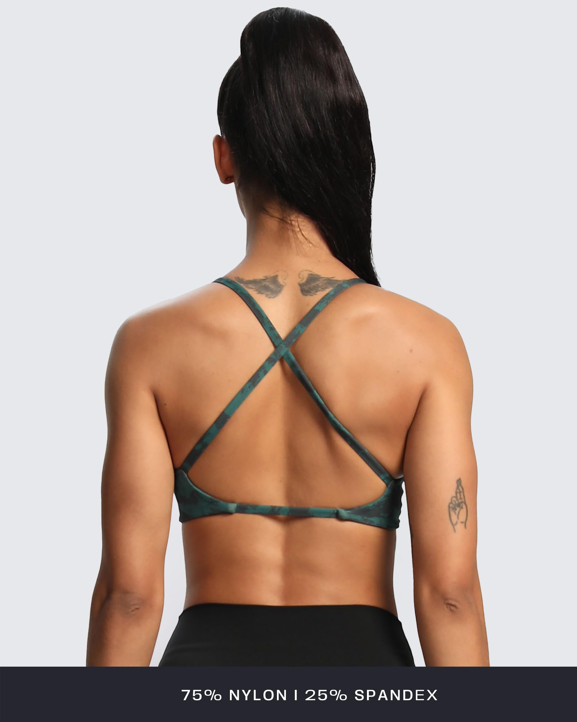 The Sienna twist womens sports bra featuring thin crossed back straps and padding, despite small straps, it doesn’t bite into your traps and cause neck pain