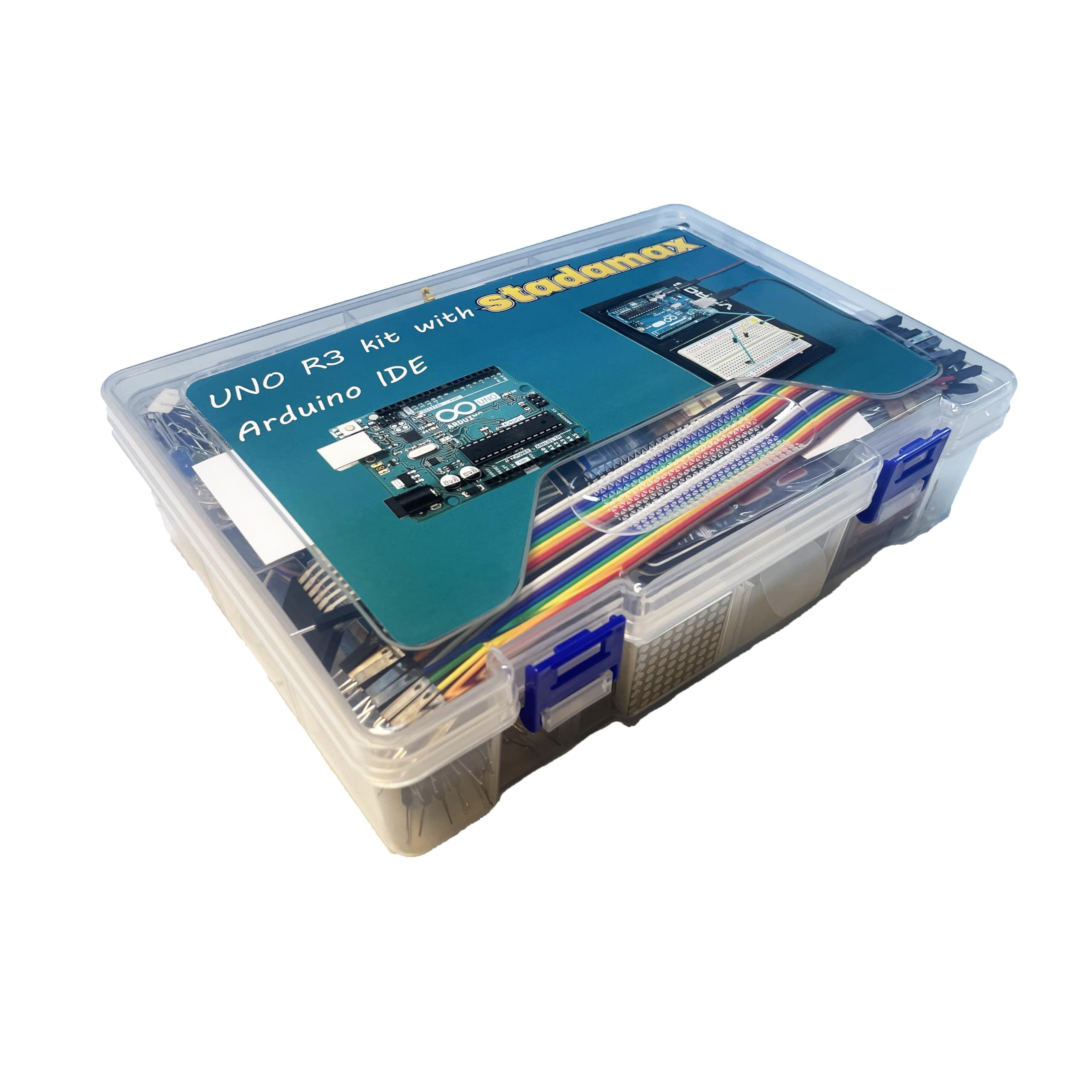 The super starter kit includes UNO R3 board (Official original 1:1 clone), LCD, sensors, actuators, LEDs, breadboard, and more in a nice plastic box package.