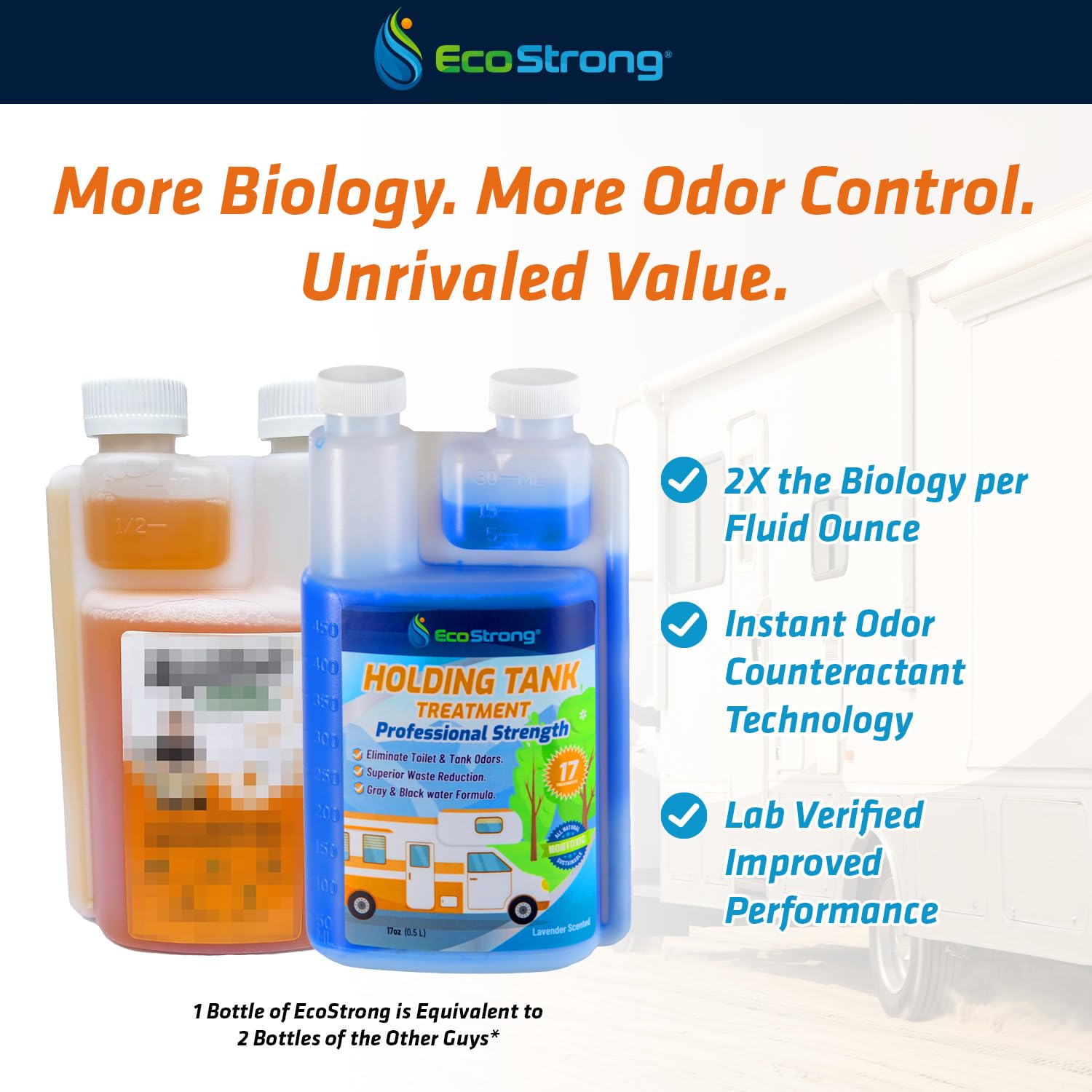 Waste Digester: This enzyme-based black tank cleaner liquifies RV toilet paper and organic build-up. EcoStrong’s RV Toilet Treatment breaks down waste in black tanks making dumping easier.