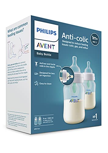 Philips Avent Anti-colic with AirFree vent bottles are designed to reduce feeding issues: such as colic, gas, and reflux. The unique AirFree vent is designed to draw air away from the nipple keeping it full of milk to avoid air ingestion. This vent also keeps the nipple full of milk even when the bottle is held horizontal, allowing for upright feeding. Feeding in an upright position can help to reduce reflux and aid in digestion. The nipple shape is designed for a secure latch for a comfortable feed. The bottle is easy to clean and assemble with few parts. The AirFree vent is only one piece and is easy to clean without any special tools. The Anti-colic bottle features a valve, integrated into the nipple, that reduces vacuum buildup and reducing air into your baby’s tummy. The Anti-colic bottle can be used with or without the AirFree vent, giving you the option based on your baby’s feeding needs. The soft silicone nipple is available in different flow rates for babies of all ages, flows 1-4. We recommend using the Philips Avent Anti-colic baby bottle with Philips Avent Anti-colic bottle nipples. Includes 2 9oz Anti-colic bottles with AirFree vent with Flow 2 nipples. SCY703/02