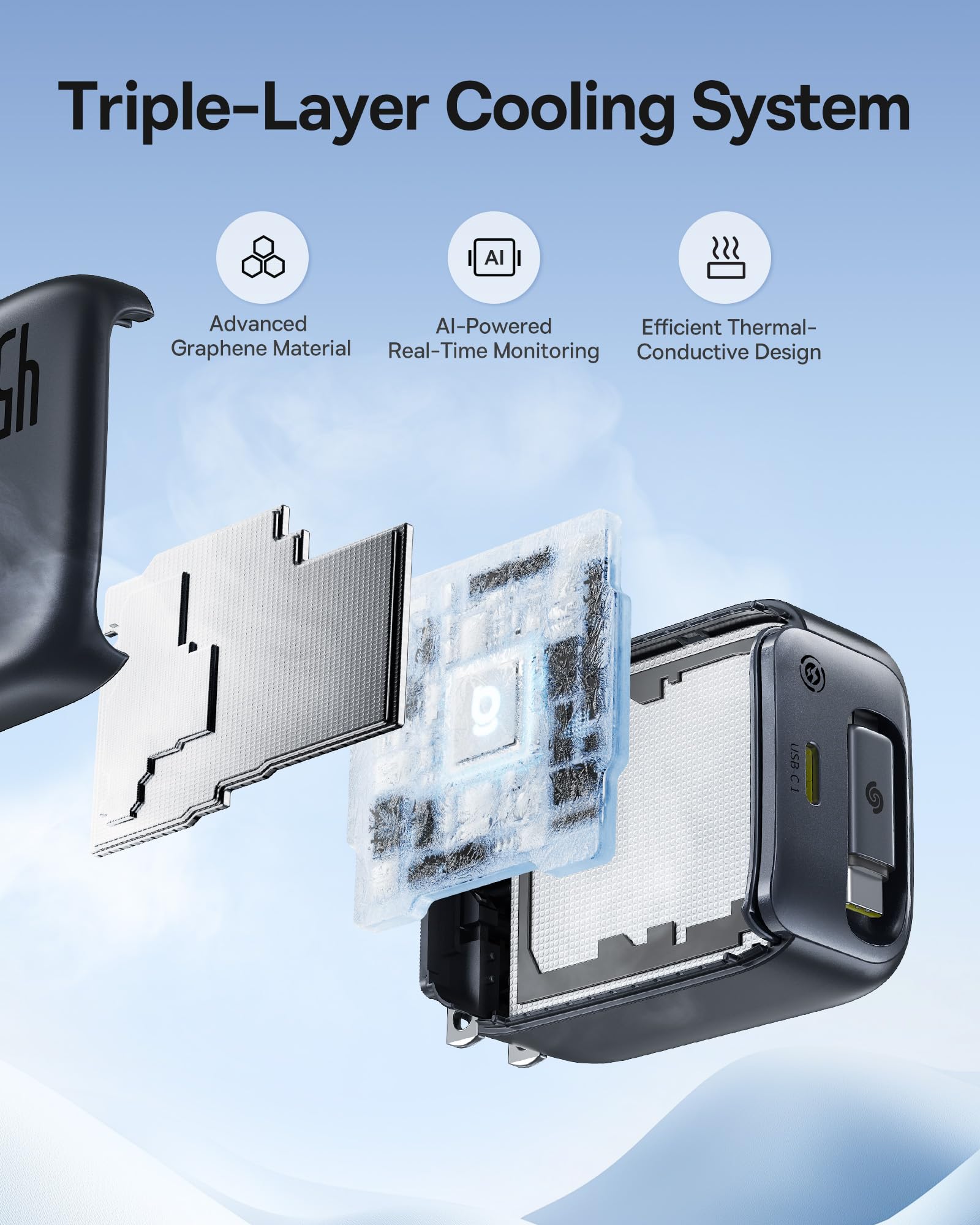Real-Time Temperature Monitoring: The integrated AI-powered BCT chip monitors temperature to ensure safe and safe charging. Moreover, the USB-C wall charger features multiple safety protections, such as short circuit protection, high-voltage protection, overcharge protection, etc. Say goodbye to overheating. Graphene absorbs heat, and 3D thermal conductive structure efficiently dissipates heat to ensure that the charger and your device won't heat up while charging so as to protect your device's battery.