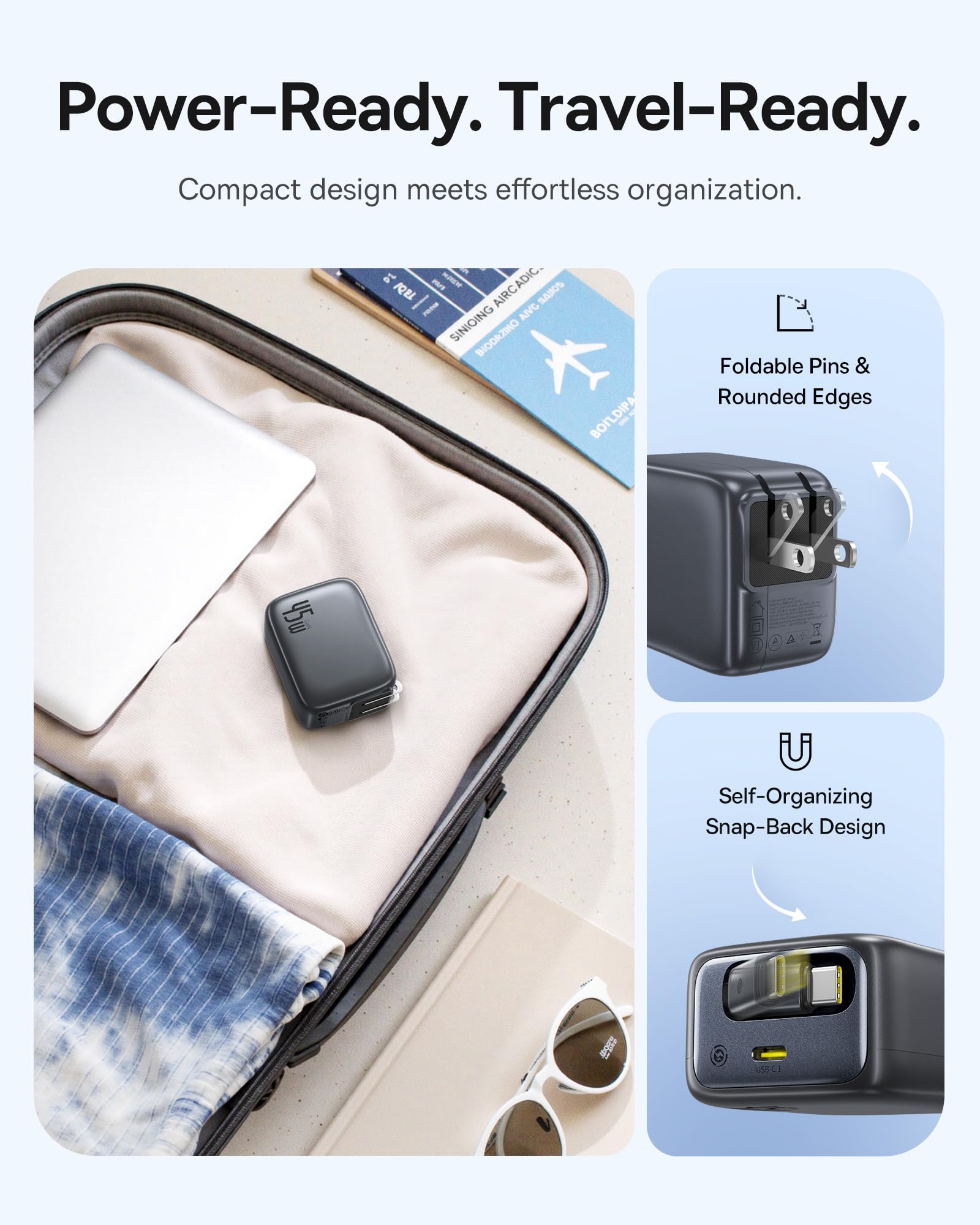 Ultra-Compact Design with Foldable Prongs: This retractable wall charger features foldable prongs that tuck away neatly, making it small enough to slip into your backpack without any hassle. The foldable plug design makes it all the more compact for easy carrying wherever you go. It makes sure that your mobile phone and other items are free from the risks of scratches when you put them in the same bag.