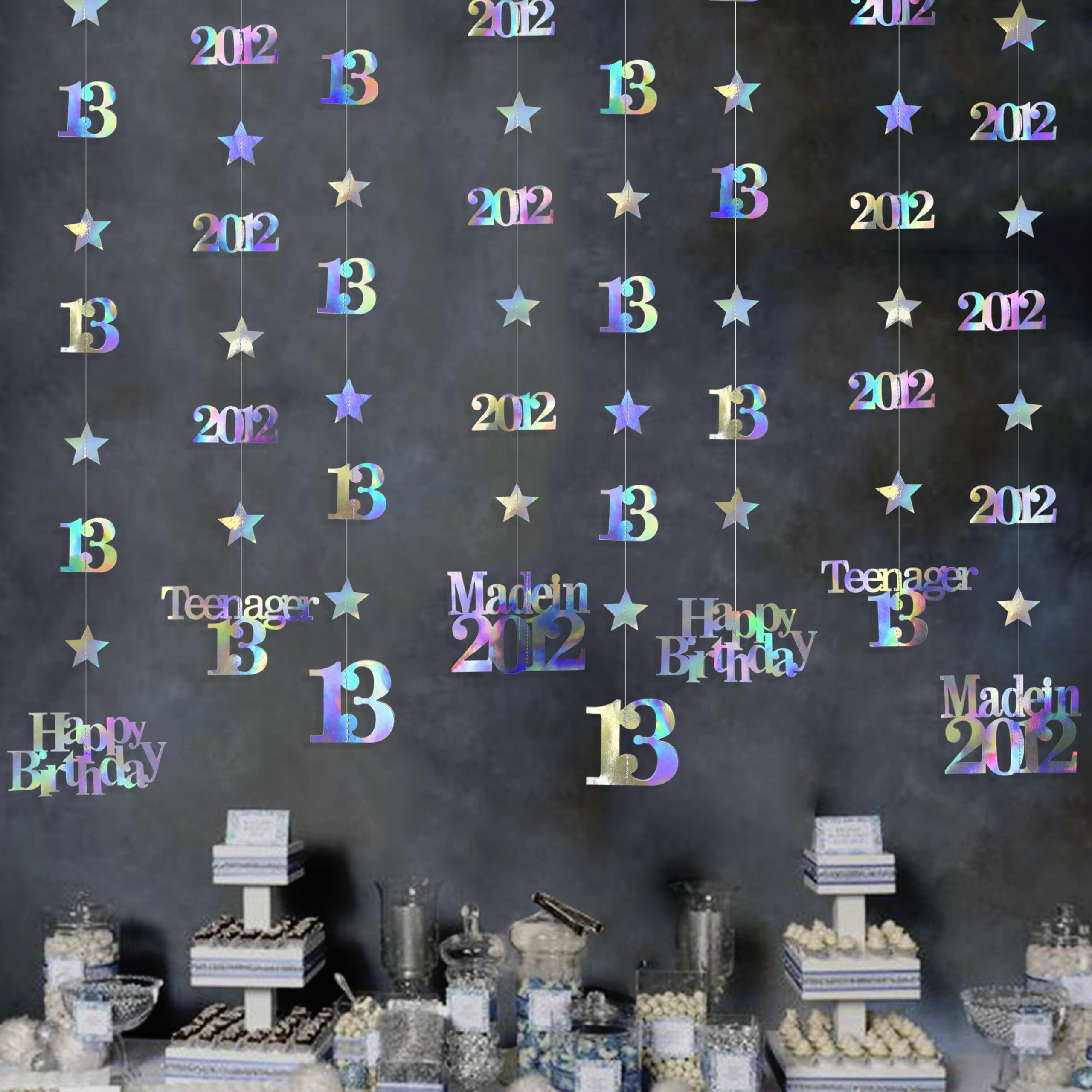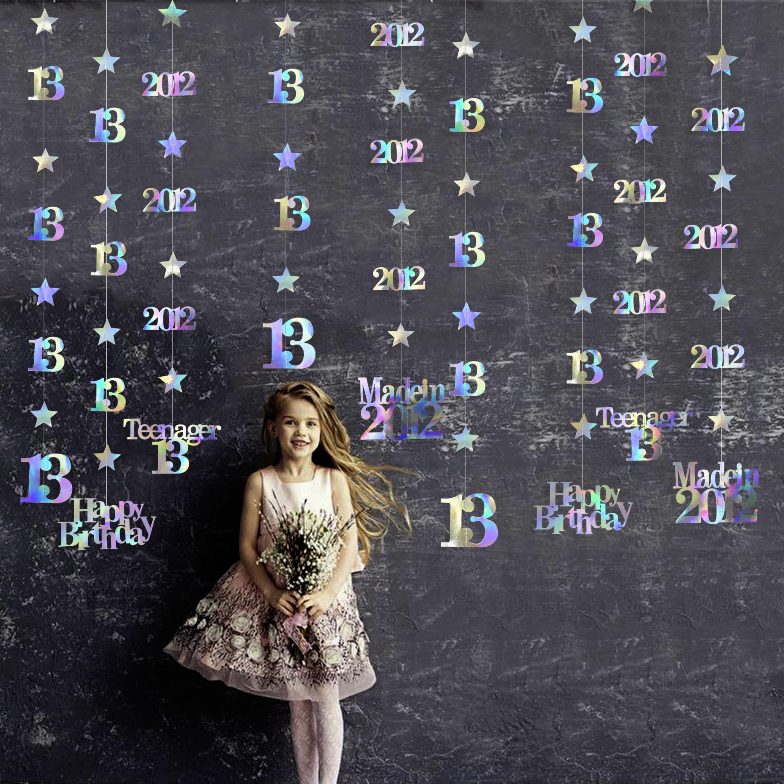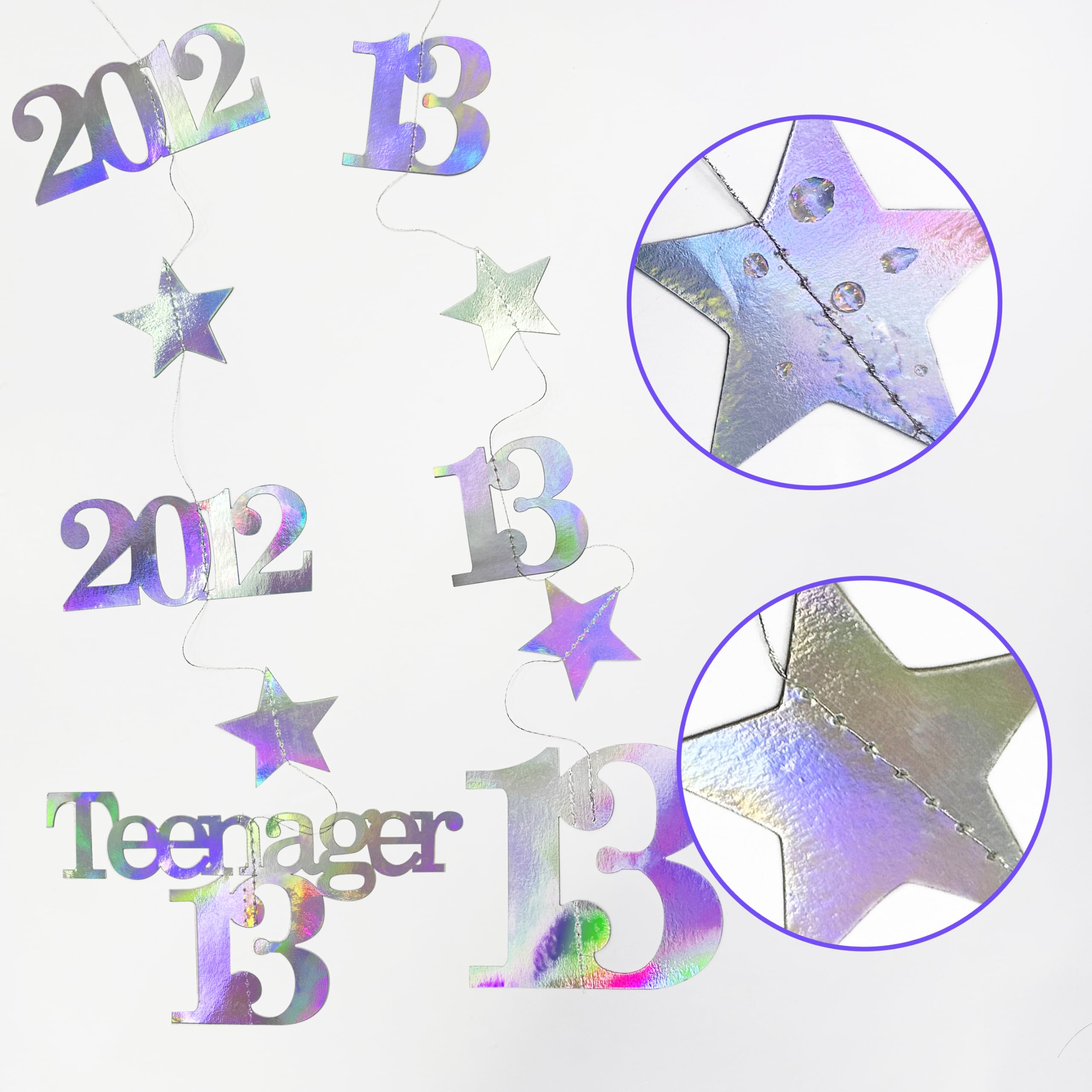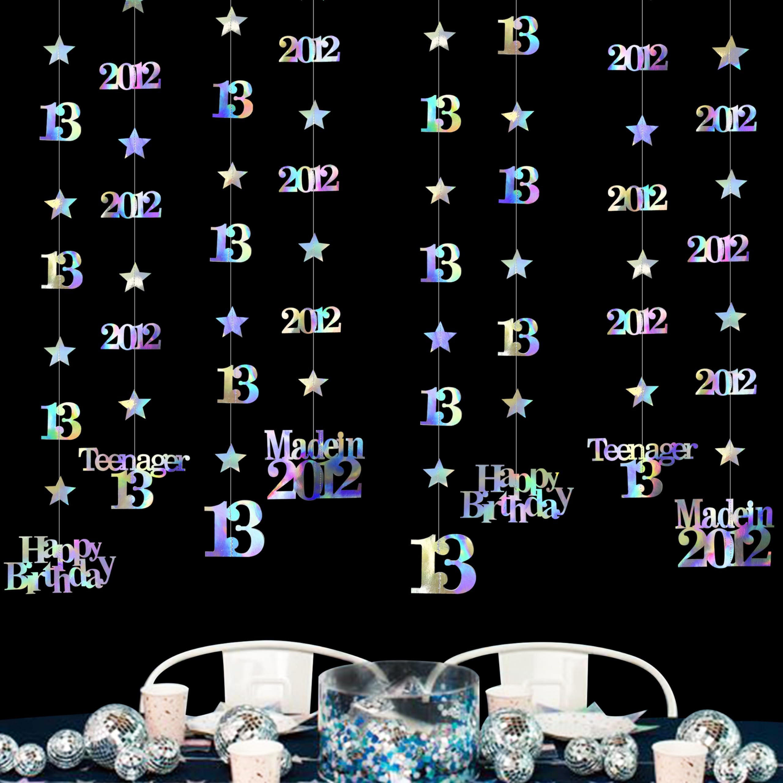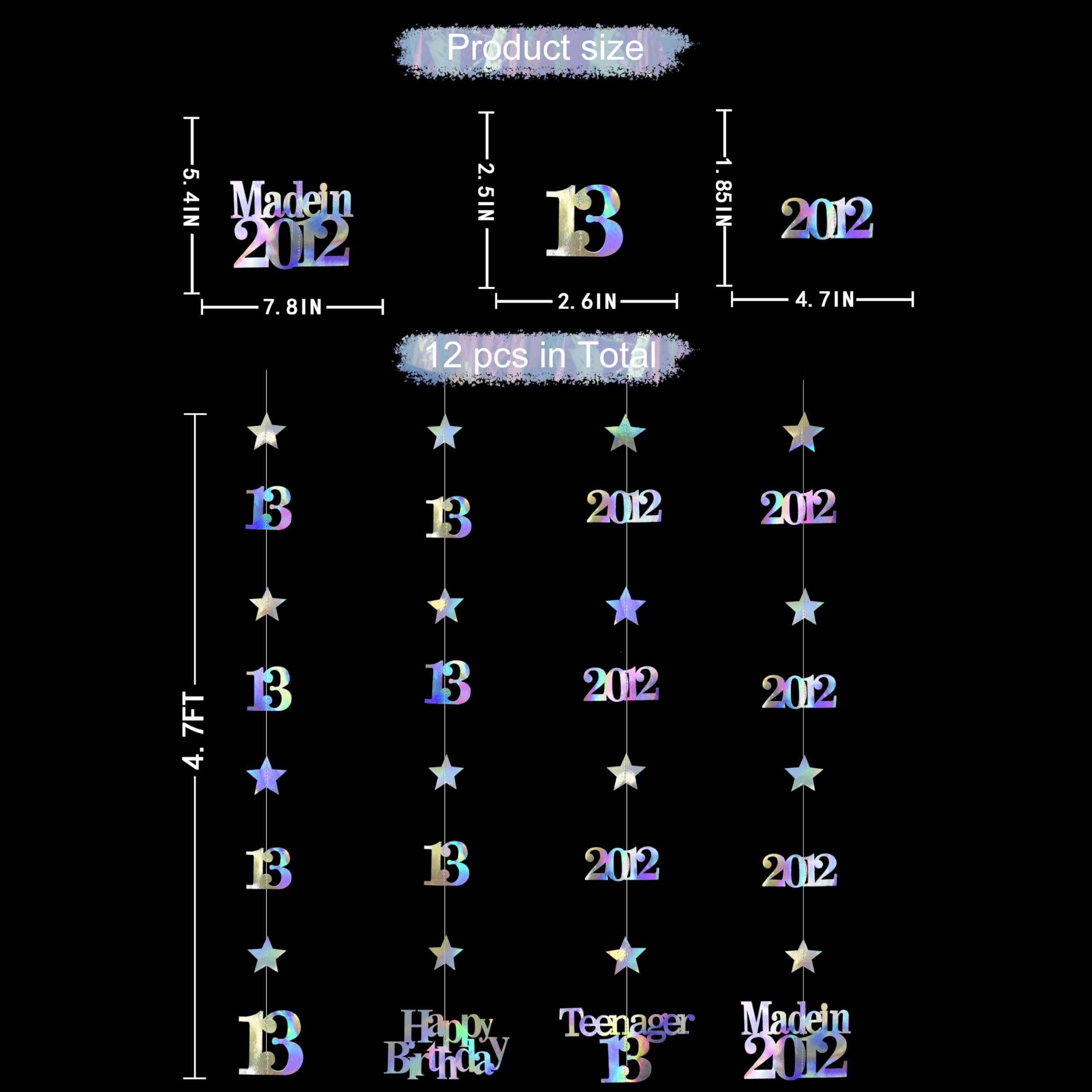 👍 Package includes - 12 strings of metallic iridescent 13th birthday theme sparkling twinkle star garlands with 13, Happy Birthday, Teenager 13 and Made in 2012 cutouts (in 4 styles) , each string is 4.7 feet/1.45 meters, totally is 56.4 feet/17 meters.
