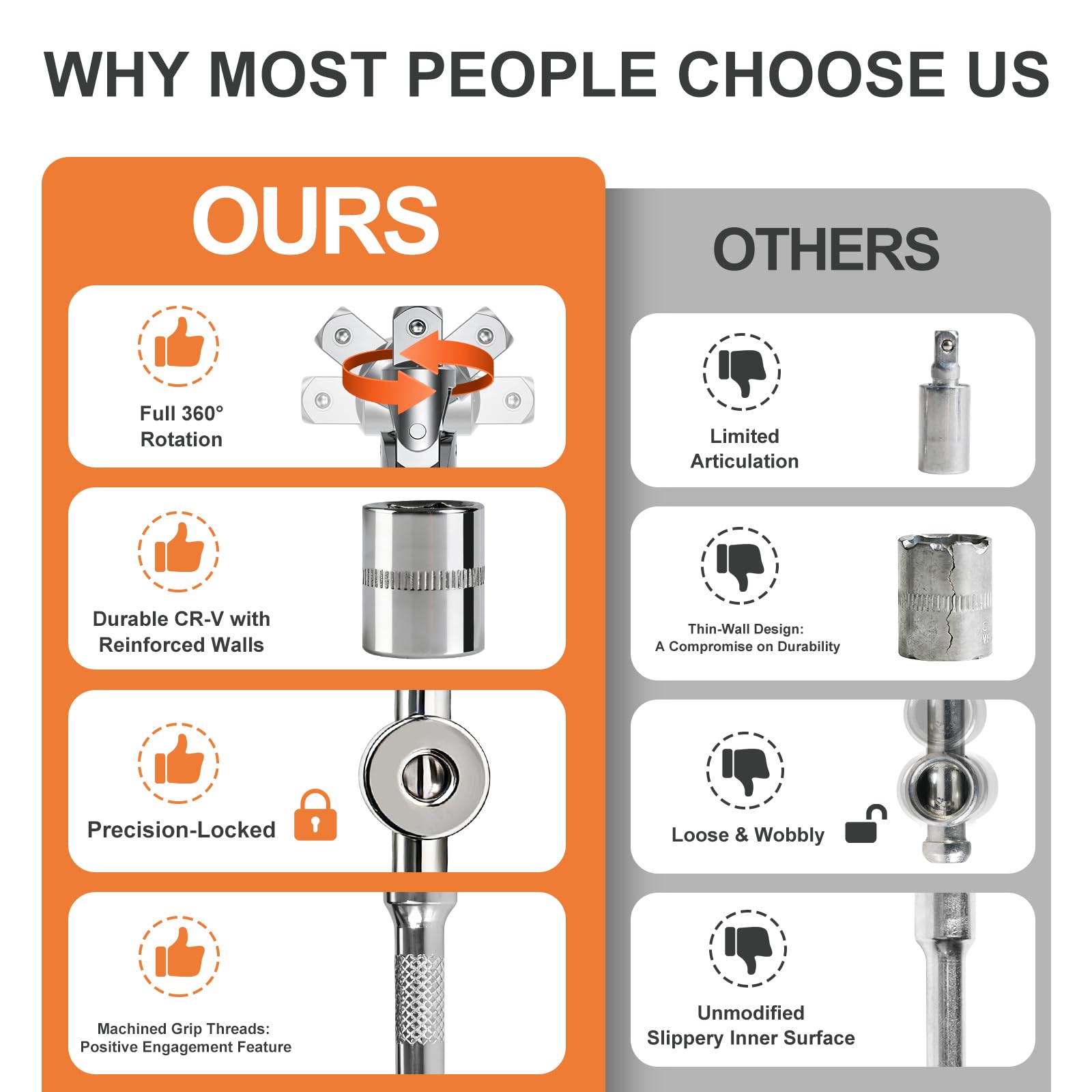 Durable CR-V with Reinforced Walls:Our CR-V sockets deliver unparalleled reliability and safety by fundamentally eliminating the bursting risk common in thin-walled carbon steel models. This is achieved through the powerful synergy of superior chrome-vanadium steel and a robust, thickened inner wall design.