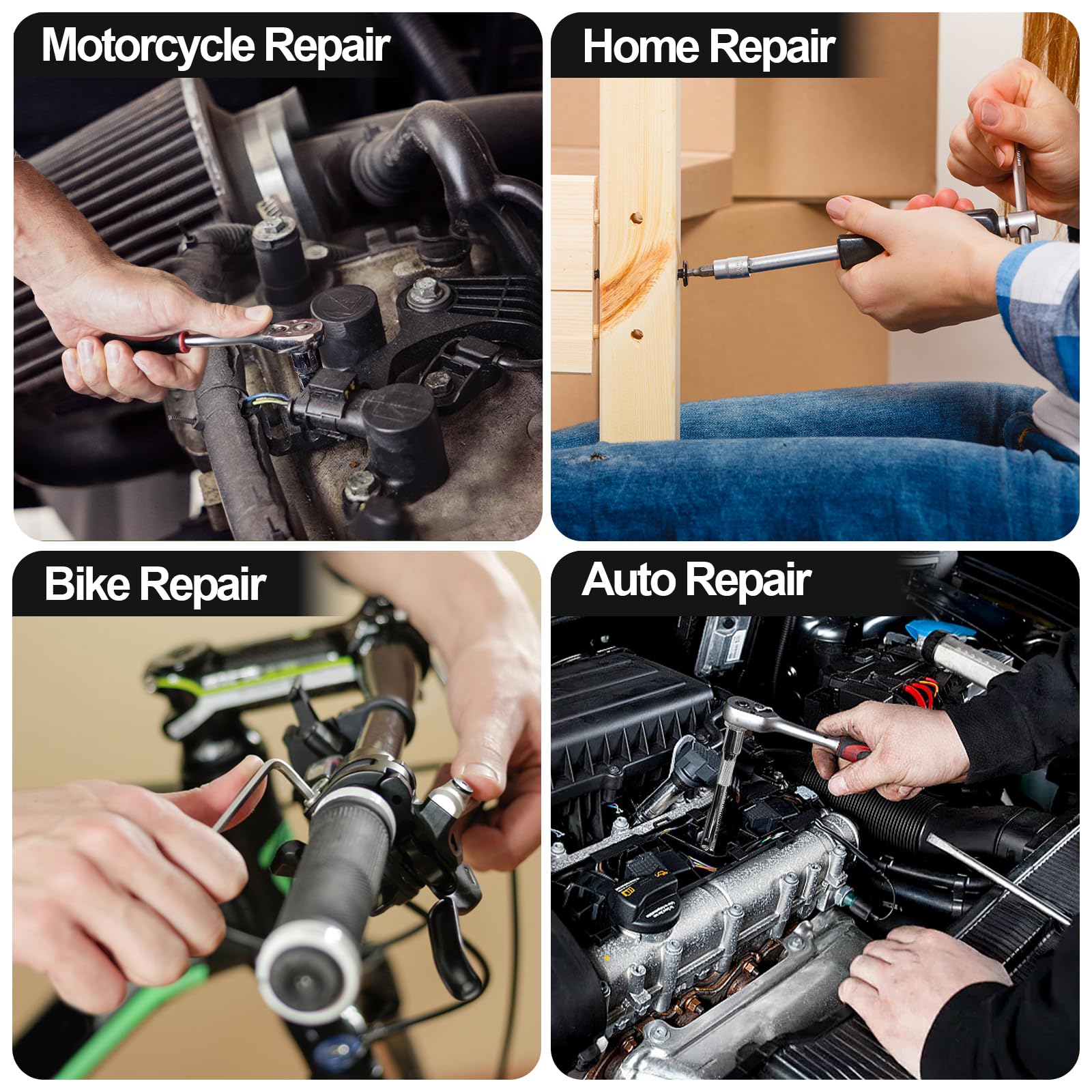 This ratchet wrenches set included multi extension bars is suitable for various scenarios: 1pc 1/4"dr × 6" flexible extension, 1pc 1/4"dr sliding t-bar, 1pc 1/4"dr sliding t-bar, 1pc 6" spinner handle and 1pc-bit adapter.