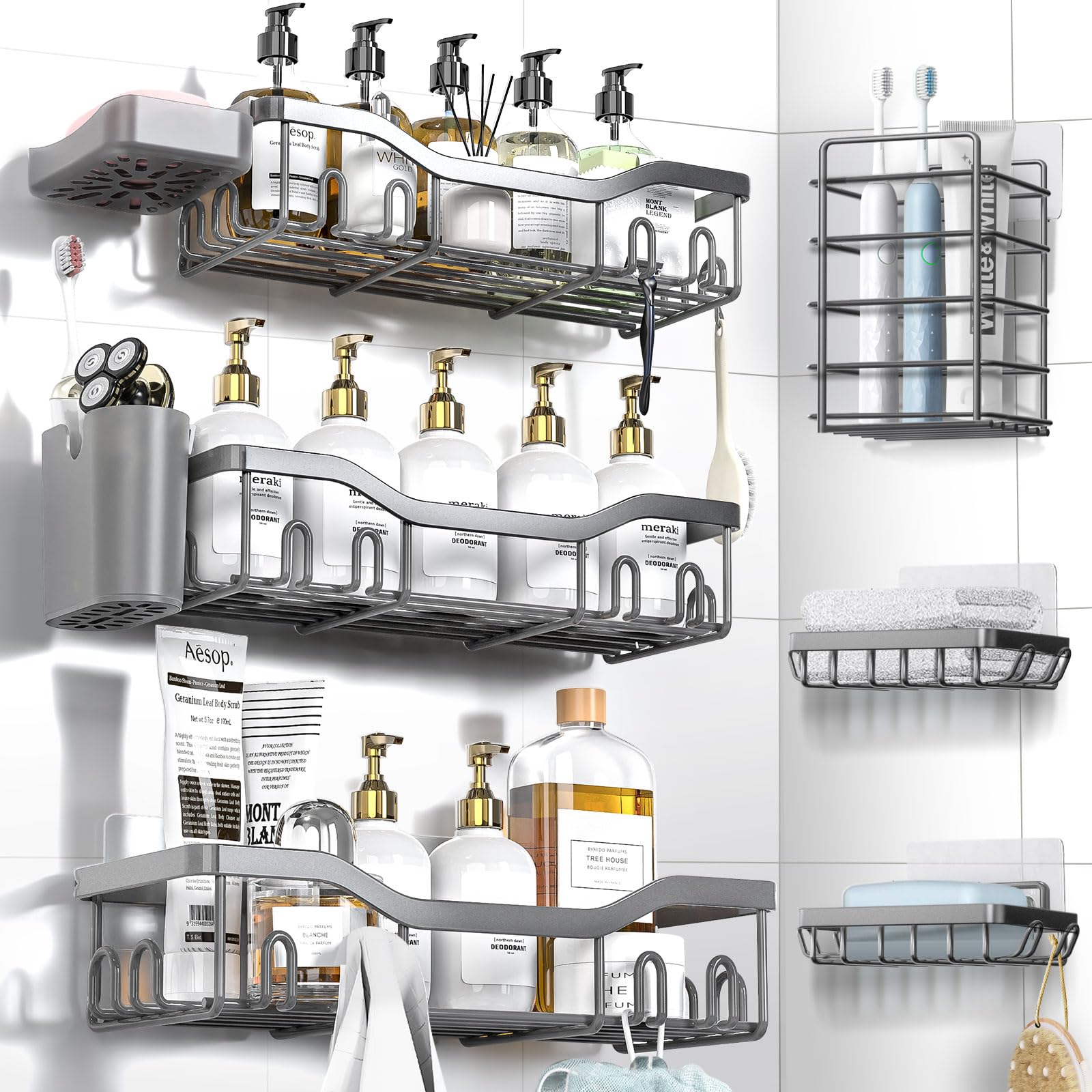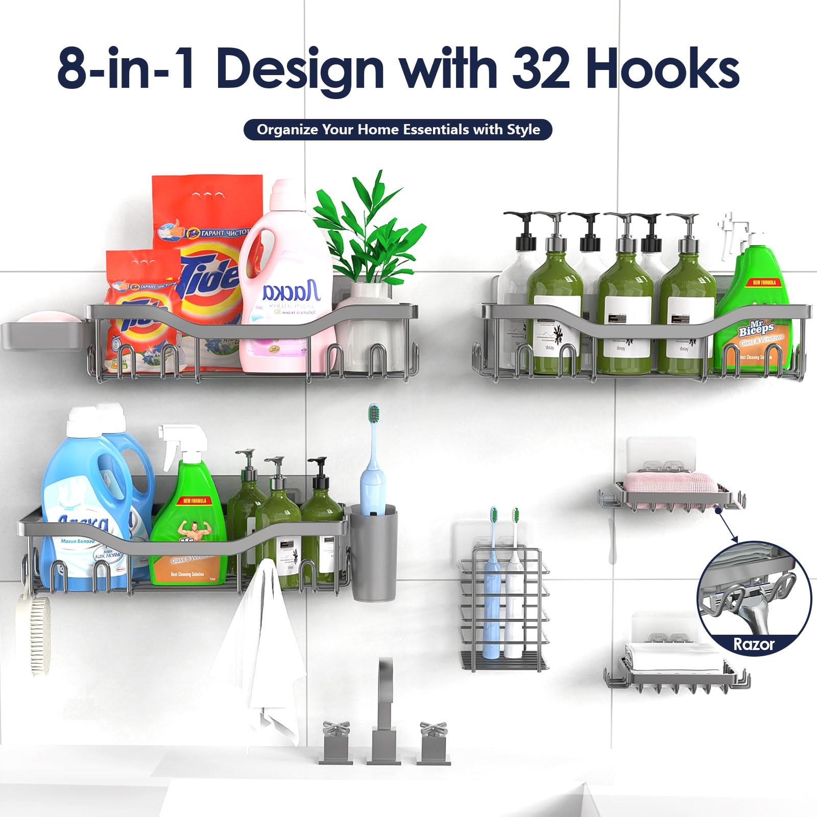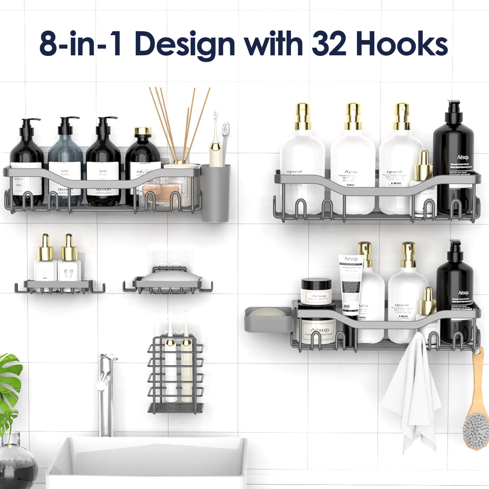 Ultra Size Large Capacity Shower Caddies 8-Pack with 32 Hooks: Each extra-large shower shelf comes with 8 durable hooks, it's perfect for storing bathroom essentials, wash supplies, cooking utensils, seasonings, hats. Maximize your space with these roomy adhesive shelves, perfect for enhancing your toilet, bathroom, kitchen, RV, laundry space or tool room, no drilling needed. Consider this bathroom organizers and storage set as a thoughtful gift for family and friends