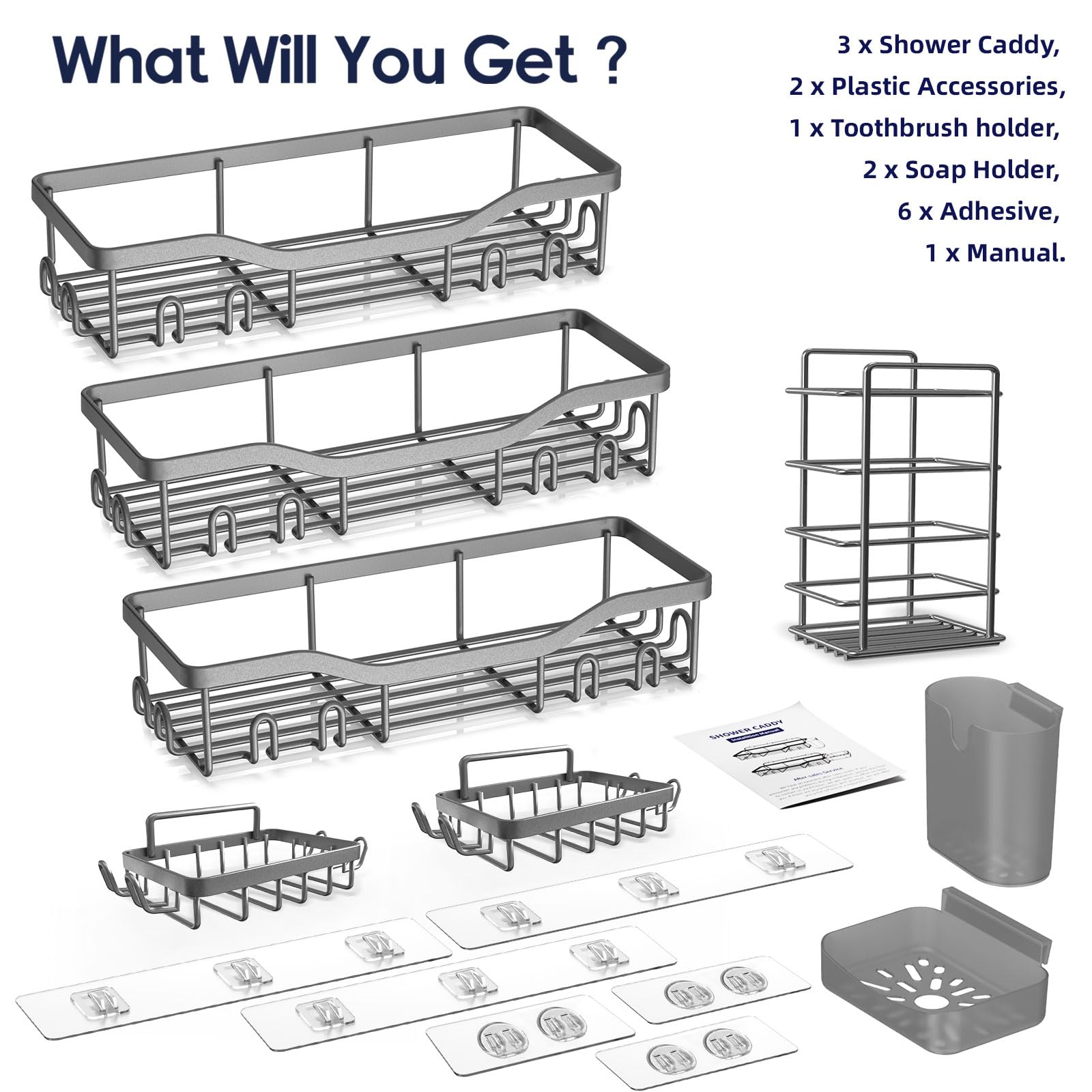 What Will You Get: 3 x shower caddy, 1x toothbrush holder, 2x soap holder, 2 x plastic accessories, 5 x adhesive, 1x manual. The bathroom organizer shelf ideal for all your washing essentials such as shampoos, facial cleansers, loofahs, kids bath toys, razors, a sleek and functional addition to your bathroom organization. If you have any problems, please feel free to contact us, we will provide satisfactory solutions