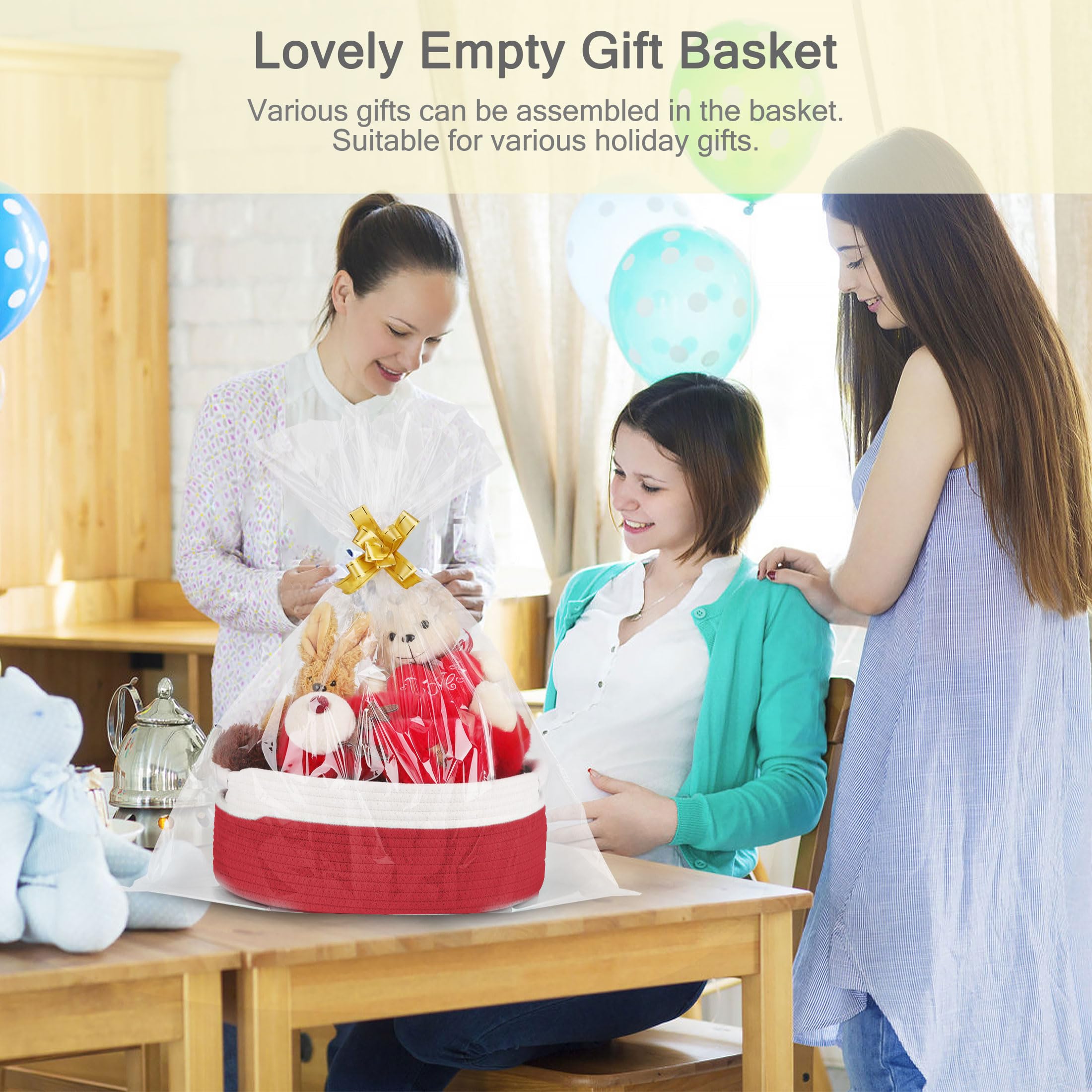 【Ideal Size and Material】Our lovely empty gift basket measures 13“ x 9” x 5.5". It is made of high quality natural cotton rope, soft and skin-friendly, chemical free, and won't scratch clothes or furniture. It's a perfect storage basket for families with babies or pets.