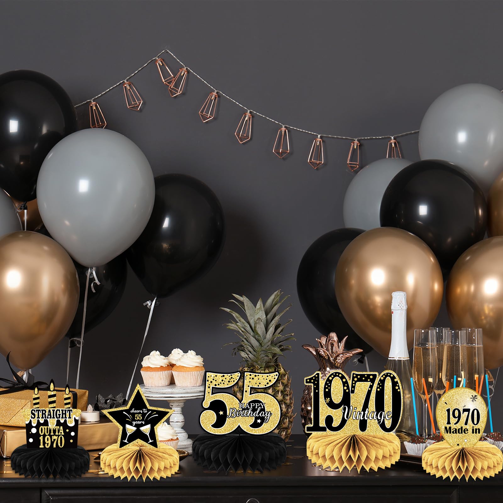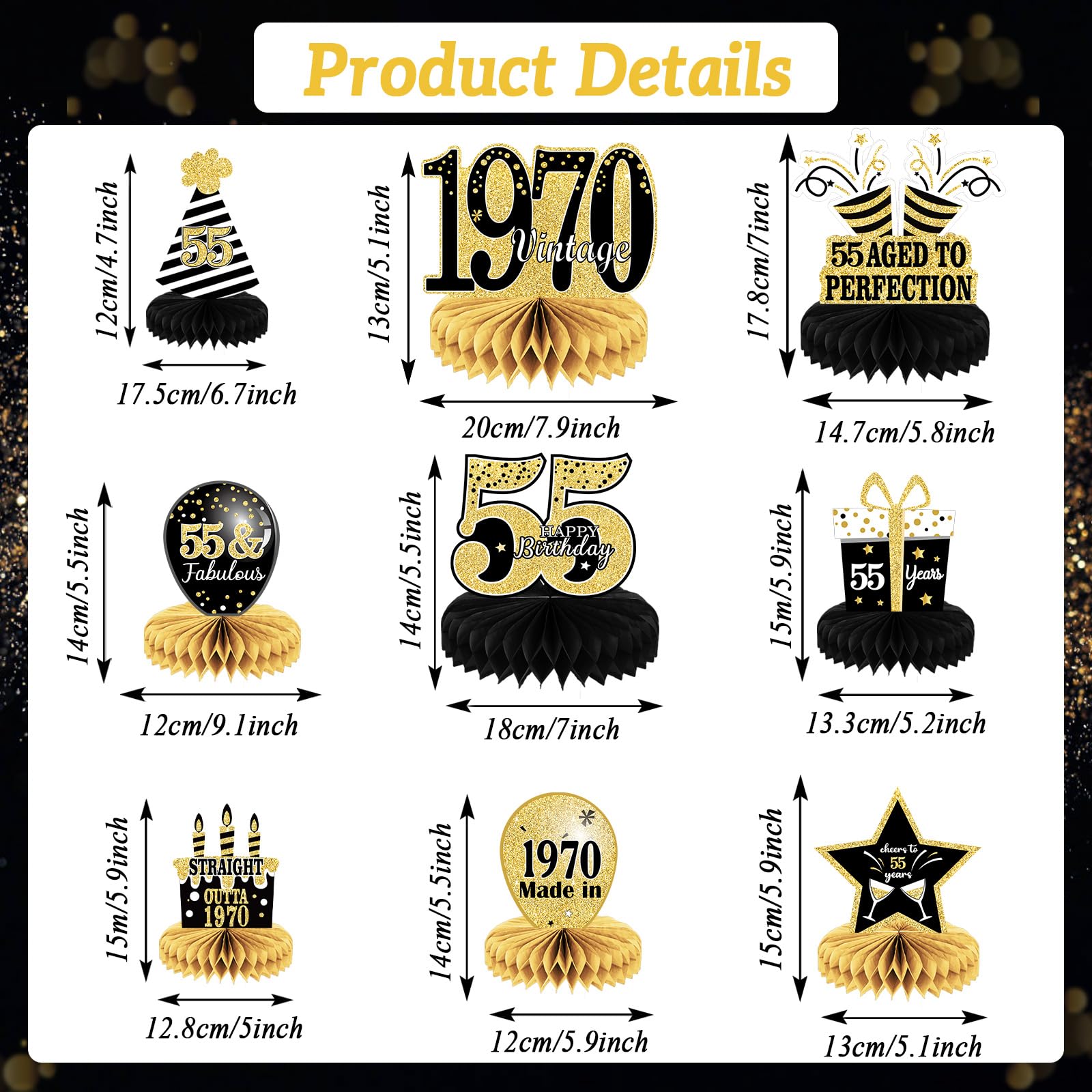 Package include: You will get 9 pcs different styles black gold 55th birthday centerpieces and 18 paper honeycombs. These cheers to 55 years party decorations can add more cheerful atmosphere in 55th birthday party.