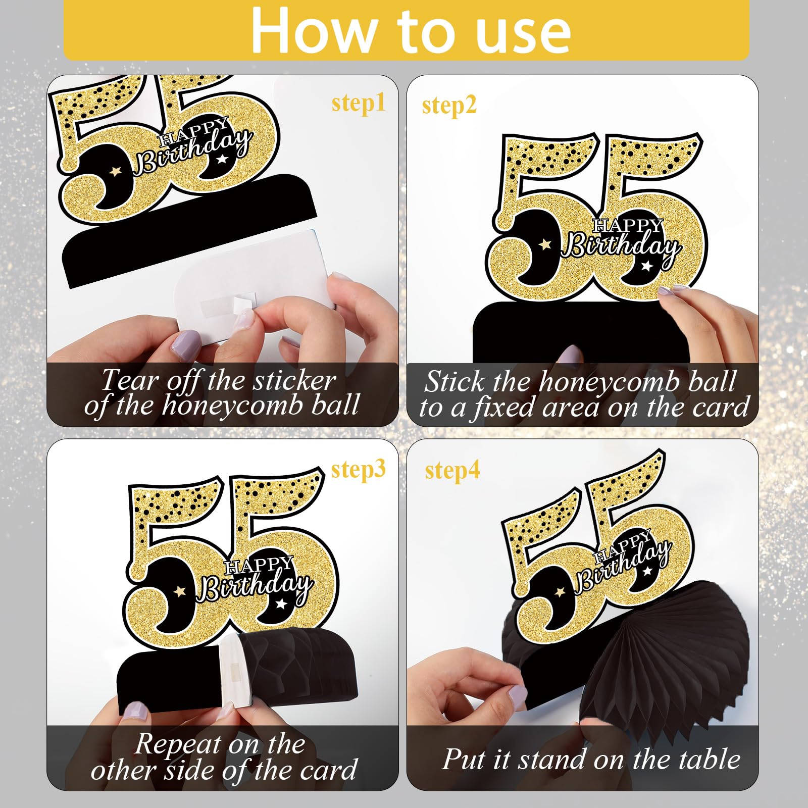 Easy to use: Step 1, tear off the stickers from the honeycomb ball. Step 2, stick the honeycomb ball to a fixed area on the card. Step 3, repeat the steps above to attach the honeycomb on the other side. Step 4, place the assembled honeycomb table topper on the table for decoration.