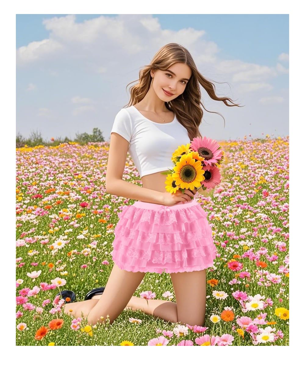 Features: This lace panty is decorated with layered ruffles of lace, a small bow at the front, an elasticated waistband, a rise, and a solid color design. This panty has a cute, sweet, and trendy feminine style, and it looks a lot like a mini skirt when