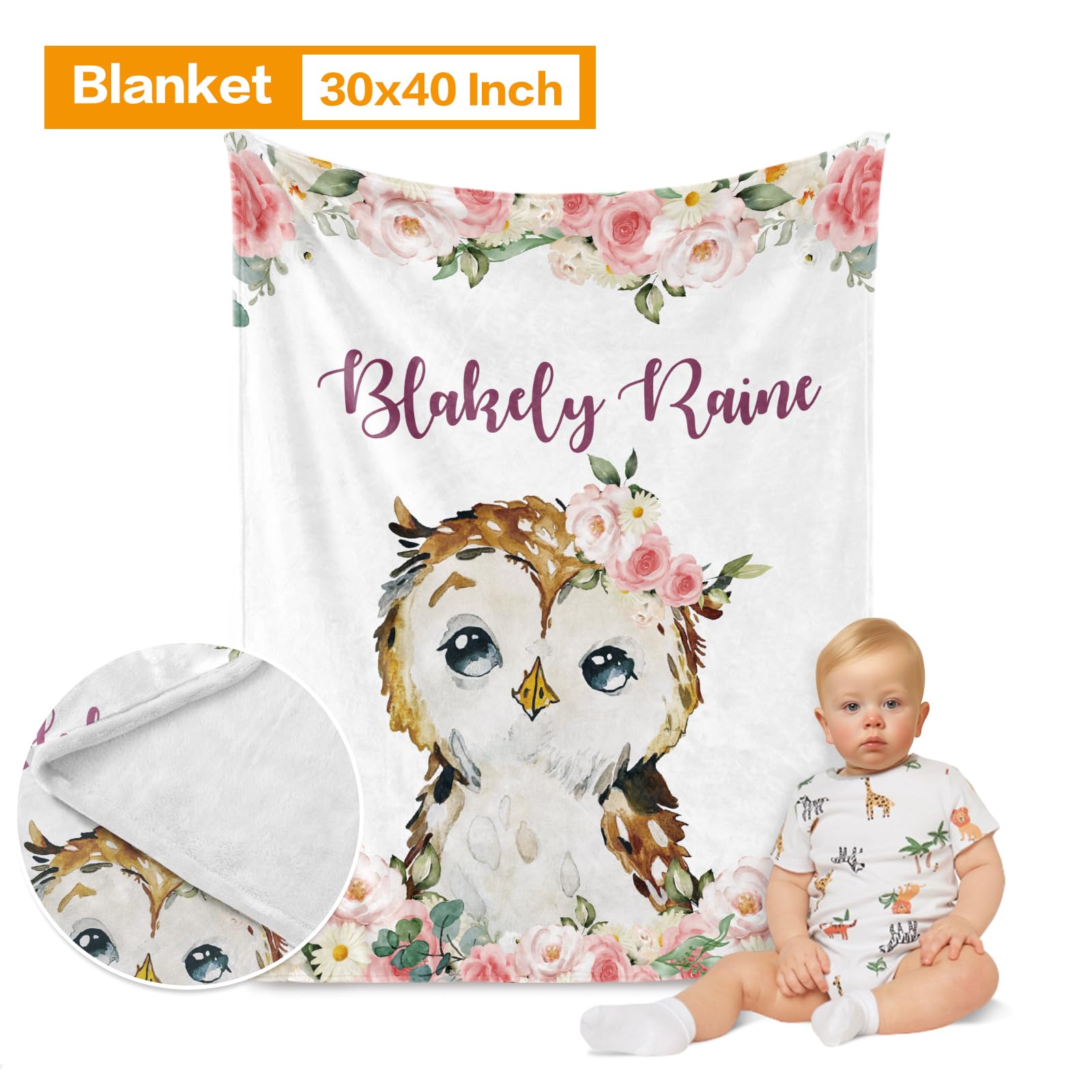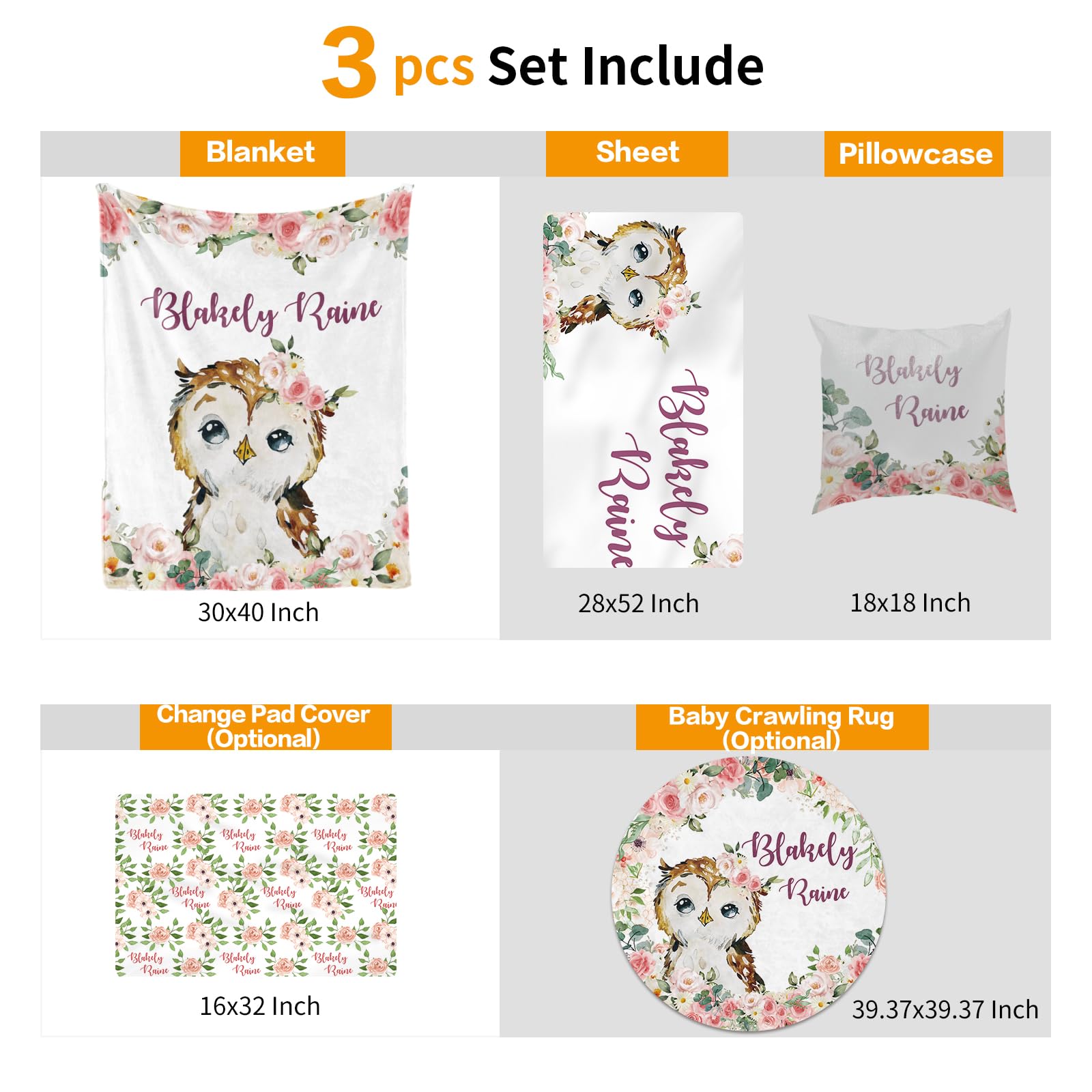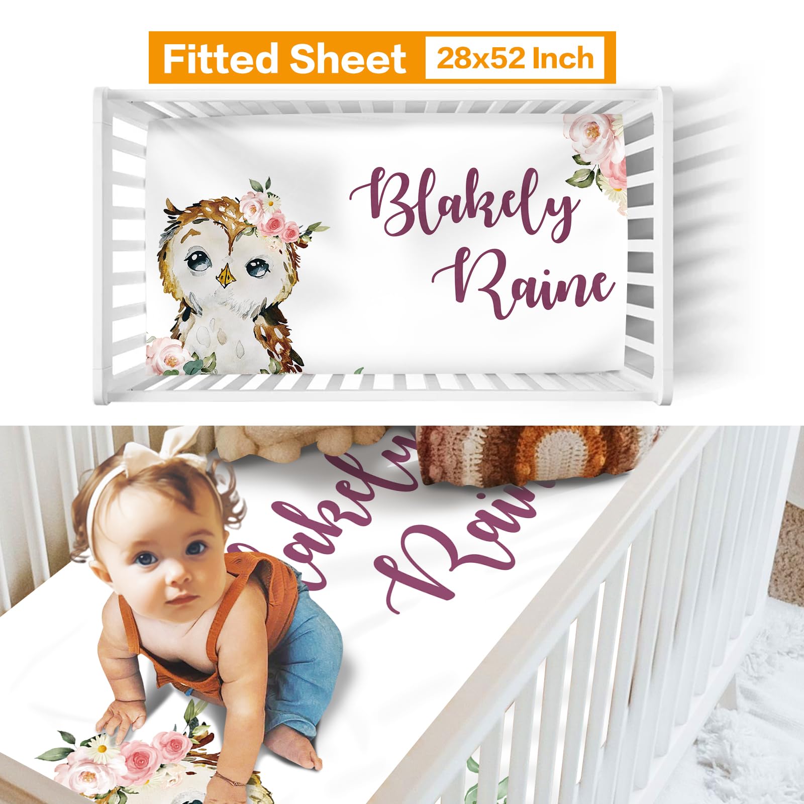 Duckbe Custom Crib Bedding Set - Owl Design Personalized Name Baby Nursery Bedding 3 Pcs Set - Chic Soft Blanket, Sheet, Pillowcase for Newborns Boys Girls Gifts Color12