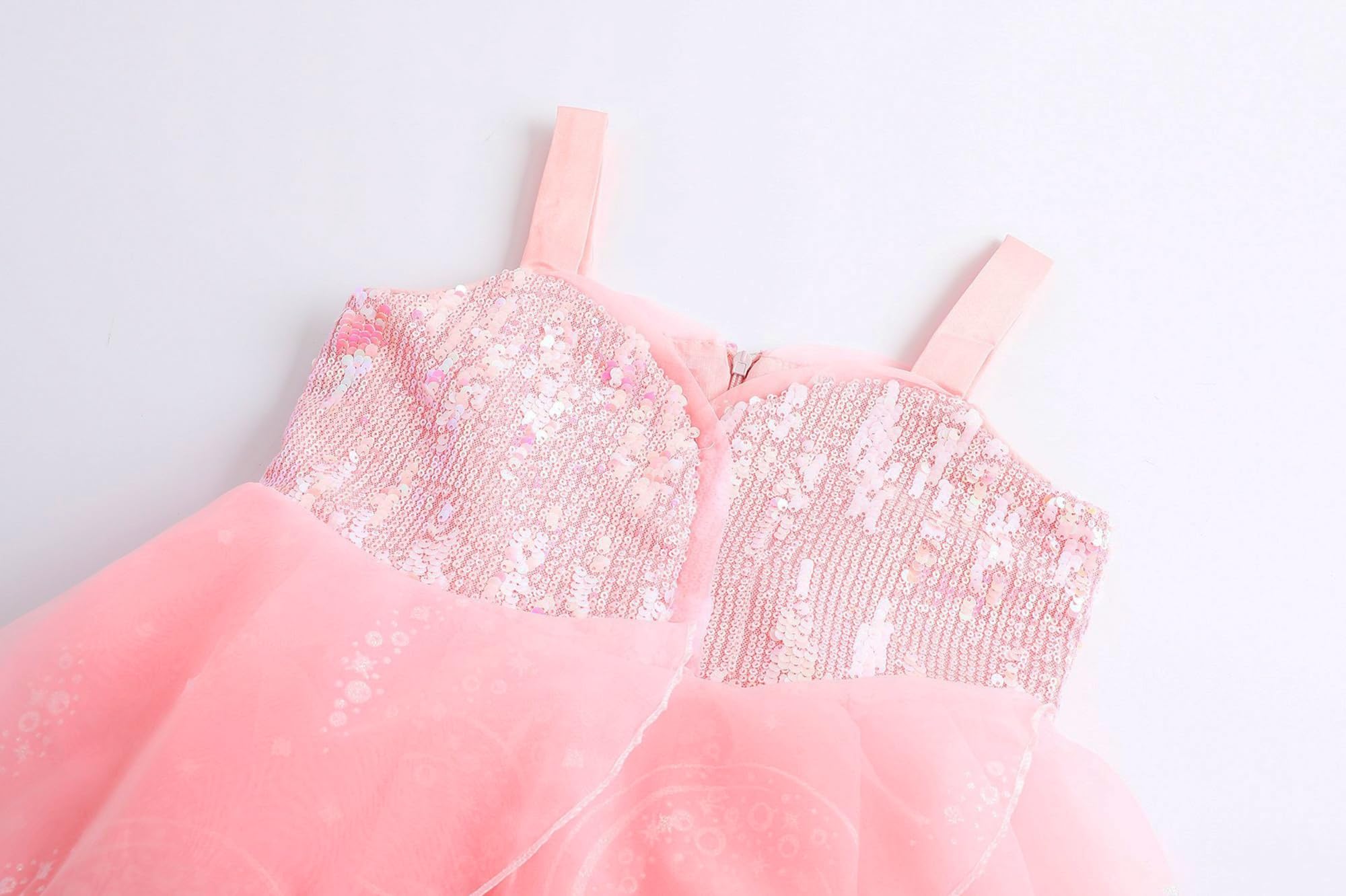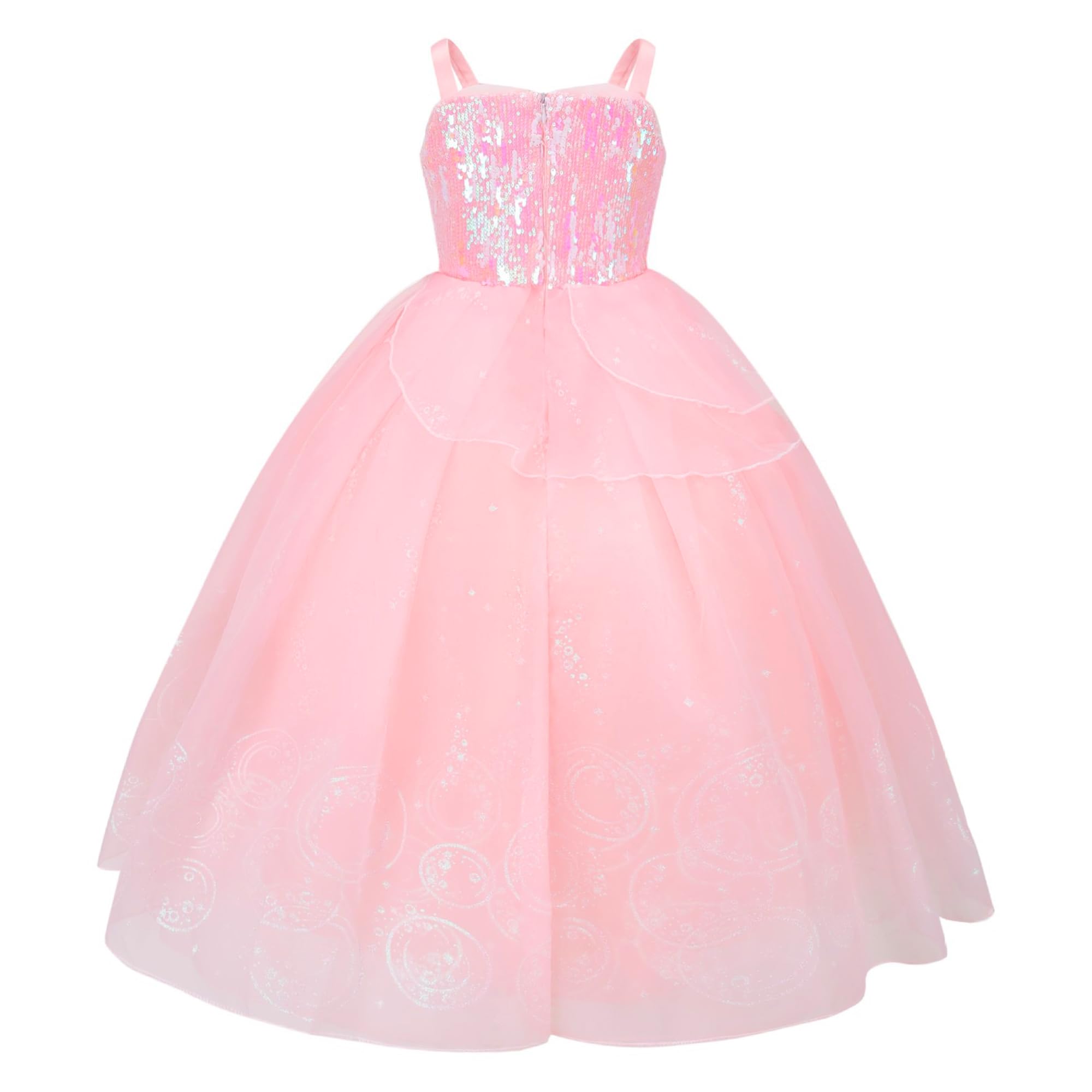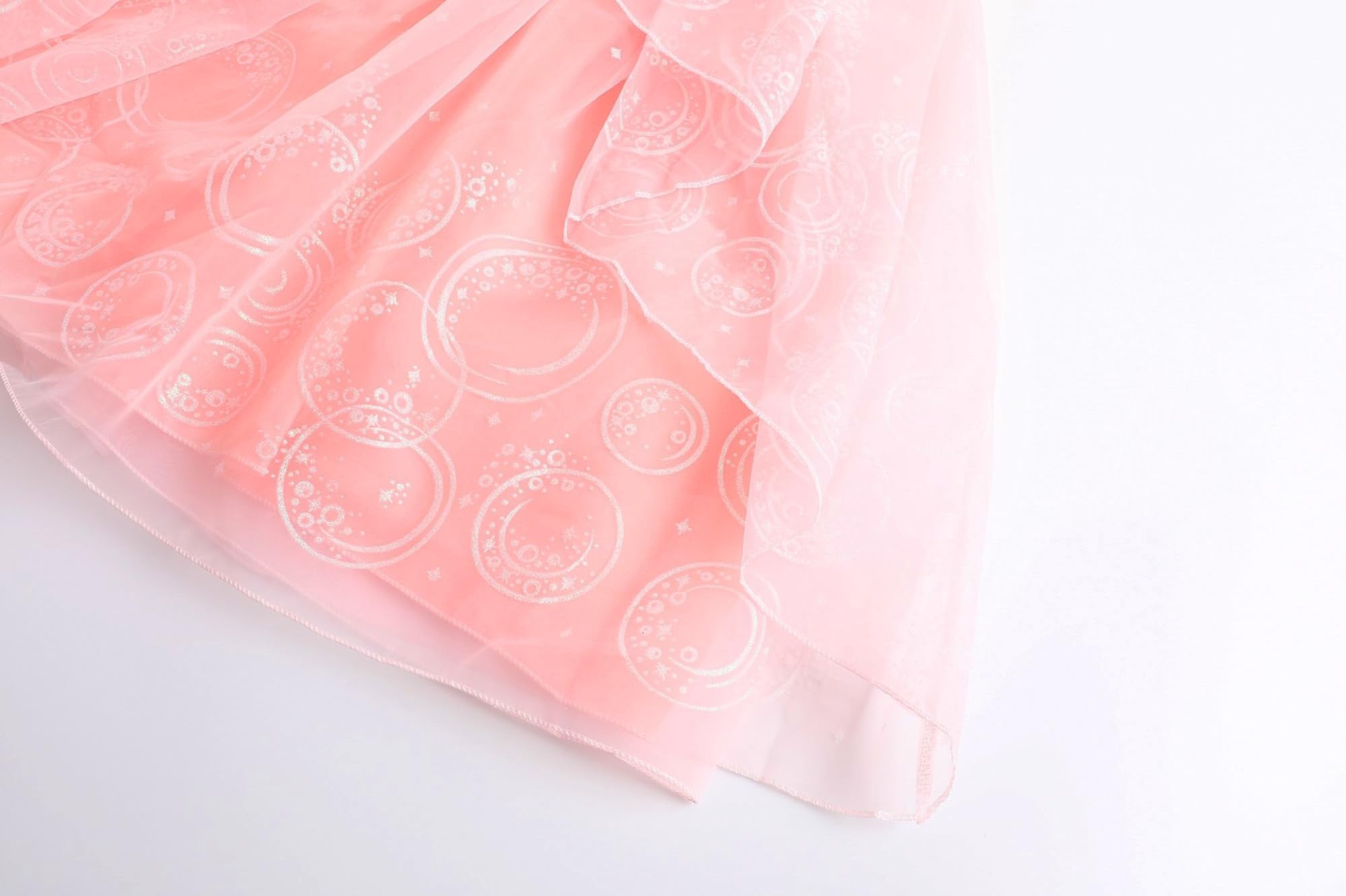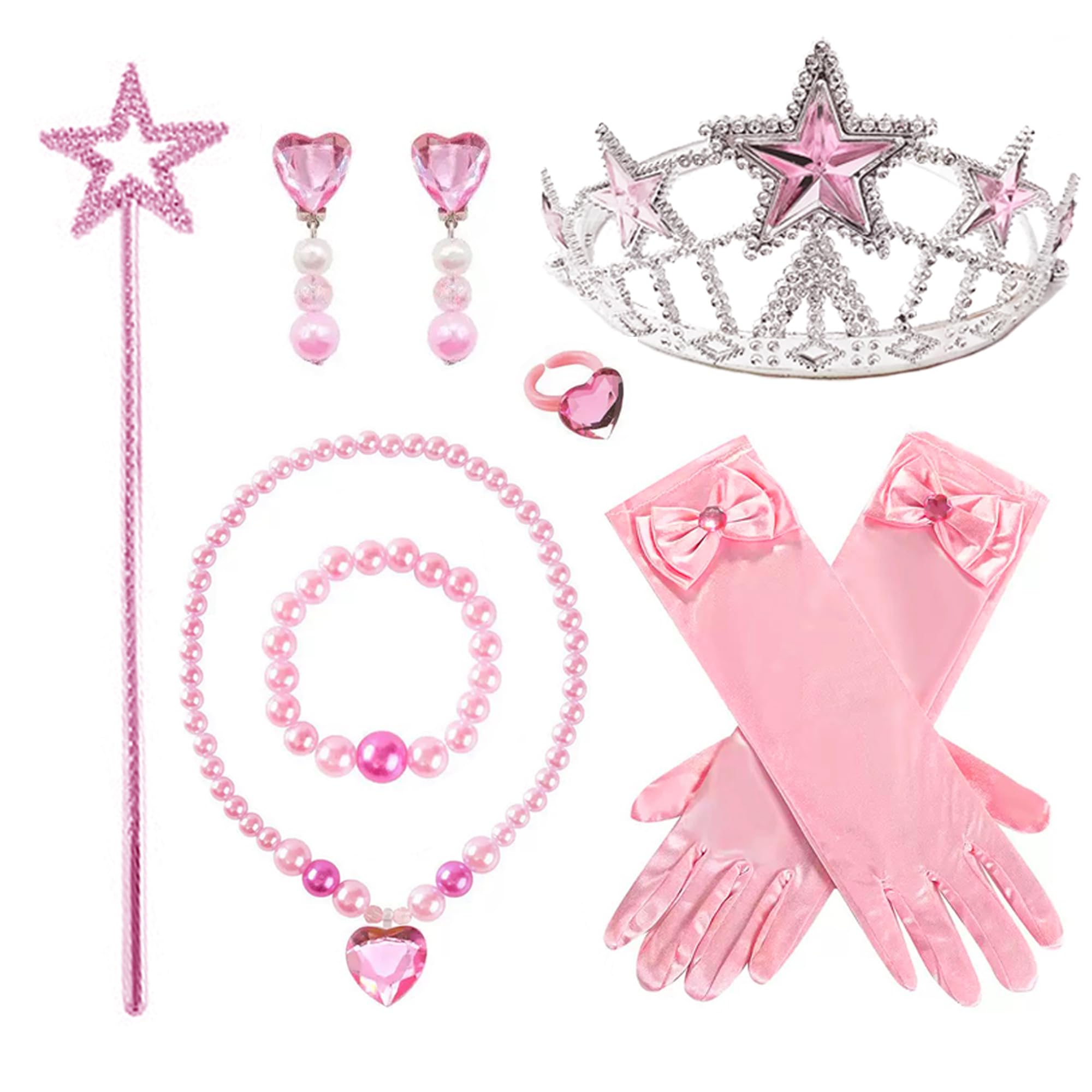 Package include 9 Pcs:1* Girls Pink Dress, 1* Pink star crown, 1* rainbow pink bags, 1 pair of Pink earrings,1* Pink necklace, 1* Pink Bracelet, 1* Pink ring,1* wand and 1* pair of pink gloves
