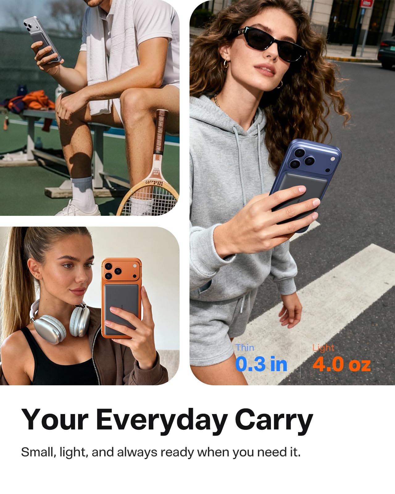 【Ultra-Compact & Lightweight】The MiniMag Power Bank is a portable charger that combines powerful performance with portability. Measuring just 0.3 inches thin, it's sooo thin and lightweight! It's almost invisible when attached to your phone, like carrying nothing at all! You can easily put it in your pocket or bag and carry it with you wherever you go! Despite its small size, it packs a punch with its high-capacity lithium-polymer battery that provides up to charge for your phone.
