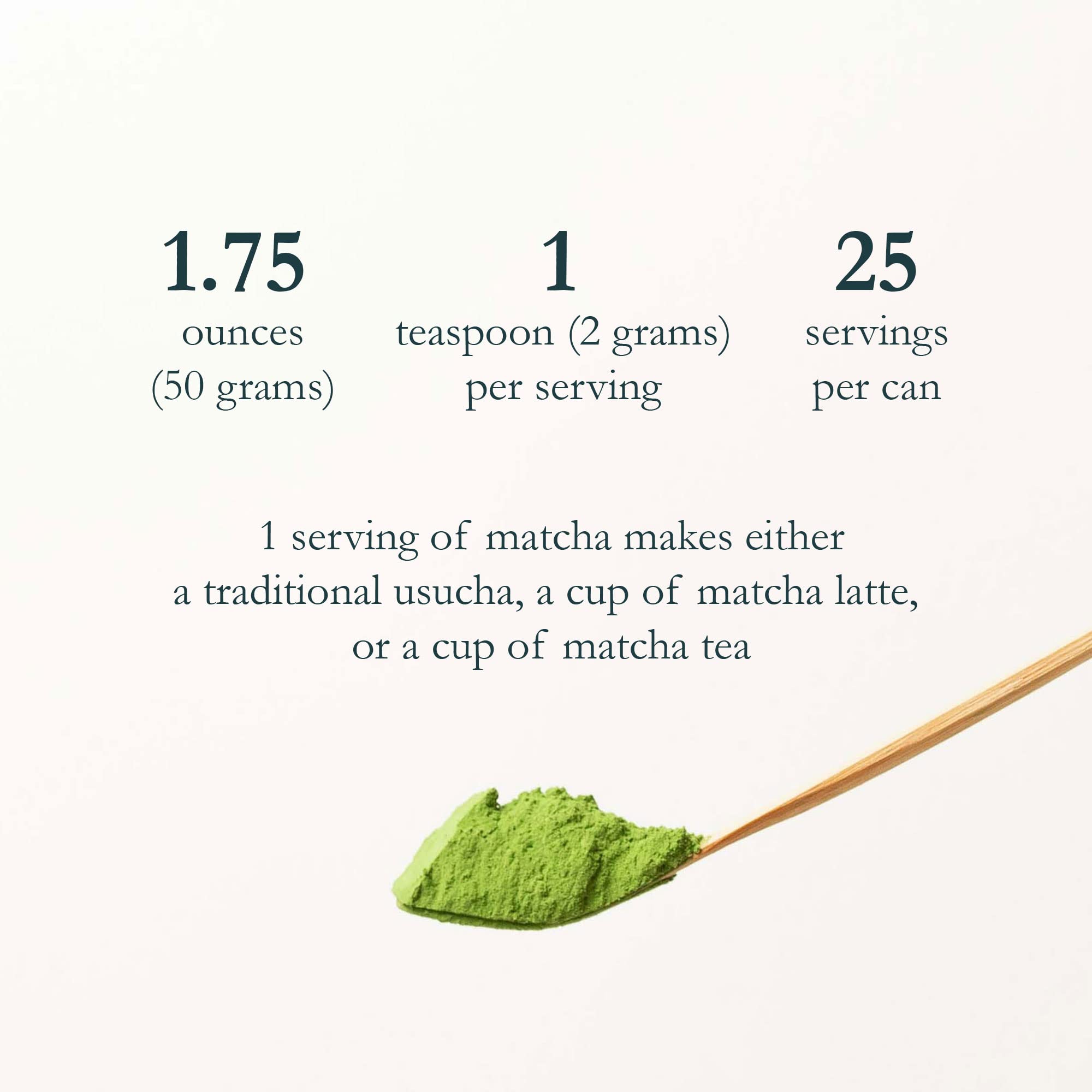 ✓ Our Organic Ceremonial Grade Matcha in Resealable Packaging - A resealable package for those who purchase regularly but do not want to accumulate empty cans. Our 1.75 oz / 50g package serves a total of 25 servings. 1 tsp (2 grams) of matcha powder makes either a cup of matcha tea (usucha) or a small matcha latte. We recommend to beginners looking for a decent, all rounded organic ceremonial grade matcha that provides good value for the price.