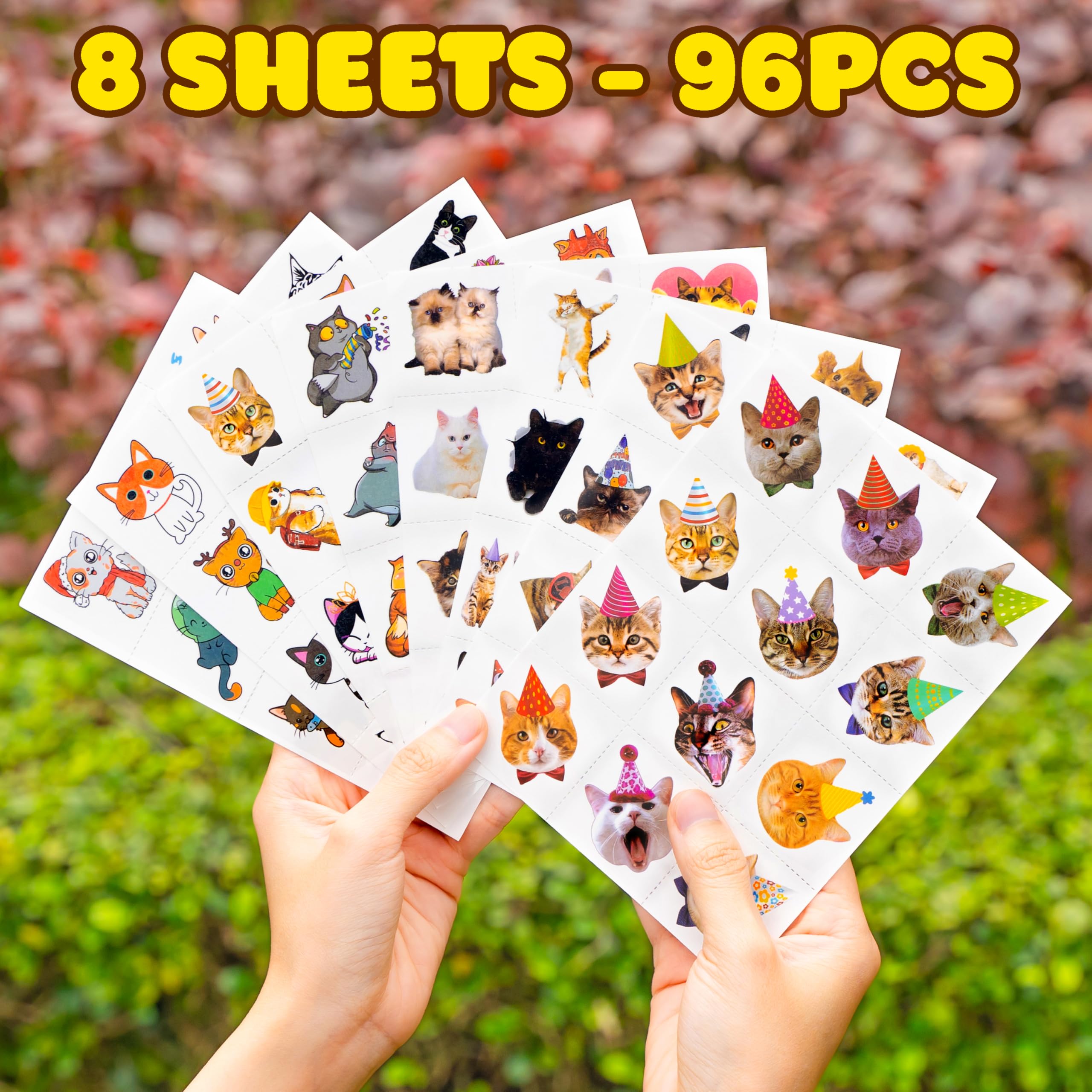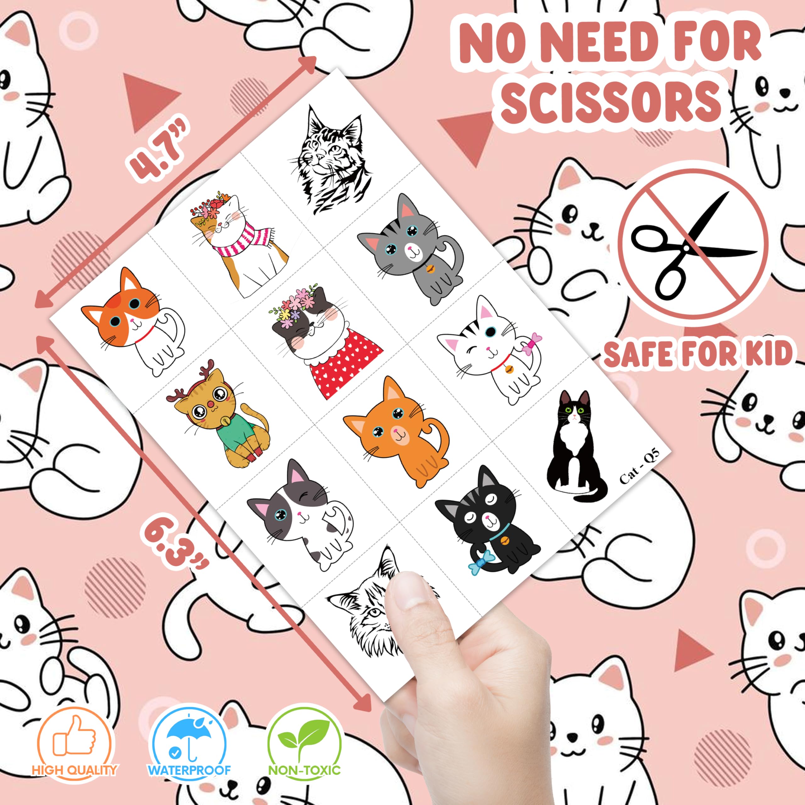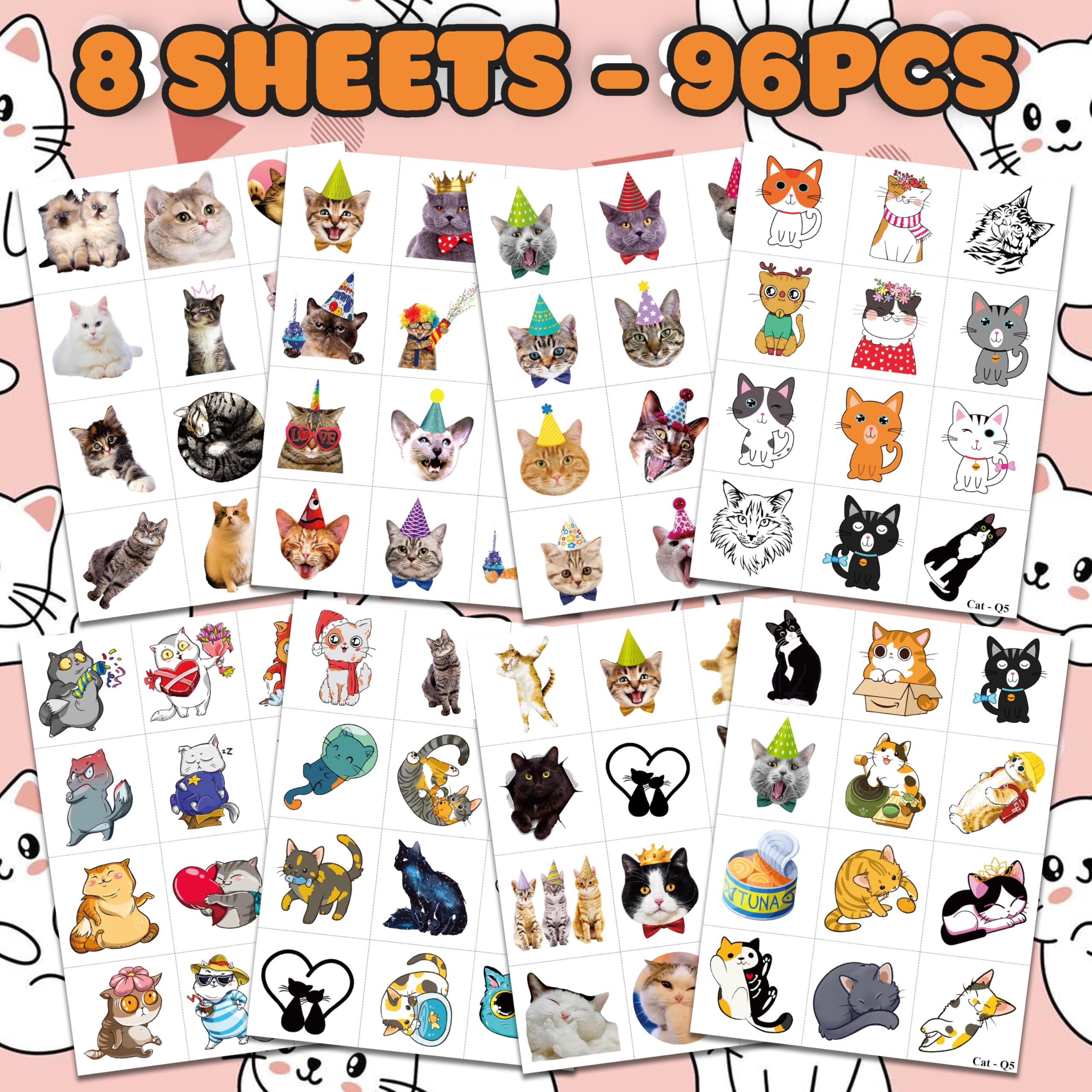 😻 Cute Cat Party Supplies: 8 sheets Cat cartoon themed Pre-Cut temporary tattoos stickers, features an assortment of cute themed characters, each pattern measures 6.3 x 4.7 inch , all kinds of designs and colors will bring more fun to your party, one size fit all adult and kids.