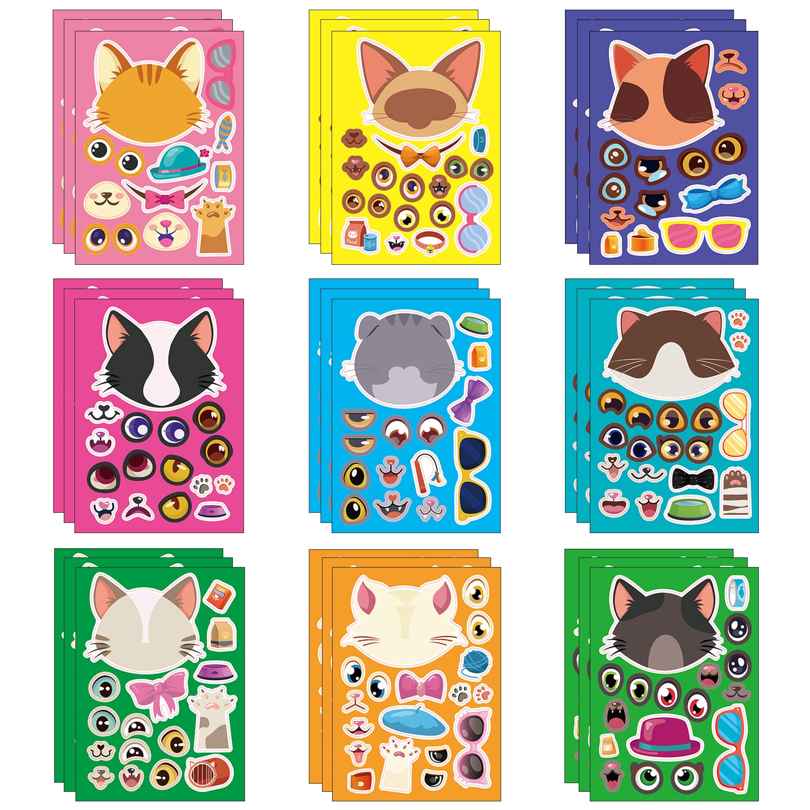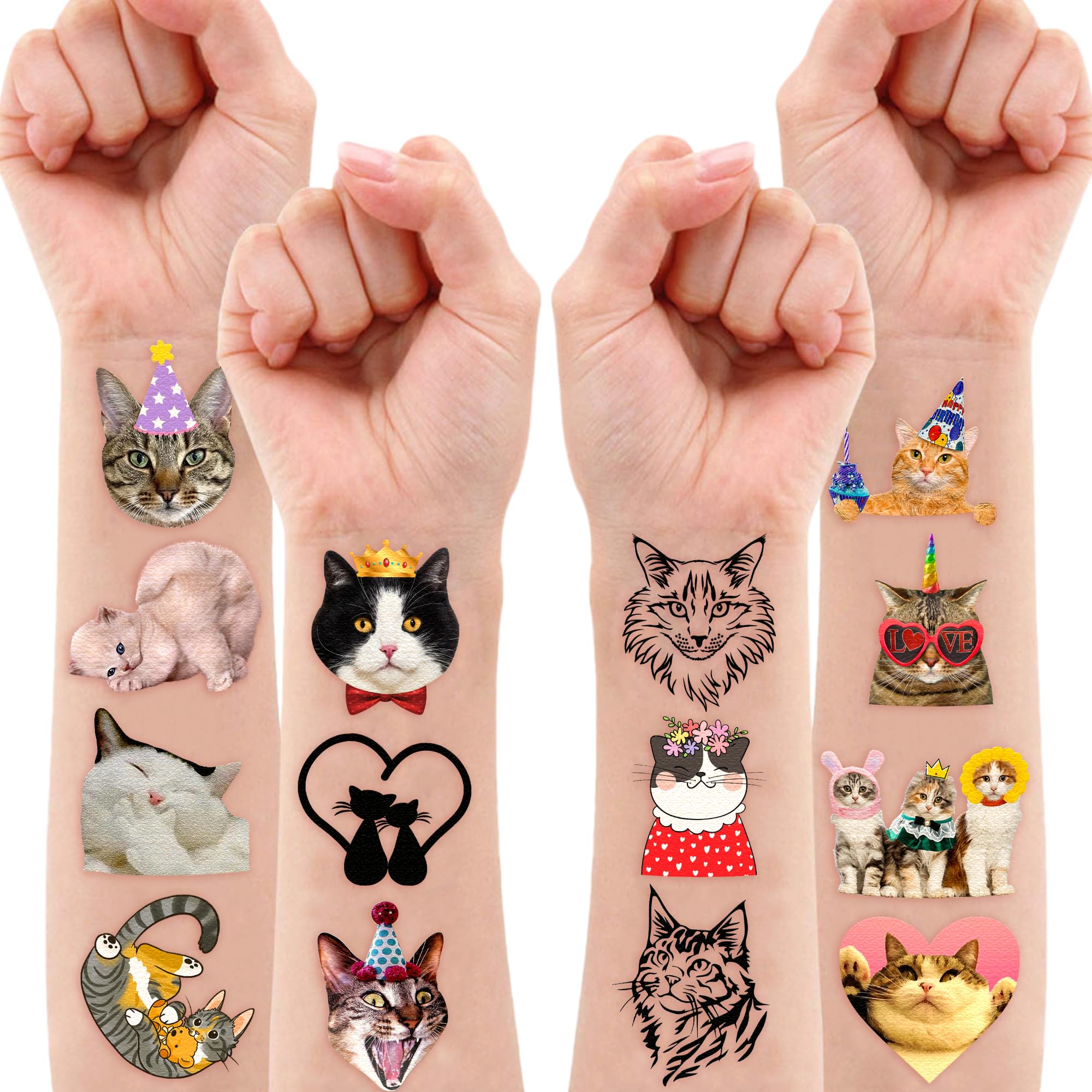 😻 Cute Cat Party Supplies: 8 sheets Cat cartoon themed Pre-Cut temporary tattoos stickers, features an assortment of cute themed characters, each pattern measures 6.3 x 4.7 inch , all kinds of designs and colors will bring more fun to your party, one size fit all adult and kids. 😻 Perfect Cat Birthday Decorations: All the temporary tattoos are design with many themed. Fits any smooth part: face, hands, arms, shoulders, back, legs water bottle, cup,mug and other stuff and so on. Great fun for party favors, birthday gift, clubs, festivals or party supplies,etc. and can be used by children, kids, girls, boys, women, men. 🙈 Easy to Use and Remove: Simply pick your favorite tattoo, peel off the clear film, and place it face down on clean skin. Rub the back with a damp cloth or sponge for about 30 seconds. These tattoos have been rigorously party-tested and are 100% guaranteed to last all day. To remove, gently rub with baby oil, olive oil, or rubbing alcohol, and peel off after a few minutes. 🍀 Safe And High Quality: High quality printing makes all dessert patterns colorful and realistic, waterproof. Importantly, which is harmless to kids, non-allergenic for kids skin. Should not be used for children under 3 years old, people with a history of sensitive skin, and if any symptoms appear, stop using immediately. We all recommend using a small part to use the test first, and if there is no problem, it can be used normally. 😘 Customer Service: We guarantee to provide you with a good shopping experience. If you have any questions, please contact us. We will try our best to help you solve the problem and ensure that you have the best shopping experience.