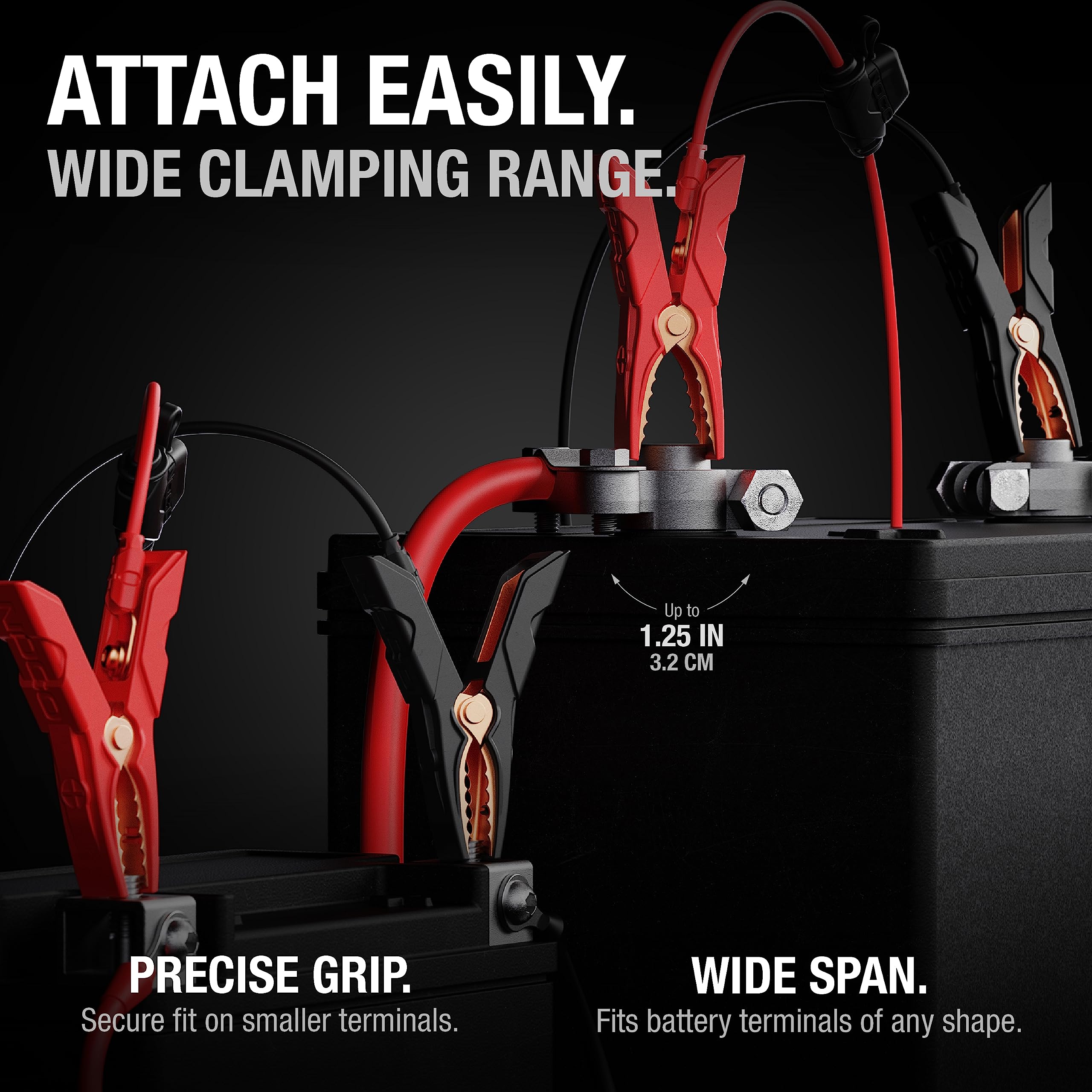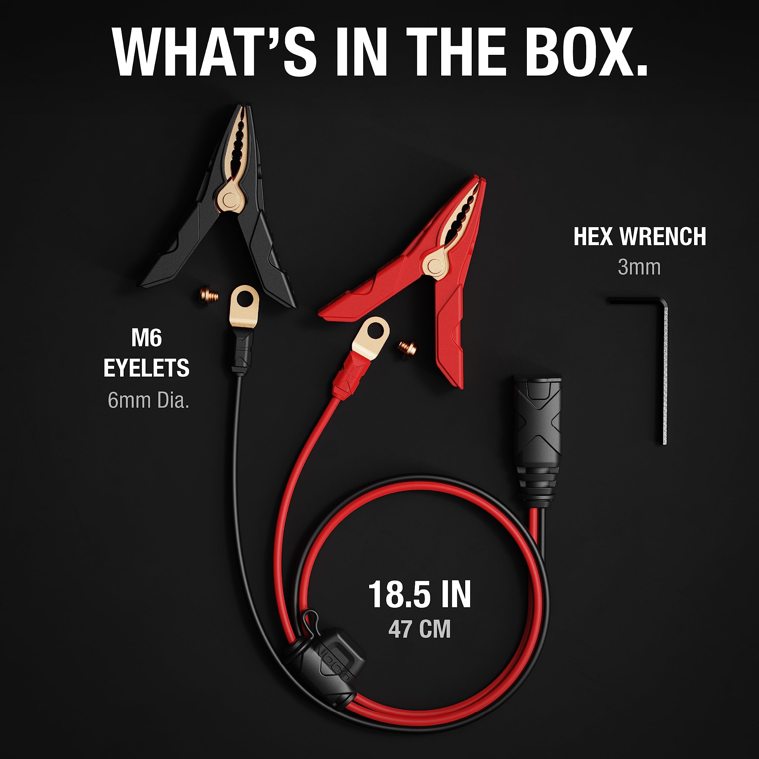 The GC001 X-Connect Battery Clamp Accessory is compatible with G750, G1100, G3500, G7200, and G4 chargers, as well as GENIUS1, GENIUS2, GENIUS2X2, GENIUS2X4, GENIUS5, and GENIUS10. It features high-output battery clamps with integrated M6 eyelet terminal connectors. Not compatible with NOCO Boost or Boost X UltraSafe Lithium Jump Starters.