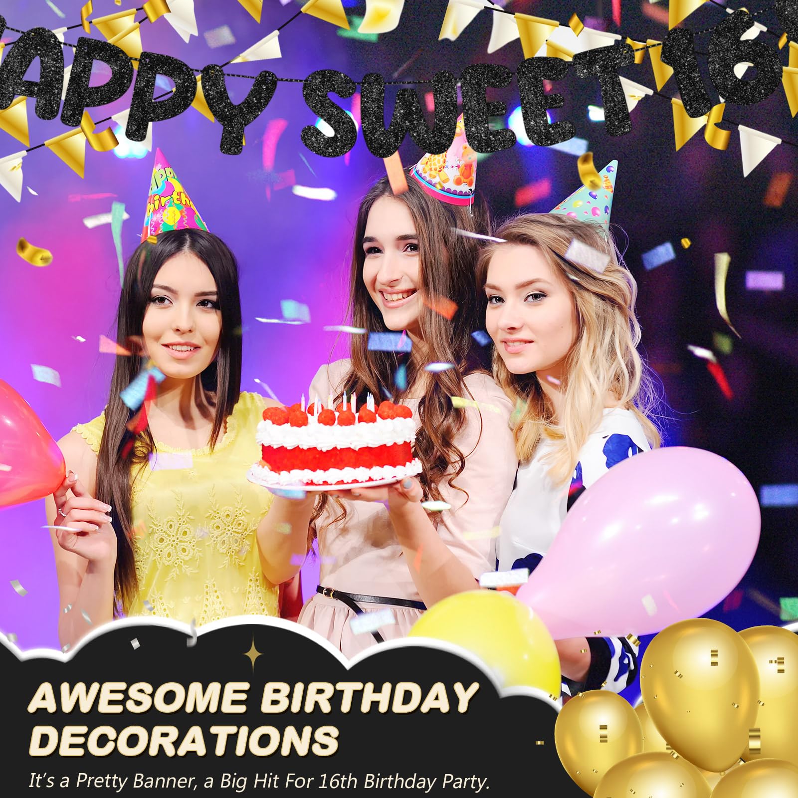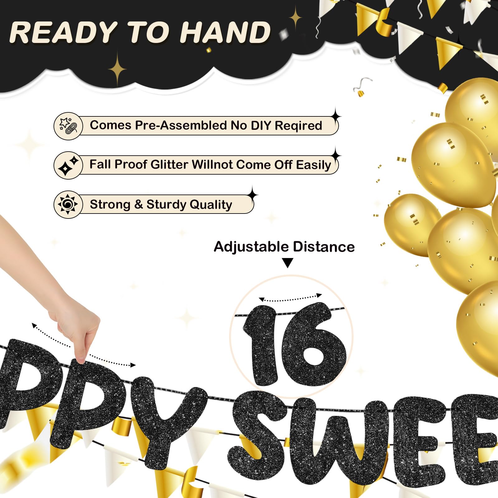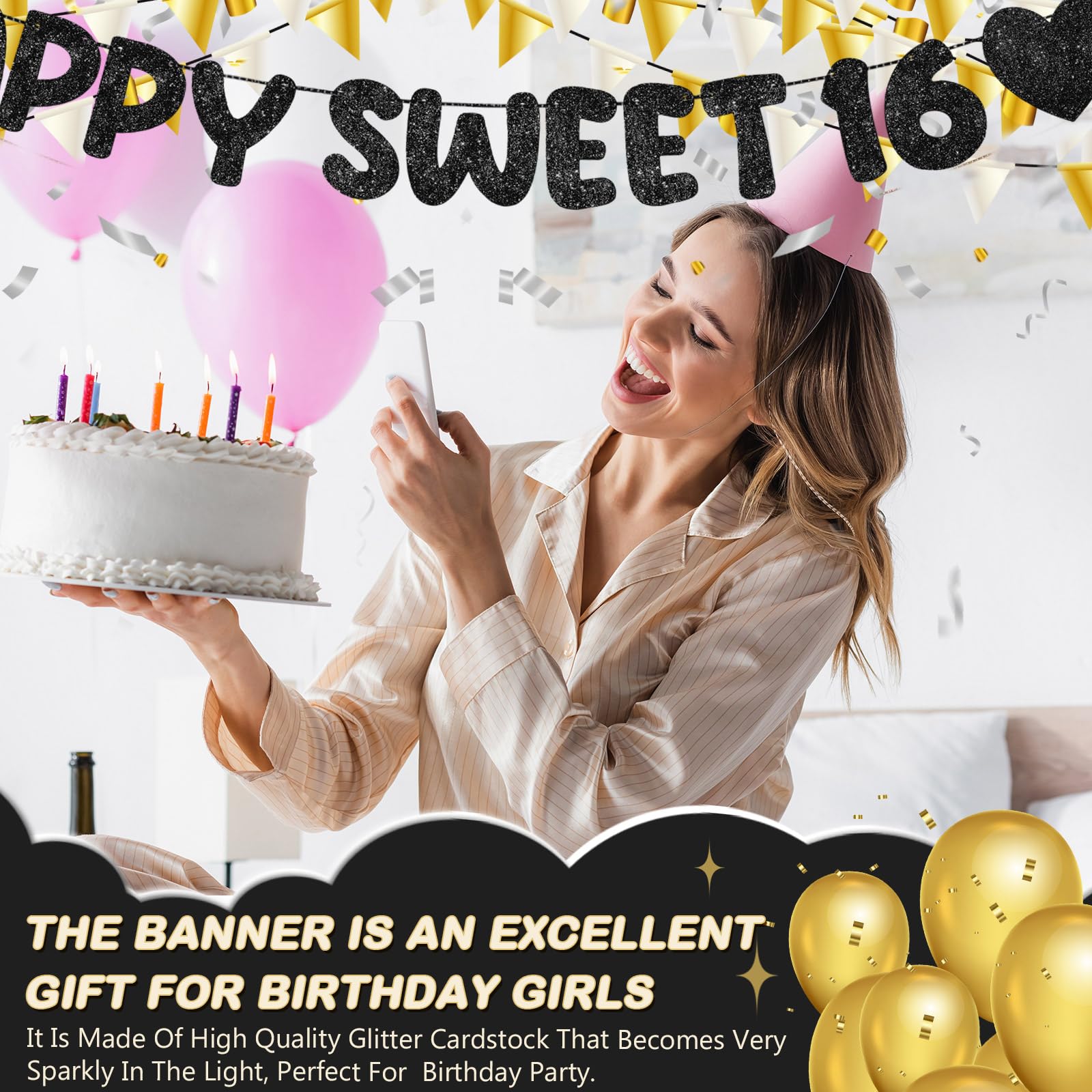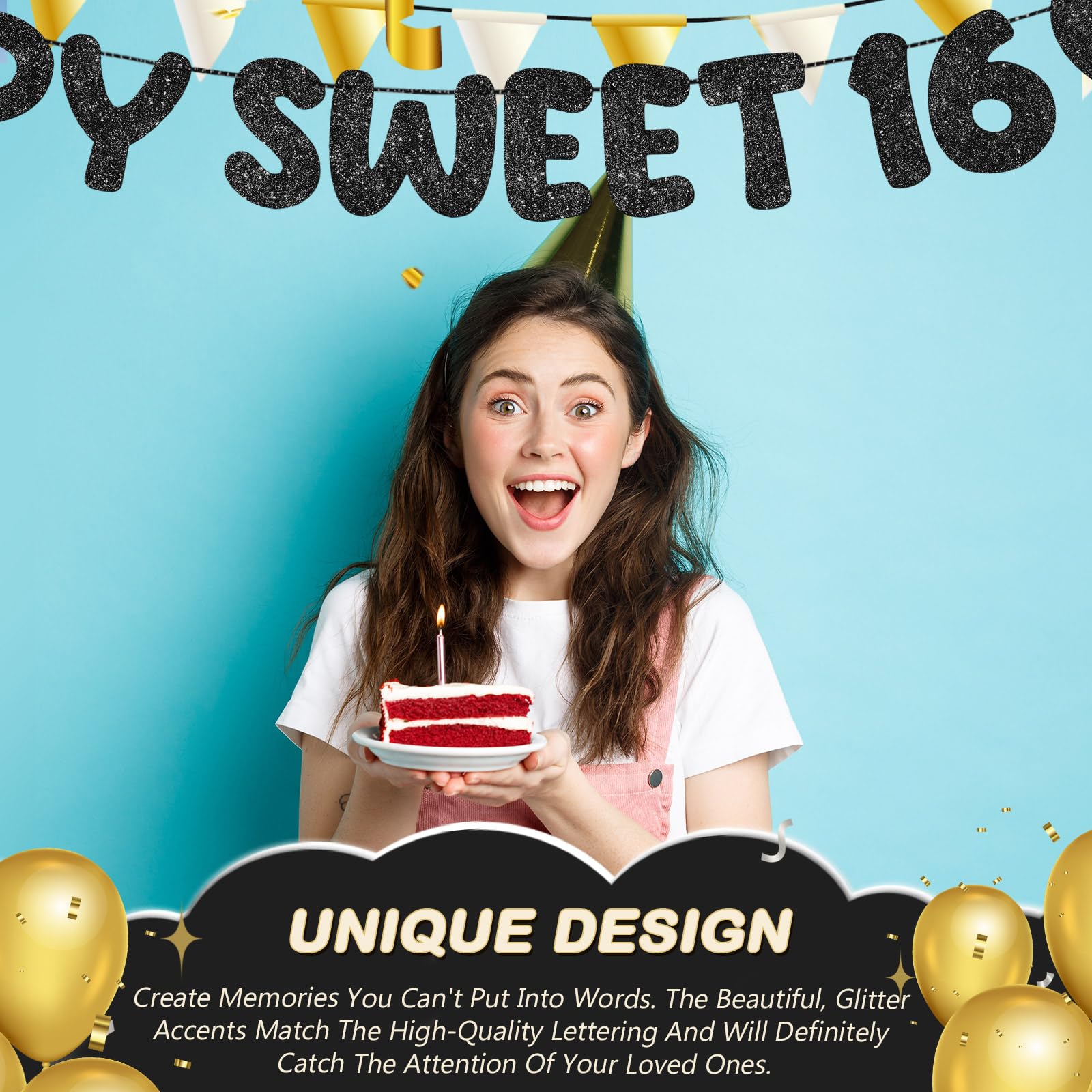 Exquisite Black Color: the tastefully chosen black color adds a balance of elegance and glam to your party decorations; Happy sweet 16 birthday banner symbolizes celebration, lending a charm to the birthday event; Its sophisticated color matches well with various party themes, leaving the guests in awe and significantly enhancing the celebratory atmosphere