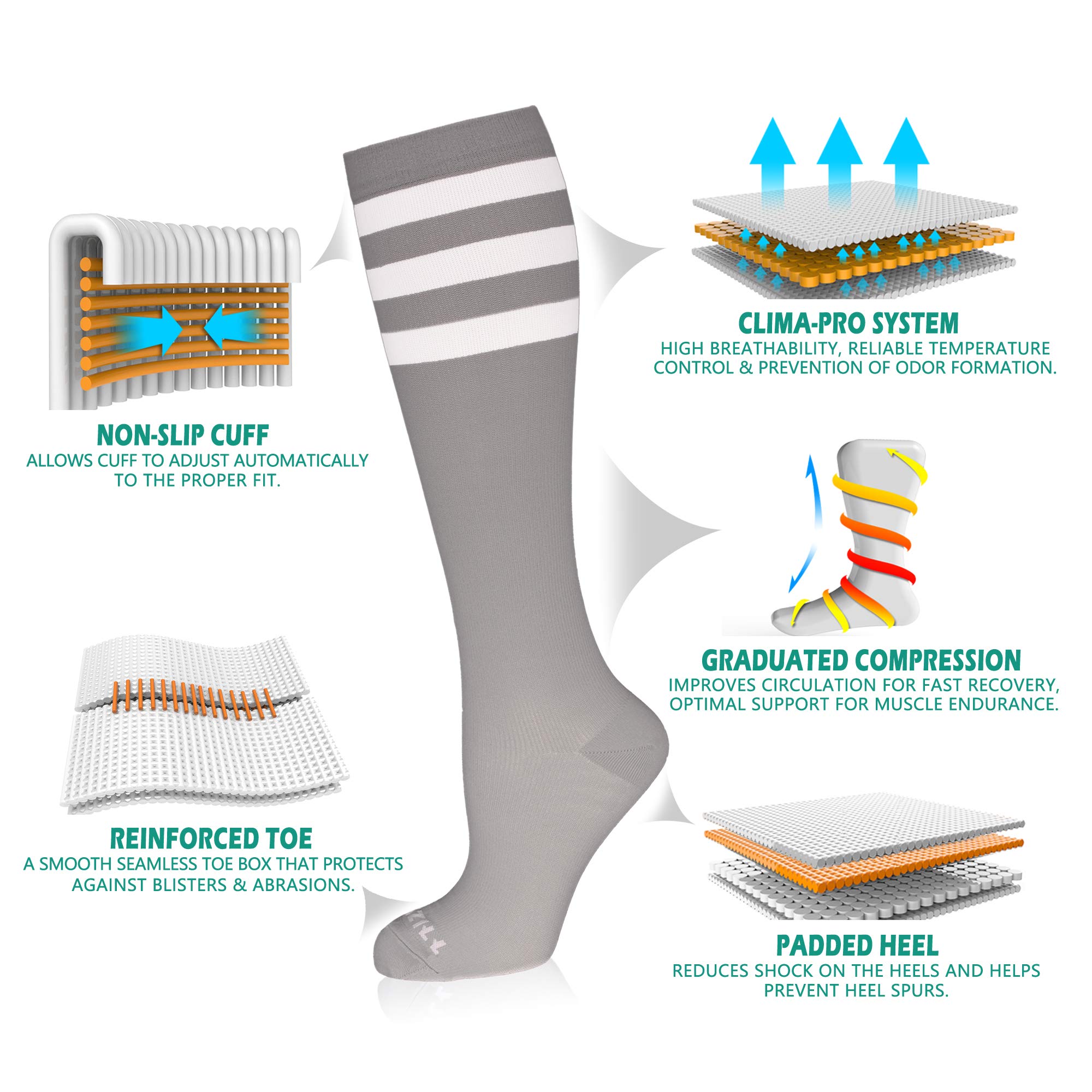 【IDEAL COMPRESSION SOCKS FOR ALL OCCASIONS】Our compression socks cater to a diverse range of needs from running nursing and traveling to sports like volleyball and basketball They also provide support for medical professionals pregnant women and individuals seeking comfort during travel or maternity With high-performance features our socks offer support and relief for both men and women across various occasions