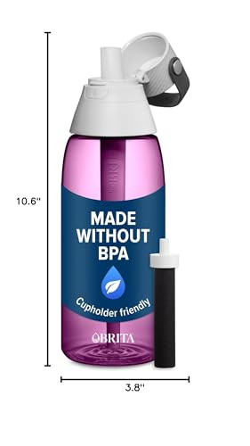 Drink healthier, great-tasting tap water with the BPA-free Brita Hard-Sided Plastic Premium Filtering Water Bottle. This filtered water bottle utilizes an activated carbon block filter to cut the taste and odor of chlorine and reduce particulates in water as you drink. You can replace 300 standard 16.9-oz. single-use plastic water bottles with just one water bottle filter. It's an easy way to stay hydrated, save money and reduce plastic waste. Created for effortless convenience, this water filter bottle features an enclosed, easy-sip straw, a built-in carrying loop for grab-and-go portability and a one-handed push-button lid. The bottle also has a leakproof design to help you avoid surprise drips and spills, and it's top rack dishwasher-safe for easy cleaning. This water bottle is compatible with Brita water bottle replacement filters, which should be changed every 40 gallons or about every two months. Get great taste, less waste and more savings from Brita.