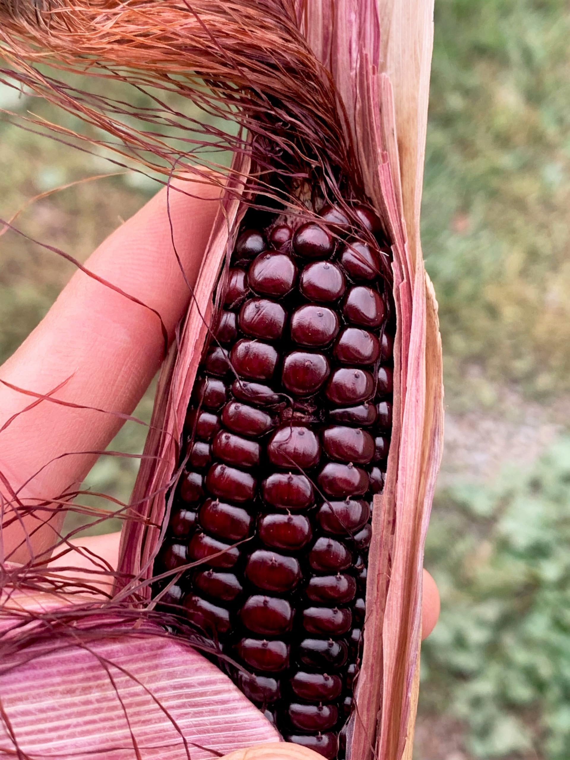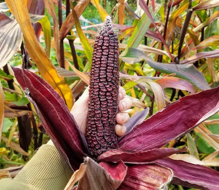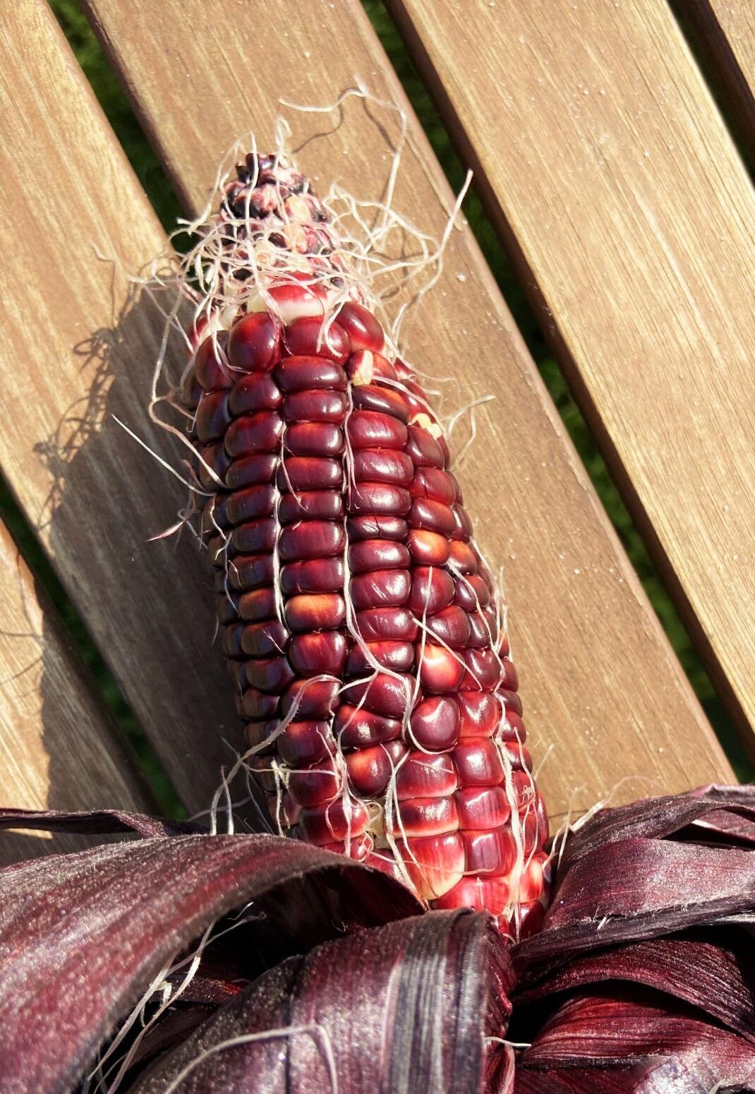 Double Red Sweet Corn boasts deeply rich burgundy-wine red kernels with dark-red-to-purple husks and stalks! This versatile variety bred by Dr. Alan Kapuler is very high in anthocyanins, which are antioxidants found in purple-colored superfoods with incredible nutritional benefits. Double Red grows 5-7-foot stalks with 7-8-inch ears that start out white with red dots and darken over time. Double Red ears can be eaten fresh or dried on the cob for use as ornamental corn for grinding into a uniquely purple-colored meal for cornbread, tortillas, and hominy. With its unique and rich coloration, Double Red Corn is the perfect addition to fall decorations, adding a touch of elegance and warmth to your outdoor spaces. Corn is one of the plants grown in the traditional Native American vegetable technique called the Three Sisters. The other two plants in the Three Sisters are beans and squash, and each has its role in the companion planting tradition. Corn serves as a support for the vining beans. Squash served as a ground cover, preventing weeds from growing. Beans provided natural fertilizer for all. Also Known As: Red Husk Corn, Purple Sweet Corn, Red Corn, Parching Corn, Red Dent Corn, White Dent Corn, Rainbow Corn, Native American Corn, Flint Corn, Indian Corn, Pole Corn, Maize, Maise, Calico Corn, Popcorn, Ornamental Corn, Decorative Corn.