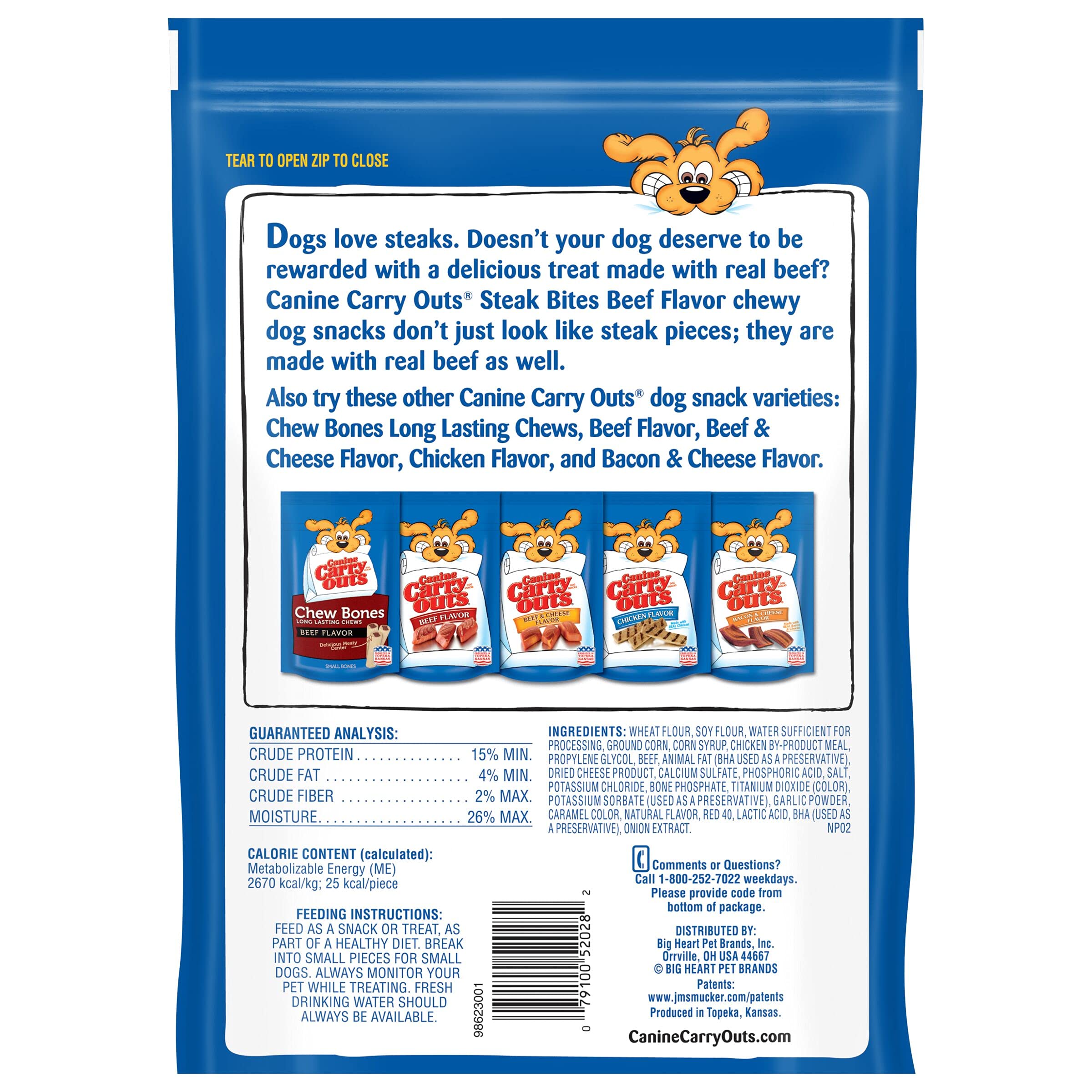 Contains one (1) 22.5-ounce bag of Canine Carry Outs Steak Bites Beef Flavor dog treats