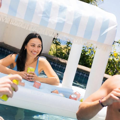 Introducing the FUNBOY Floating Cabana Bar – a must-have for outdoor enthusiasts and entertainers alike! Boasting an impressive length of nearly 6 feet, this versatile accessory adds a touch of fun to any outdoor gathering. Whether you're looking to create the ultimate floating drink station in the pool or elevate your table setup at the next outdoor party, the Floating Cabana Bar has got you covered. Featuring two drink stations that hold over 12 cans each and 4 central cup holders. Removable fabric shade lined with fringe augments any pool or backyard setting!