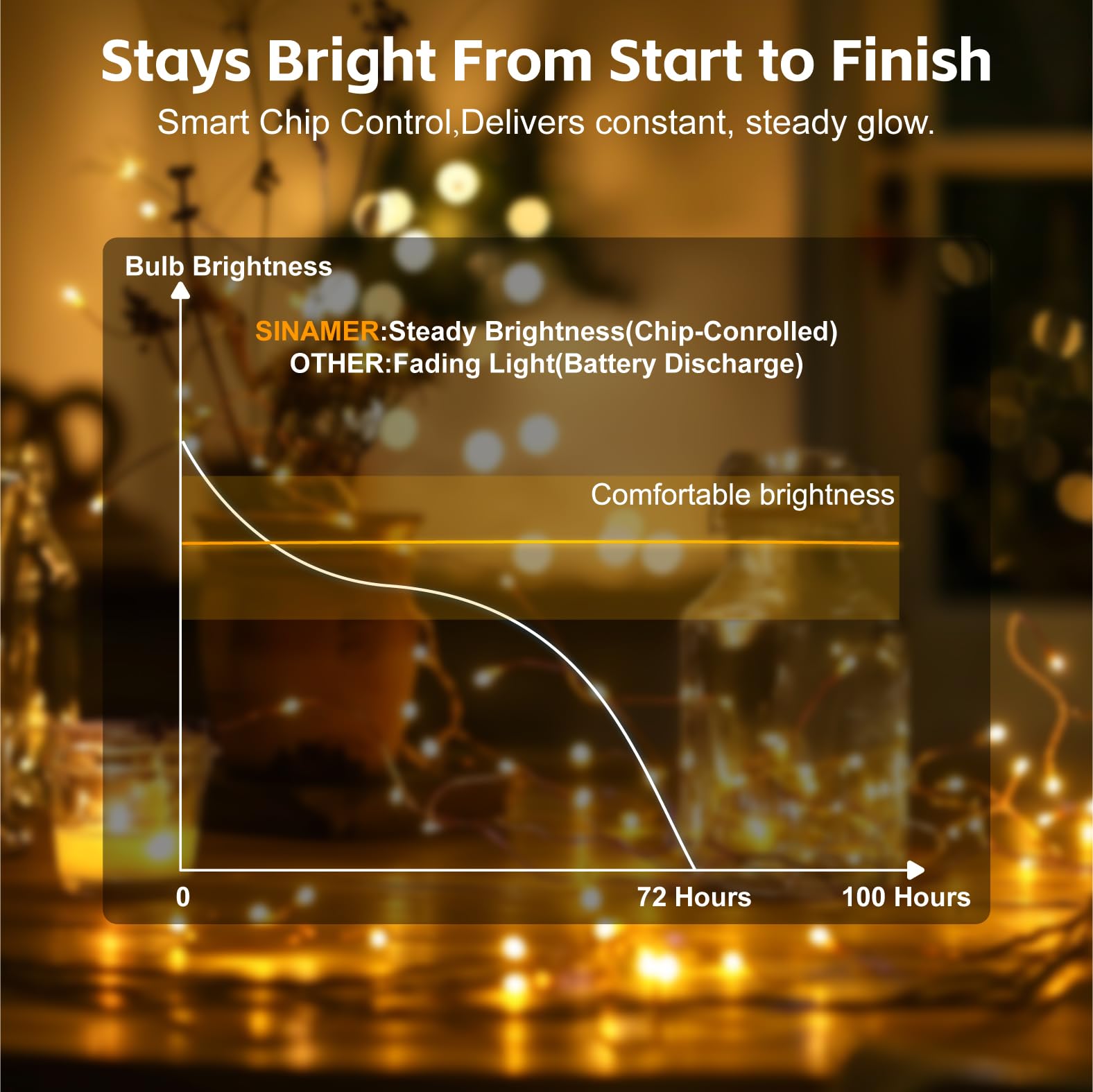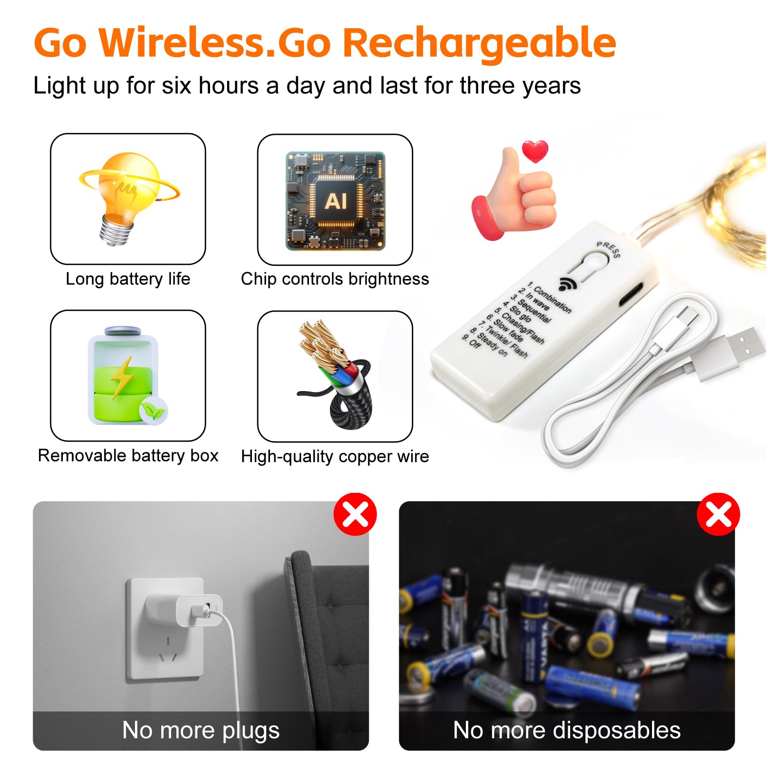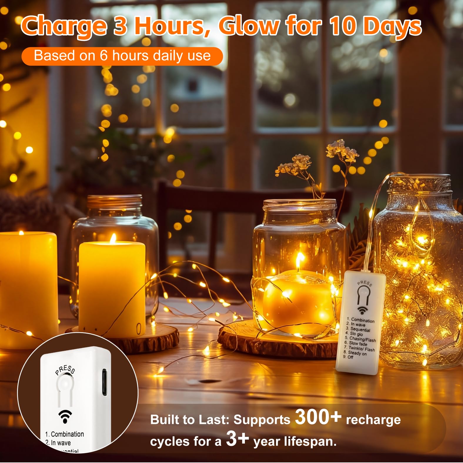 Rechargeable & Long-lasting: Enjoy up to 100 hours of continuous light on a single 2-hour charge (or enough for 7 days on a daily 5-hour use). The detachable battery box (300mAh) supports 300+ charge cycles for a 3-year lifespan. (Note: Please fully charge before first use)