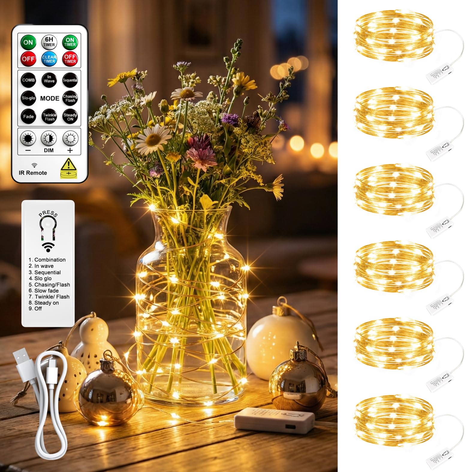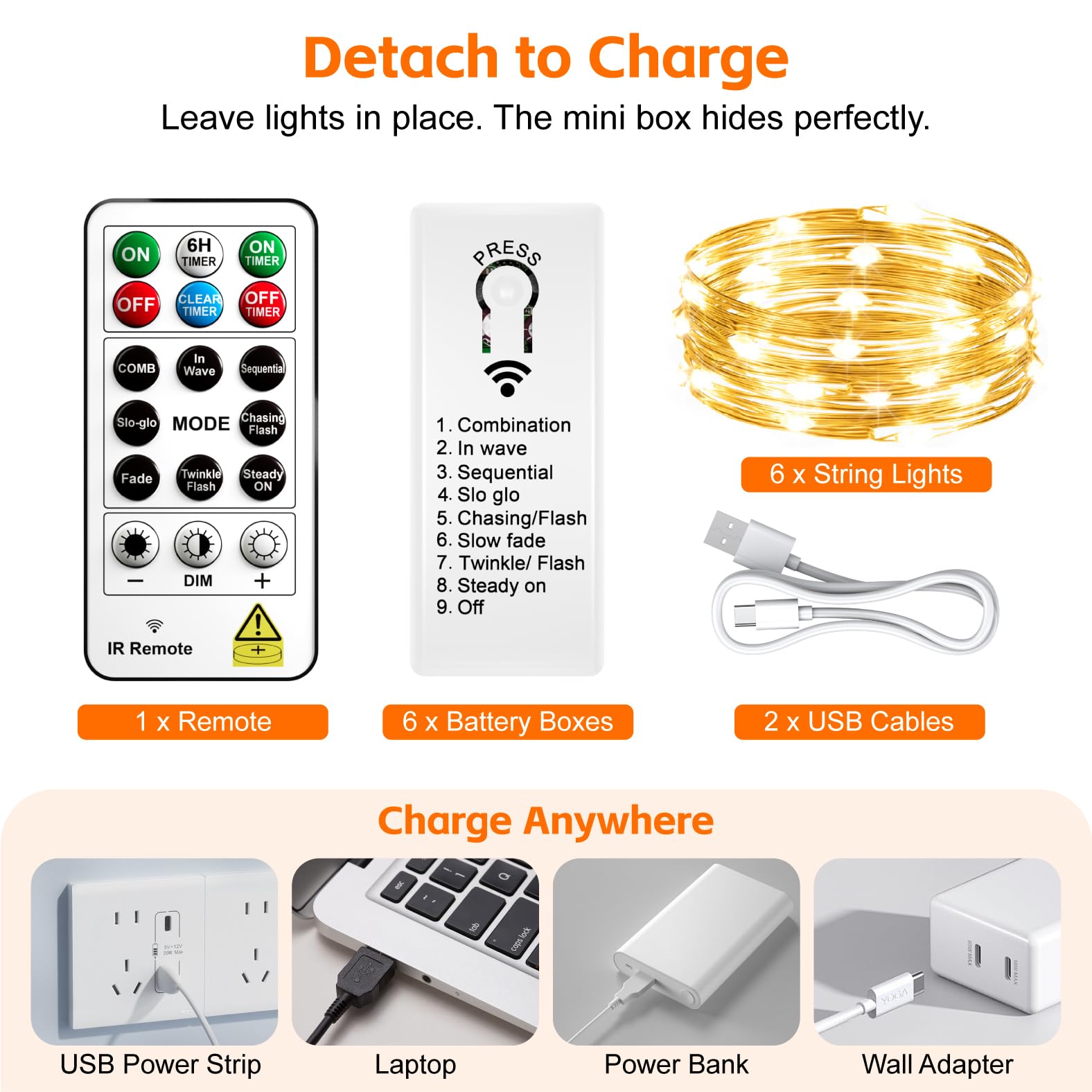Detachable Design for Easy Charging: The set includes 6x string lights, 6x rechargeable battery packs, 1x remote, and 2x USB cables. The unique detachable design lets you unplug the battery box to charge via USB (laptop/power bank) without messing up your decoration. The mini box is easy to hide for a clean look. Ready for Christmas, Diwali, or any special occasion.