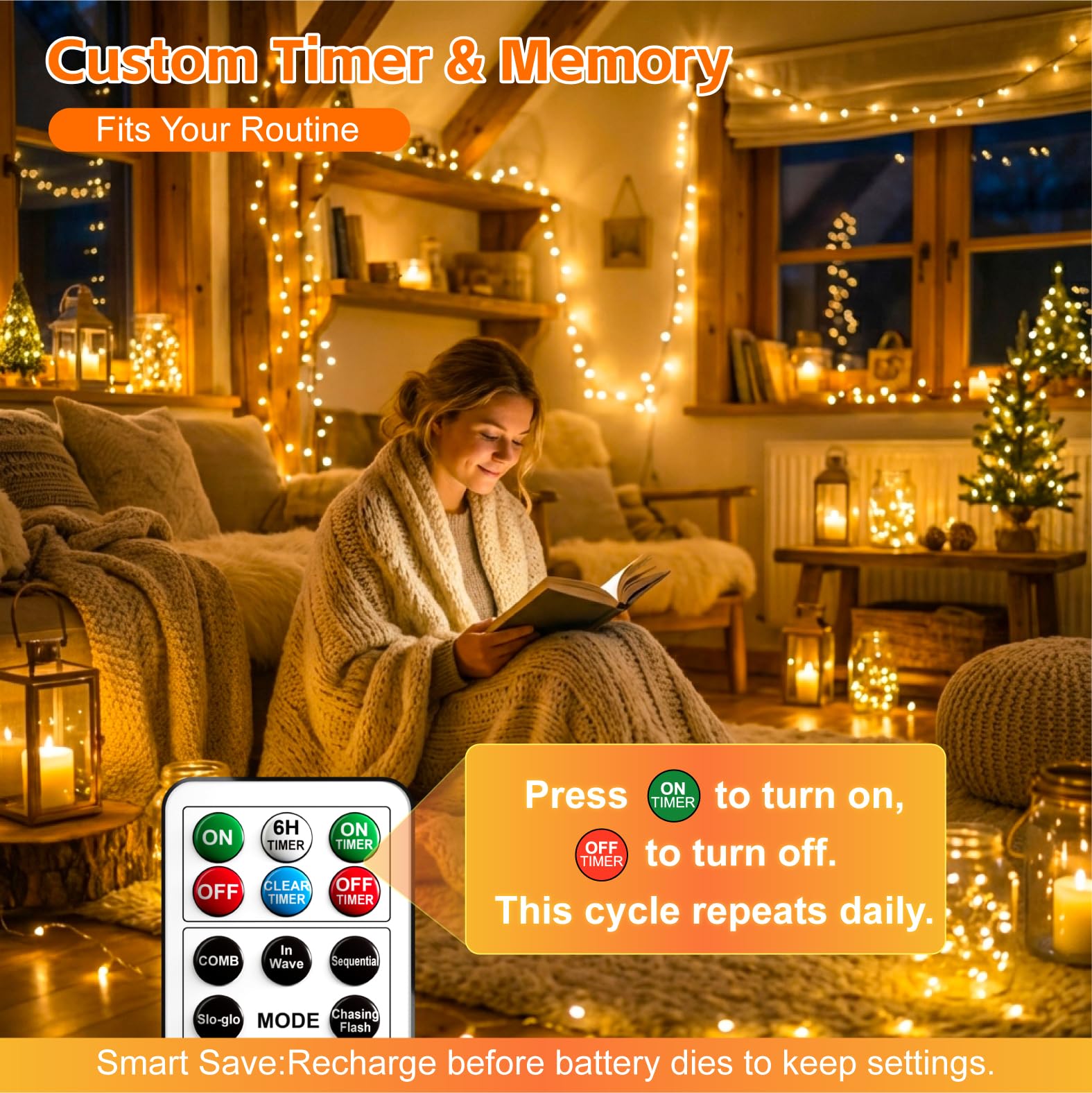 Custom Timer & Memory Function: Beyond the 6H fixed timer, our smart DIY timer lets you set the exact schedule you want—simply press "Timer ON" to start and "Timer OFF" to end. From the next day onward, the lights will automatically follow the same schedule. The built-in memory keeps your settings as long as you recharge before the battery runs out — no reset needed.