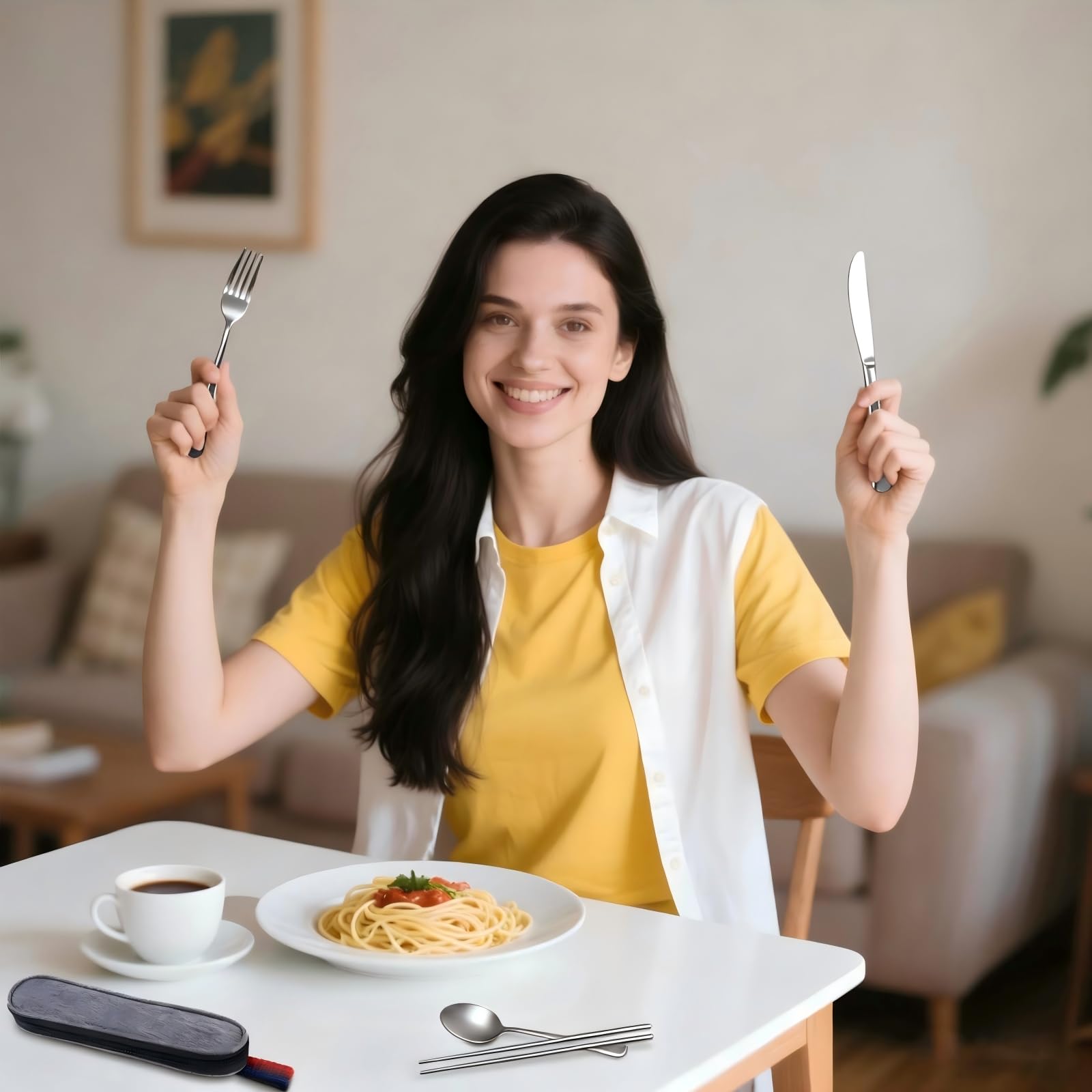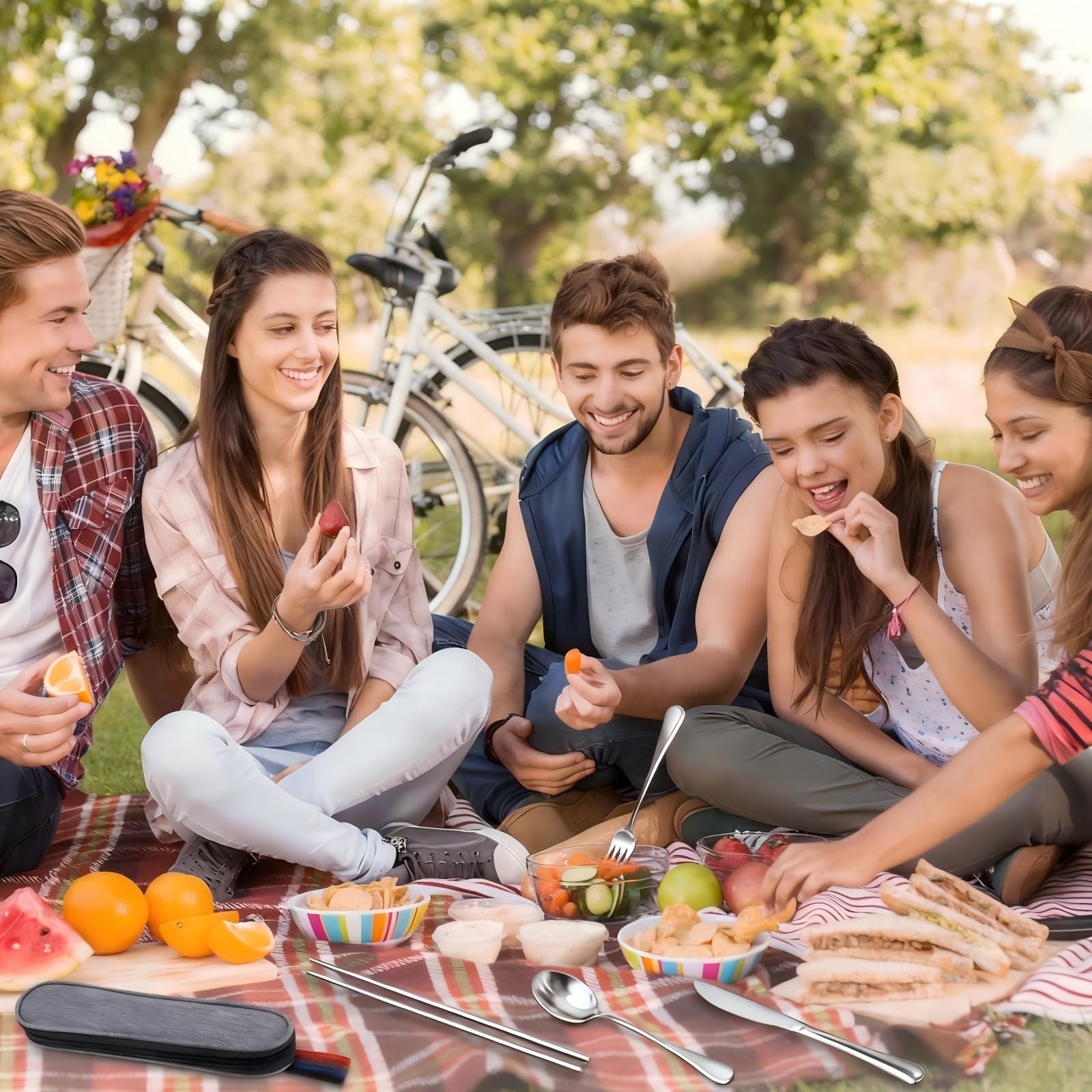 【Noiseless & Effortless Portability】 The upgraded carry case comes with an elastic band to stabilize utensils, eliminating annoying clattering during travel. Its compact design fits seamlessly into lunch bags or backpacks, making on-the-go dining convenient