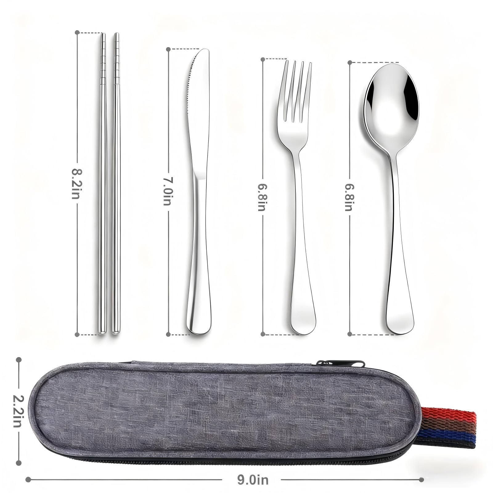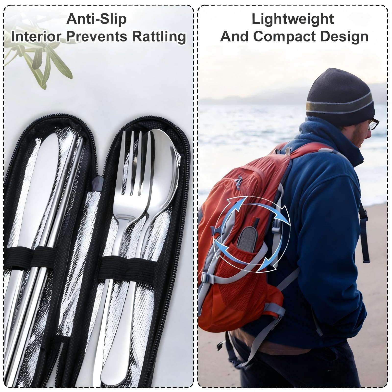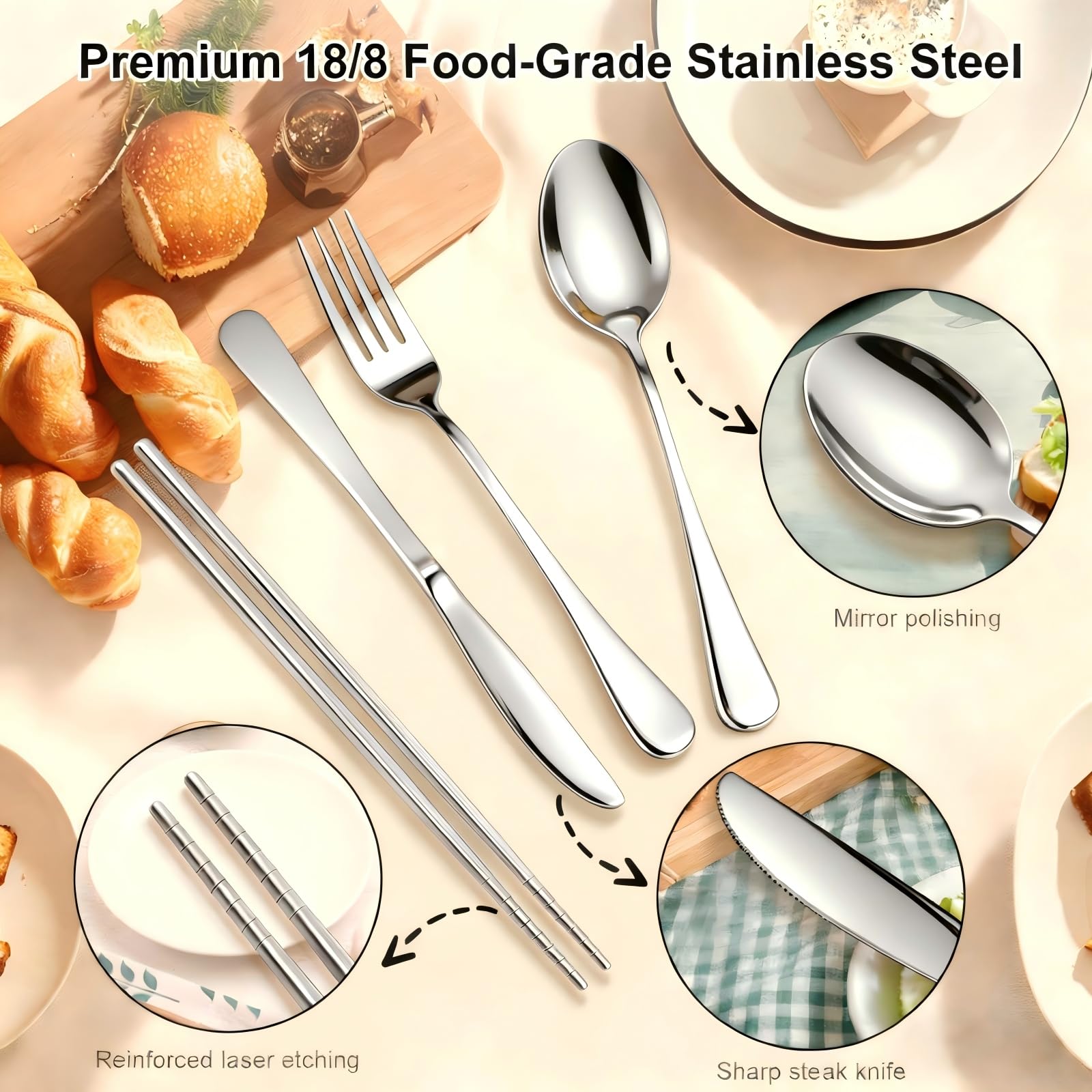 【What You Get】The 5-piece travel cutlery set includes dinner knife, fork, spoon, chopsticks, and premium carrying case. Plus, enjoy peace of mind with long-term support - we'll resolve any issues within 24 hours