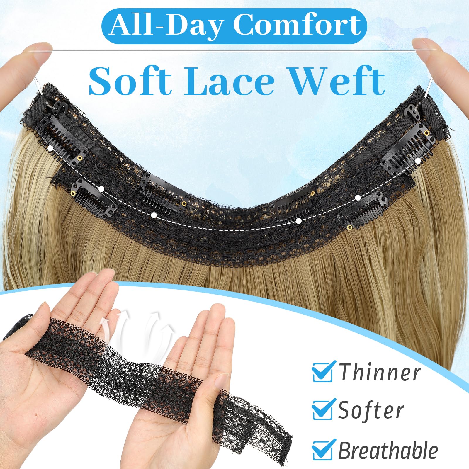 【Easy to Wear】Just 3 steps increase your hair volume quickly.Separate your hair above your ears, about 1-1.5 inches from your hairline, and leave it on top;Place the hooks in different positions to adjust the size to your head, then place the extensions with the wire in the back;Place 4 clips onto the hair for further security, then release the top of the hair;Finally, Use your own hair to hide the wire.