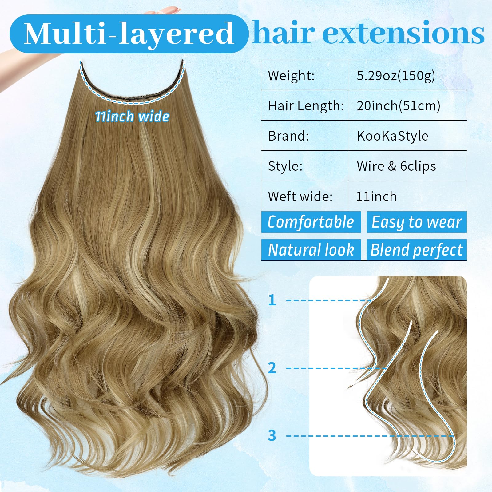 【Get Layered Hair In Seconds】 Invisible wire hair extensions is the easiest and quickest tool for adding volume and length. Anyone can do it!KooKaStyle invisible wire hair extensions with new upgrade!Thinner&softer&Breathable double weft,lighter&fluffier Synthetic heat-resisting fiber,Make it perfectly blend with our hair and create a hair salon effect at home.