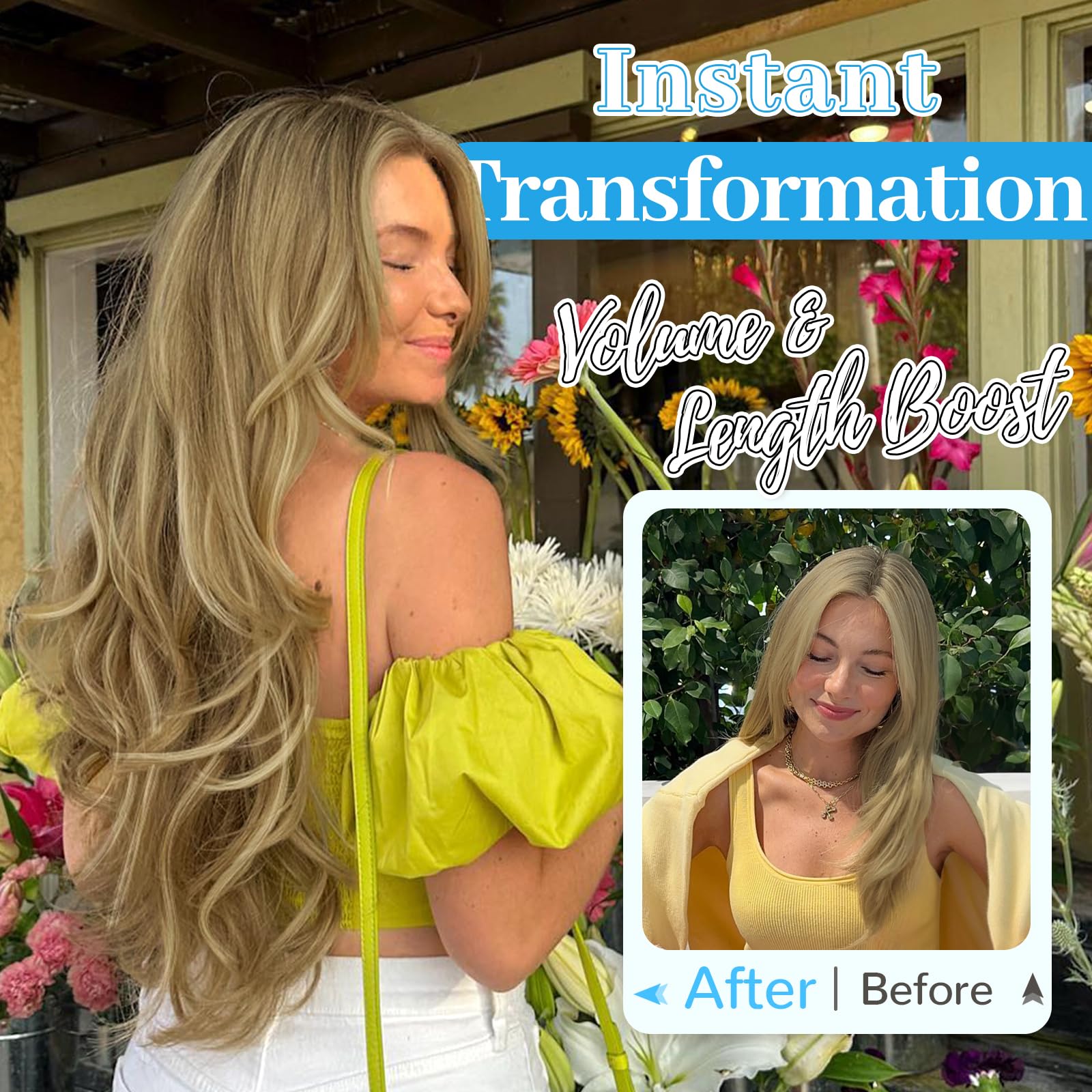 【User-centered Design】Designed for fragile hair, in addition to four Secure clips, we have added two more Secure clips to evenly distribute them.At the same time, we have widened the double weft, truly achieving full coverage of hair.Make your hair look natural and fluffy at any angle.