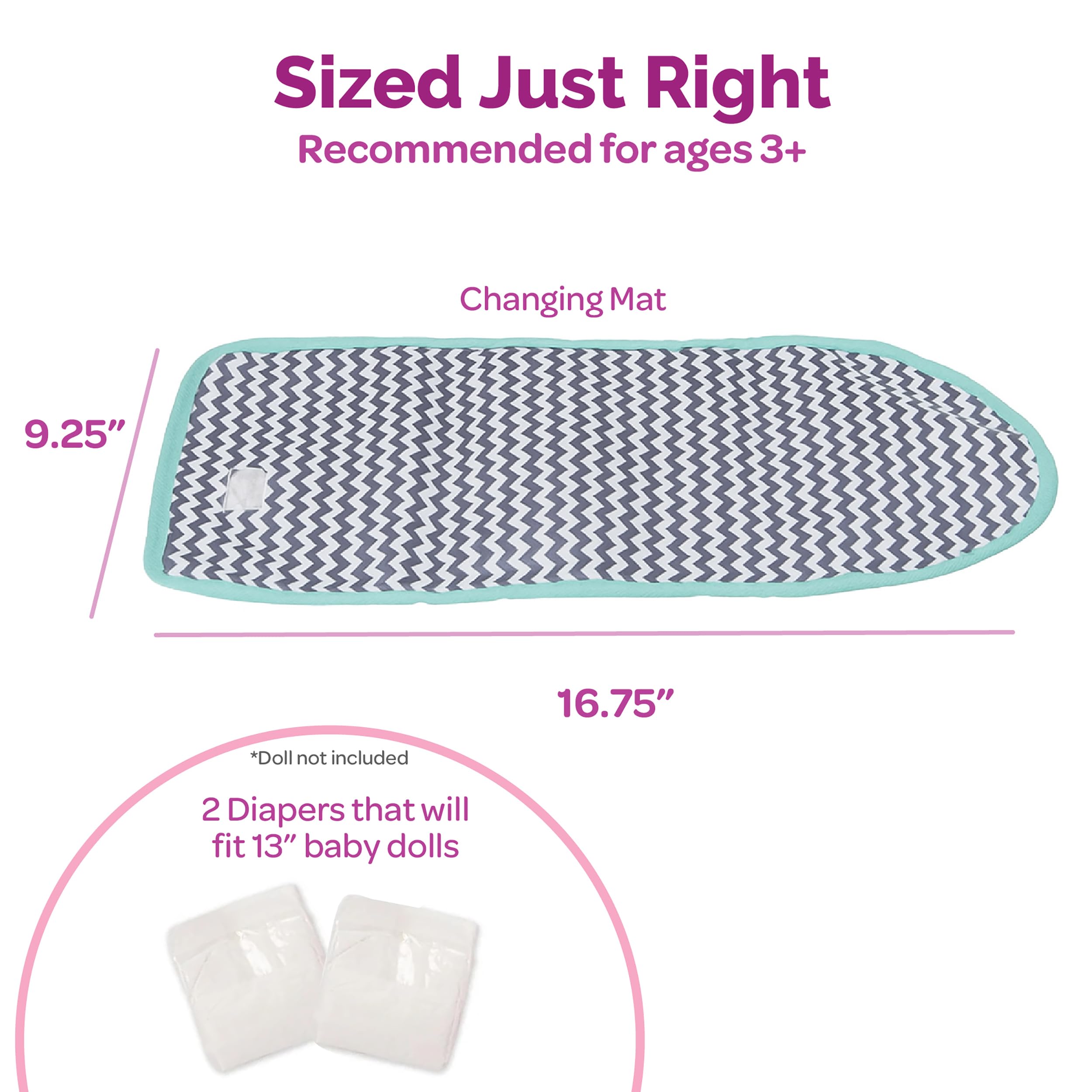 Whatβs Included: A changing pad for easy and comfortable diaper changes on the go and 2 Diapers, perfectly sized for your child's favorite doll (fits up to 13β), ensuring they are always prepared for any adventure.