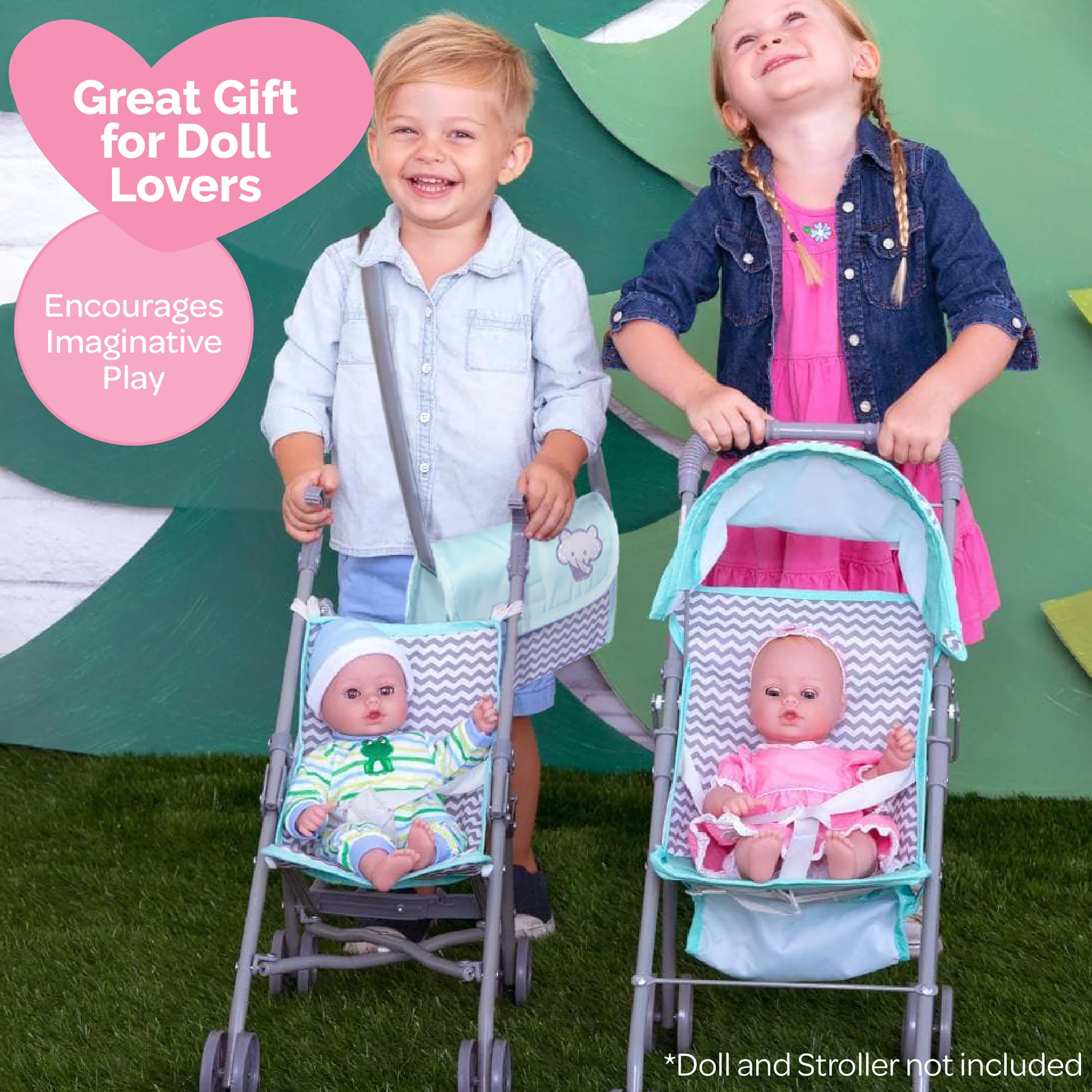 Packing for a quick stroll or a road trip? You need your diaper bag! Adora's Zig Zag diaper bag is a must-have accessory for boys & girls, This baby doll diaper bag features an attractive gender-neutral zig zag design in cool mint, white & gray and comes with a diaper bag with a strap, a matching changing mat, and 2 diapers that can fit up to 13-inch baby dolls like our ADORAble BathTime Babies and PlayTime collection! The diaper bag has a cute embroidered elephant face, and a Velcro flap that is easy to open & close for the little hands. It even has a sturdy strap that is perfect for slinging over the shoulder, so your little ones can carry and bring the diaper bag without hassle! Itβs a perfect doll accessory set for all the kids on the go! Encourage interactive, nurturing, pretend play with this ADORAble Zig Zag diaper bag! Ages 3 and up.