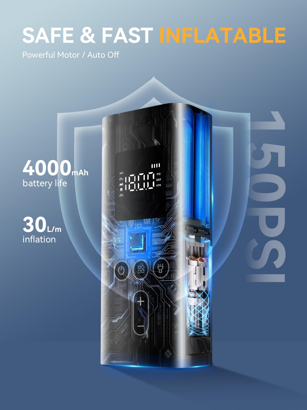 Fast Inflation for On-the-Go Drivers:Say goodbye to waiting. Whether you're a busy commuter or a weekend adventurer, the AIRSURE portable tire inflator for car delivers fast inflation up to 150 PSI, 3X faster than traditional inflators, saving time when it matters most. It’s the must-have rechargeable tire inflator for flat-tire emergencies, daily checks, or spontaneous road trips