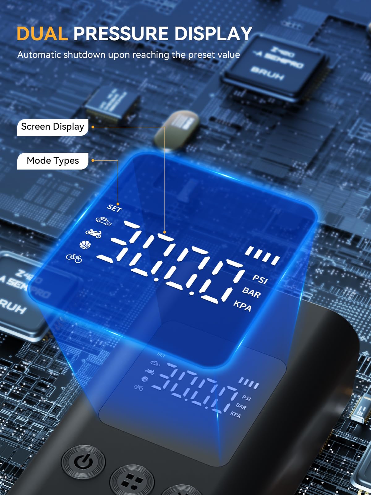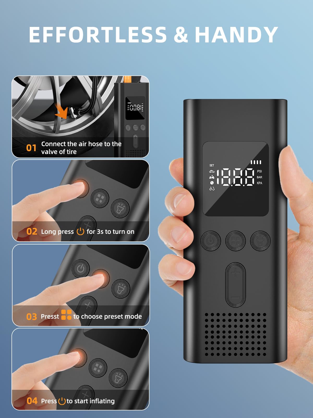 4 Smart Inflation Modes: The upgraded air pump for car tires offers 4 preset modes for car, motorcycle, bicycle, ball and comes with 4 nozzle attachments to handle it all. Short press the mode button and long press the mode button to choose your preferred pressure unit in PSI, KPA, BAR, KG/CM² according to your needs