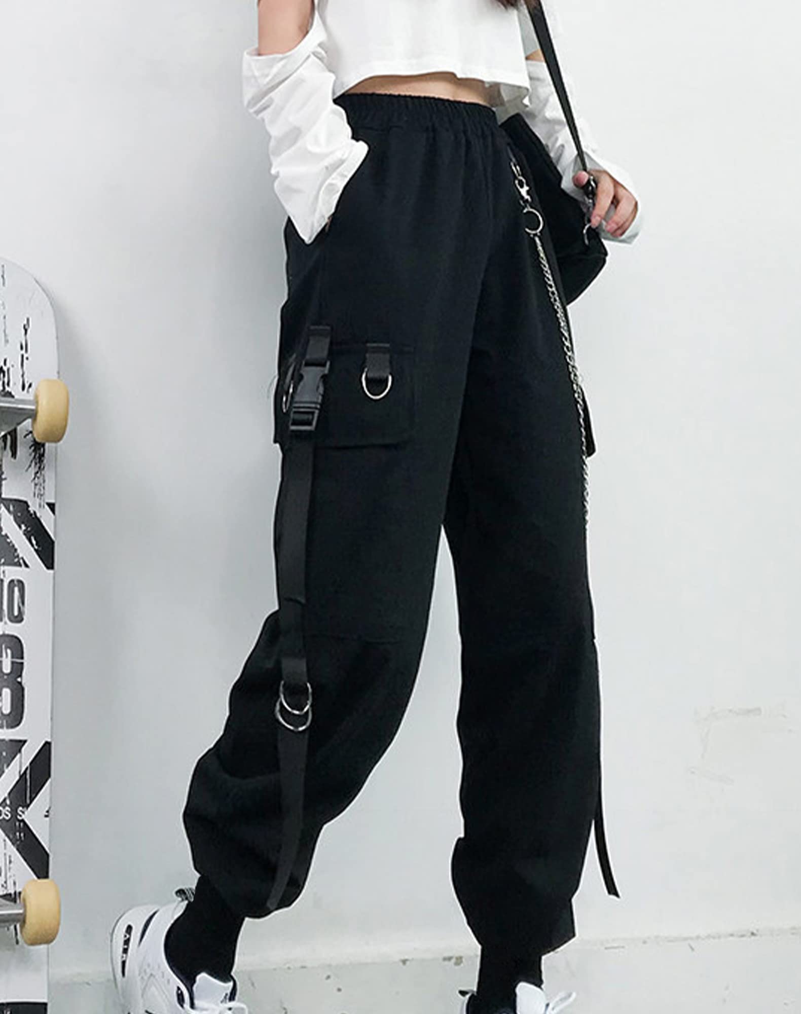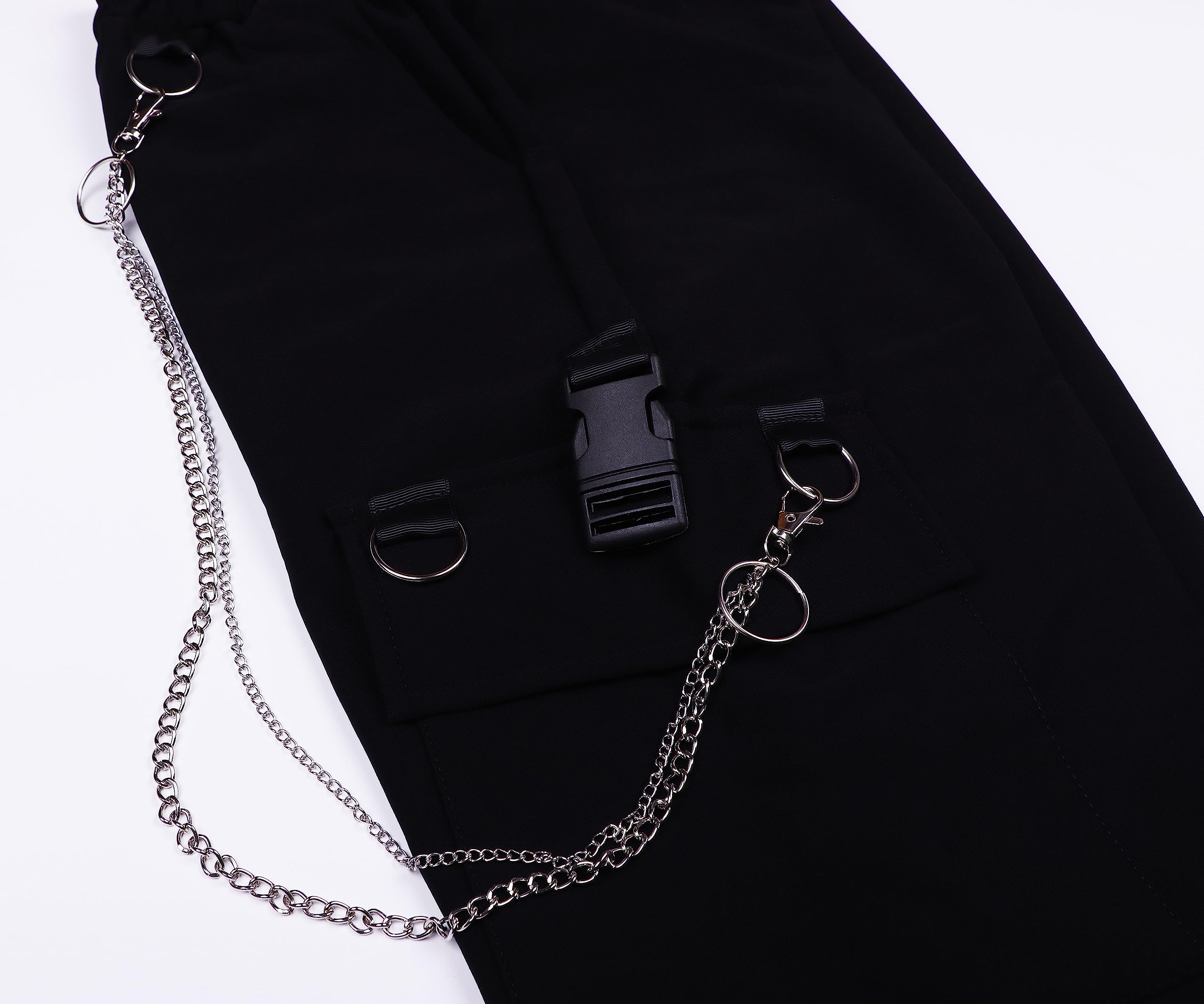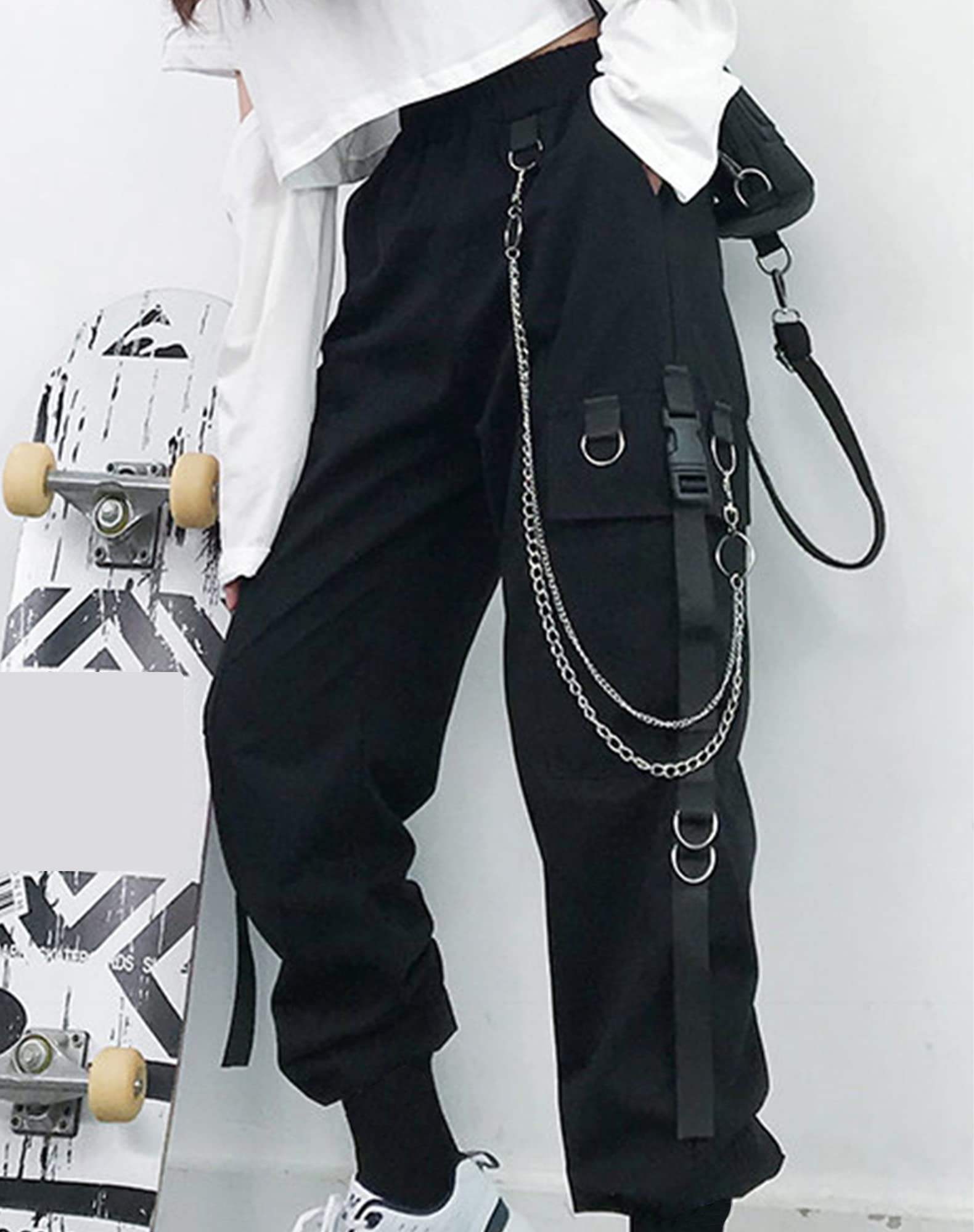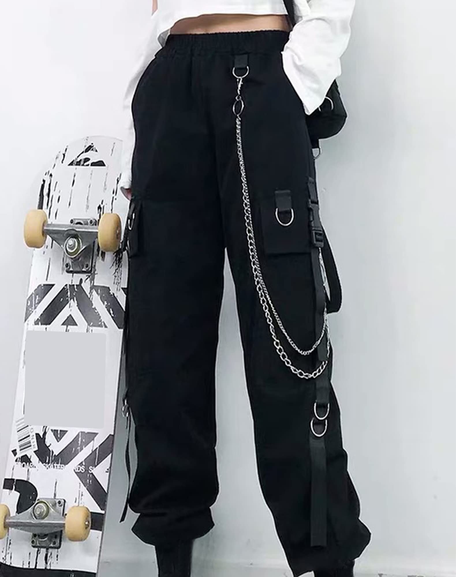 [Feature] High waisted cargo pants with chain, streetwear pants for women. The high waist overalls design with wide legs shows off your figure and creates a sexy and trendy look. The elastic waist ensures a perfect fit, and the multiple pockets provide ample storage space. Put on these emo pants and embrace a cooler and casual style