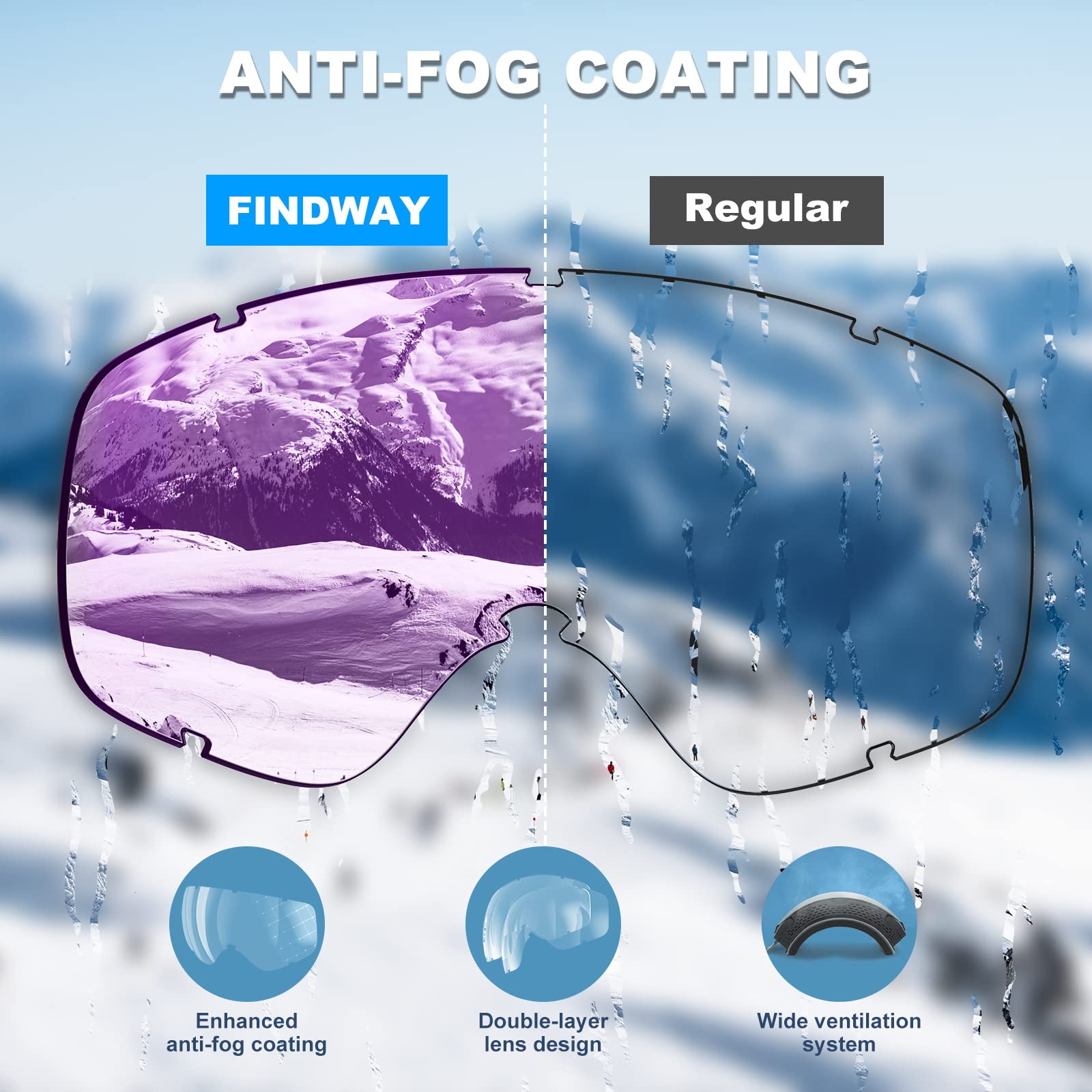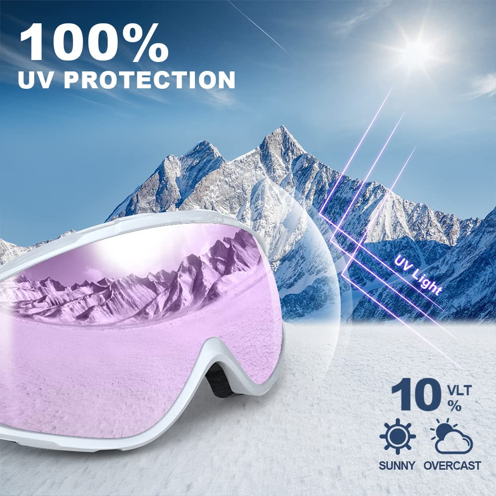 【Performance Double Lens】-Anti-scratch,anti-fog,impact resistance,full face real revo mirror coating reflective lens,100% UV protection,more solid & durable than others ski goggles.The inner lens made by Italy with PRO long-lasting anti fog performance materials,working with ventilation system.NO fogging up when skiing or snowboarding.Great optical clarity spherical lens and frameless design create a super wide HD vision.