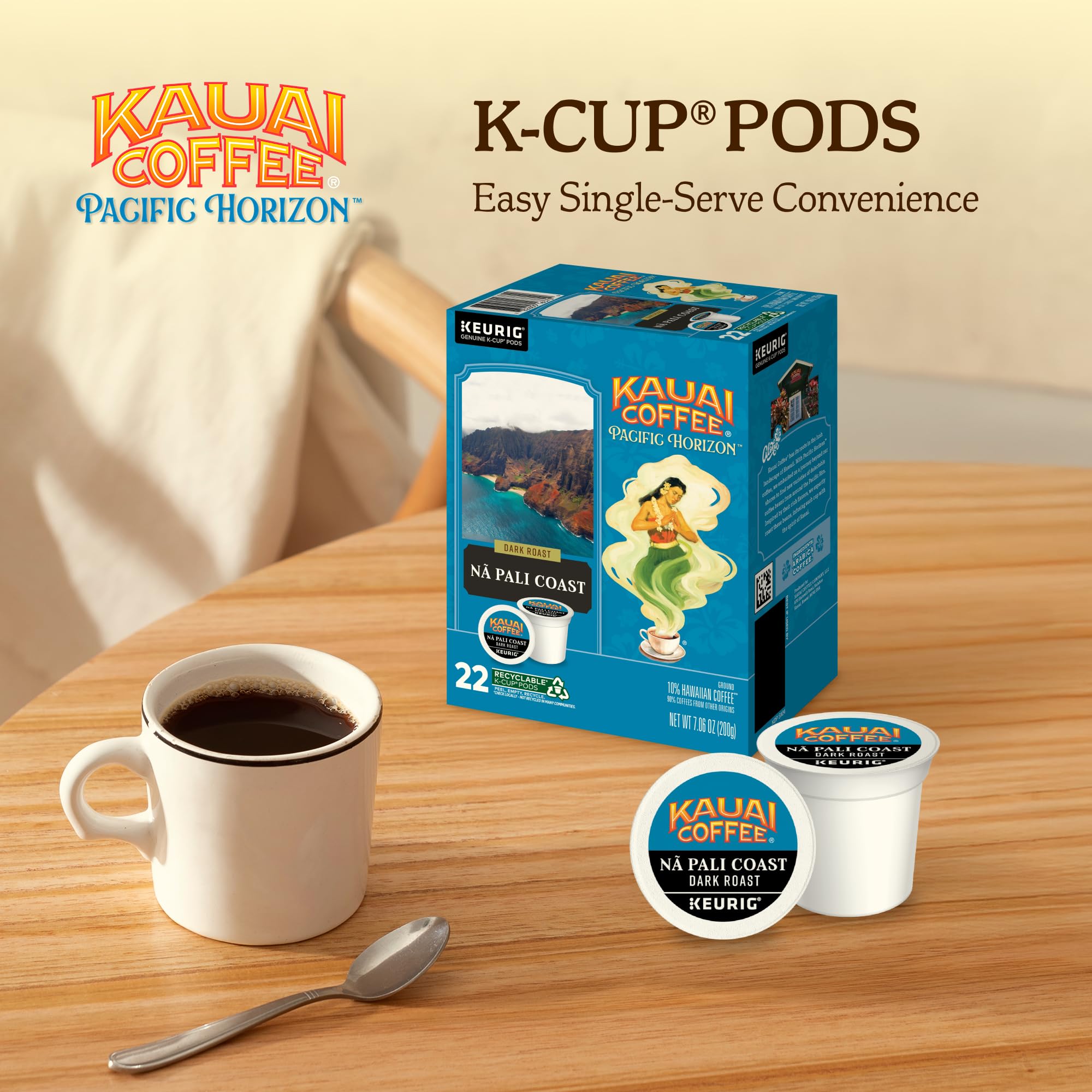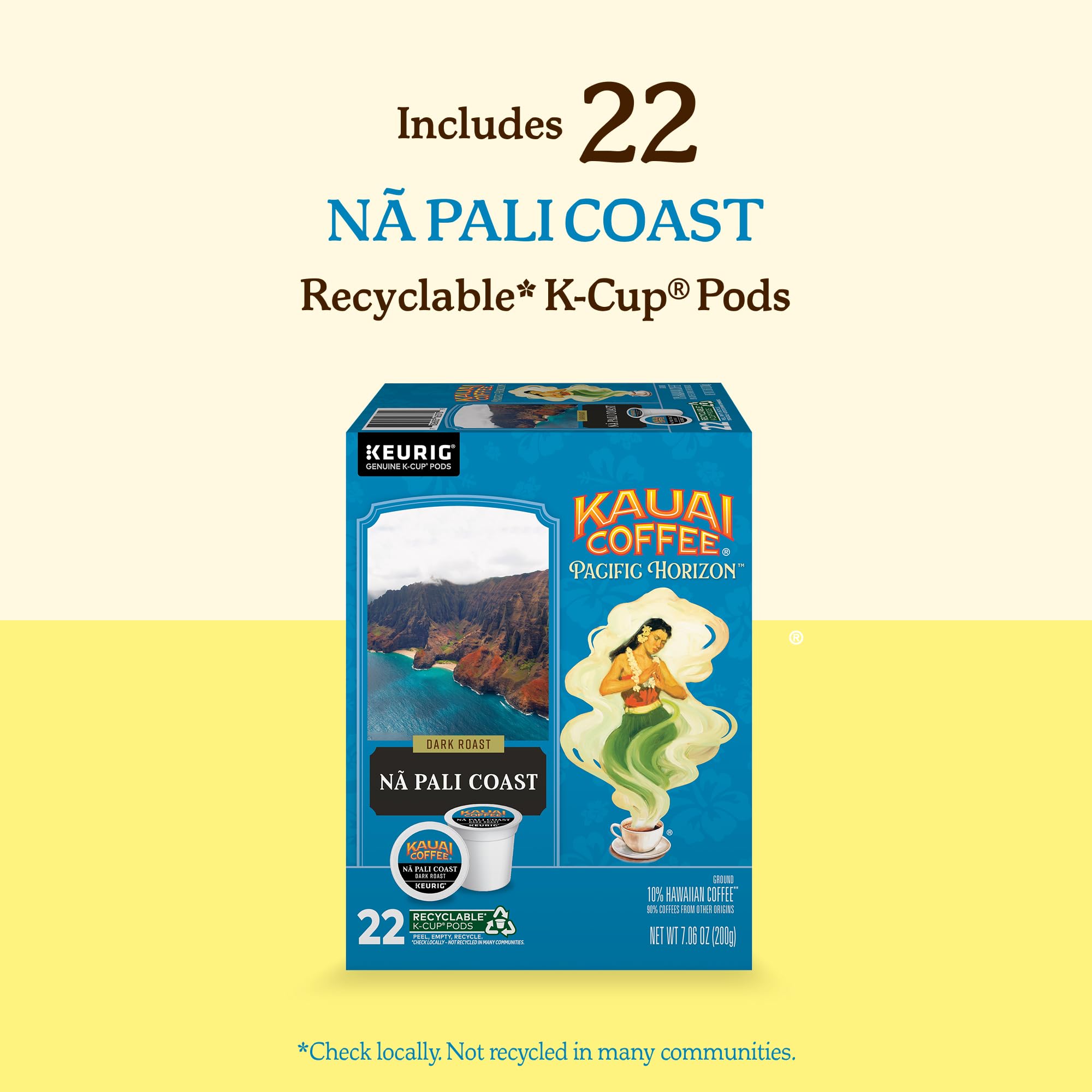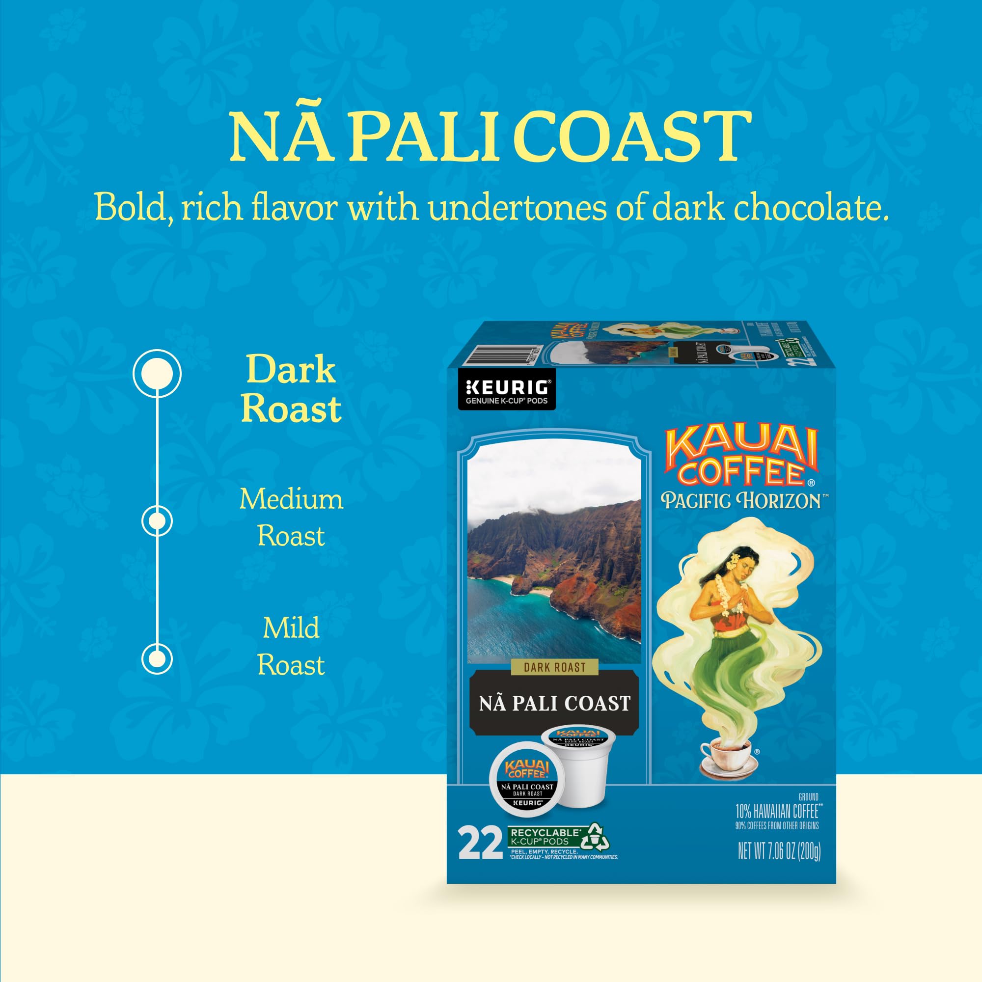 Discover the tropical delight of Kauai Coffee Na Pali Coast Dark Roast, a unique coffee experience with a vivid aroma of nutty notes and sweet chocolate overtones. Made with 10% Hawaiian-origin Arabica beans sourced from the fertile volcanic soil of Kauai, this coffee delivers a rich and flavorful cup without bitterness. Ideal for single serve coffee enthusiasts, these coffee pods are made for Keurig coffee makers, bringing you a taste of paradise with every cup. Kauai Coffee offers a smooth coffee experience, perfect for those seeking a balance between bold and mild flavors. Whether you're starting your day or enjoying an afternoon treat, Kauai Coffee will transport you to Hawaii’s largest coffee estate. Choose a more eco-friendly way to enjoy your coffee with our recyclable pods but make sure to check locally, not recycled in many communities, as recycling options may vary. The Kauai Coffee dedication to quality is evident in each cup, ensuring a consistent and satisfying brew made with Arabica coffee. Enhance your coffee ritual with the best coffee that not only provides exceptional taste but also contributes to sustainable practices. Embrace the spirit of the island and indulge in an experience that invigorates your senses and elevates your day with its decadent flavor.