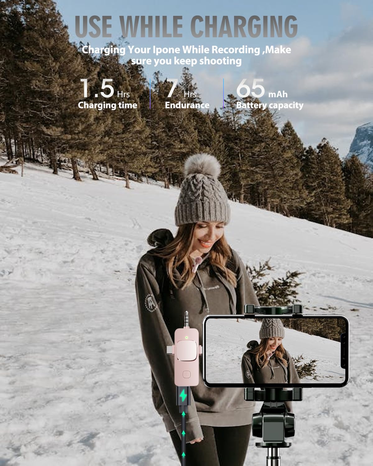 Long-Lasting Battery Life: The wireless lavalier microphone is built in 65MAH, Can work continuously for up to 7 hours. The receiver is powered by your device and can be charged at the same time. Powerful endurance to help you complete a variety of scenes of dynamic shooting, cell phone recording, short video production.