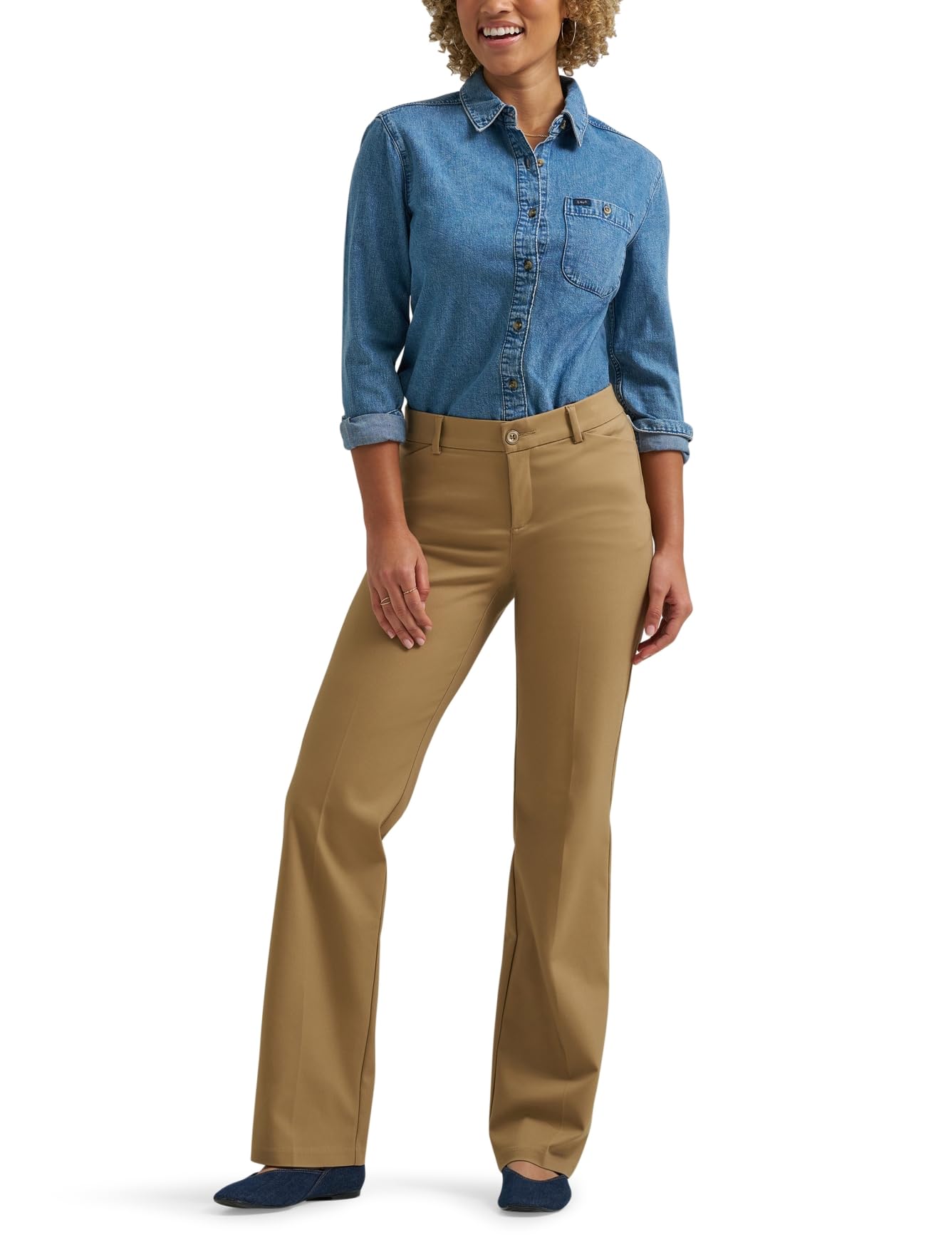 REGULAR FIT. With a regular fit and mid rise, these pants are a work-wear must. These women's trousers have a flexible non-binding waistband for all-day comfort.